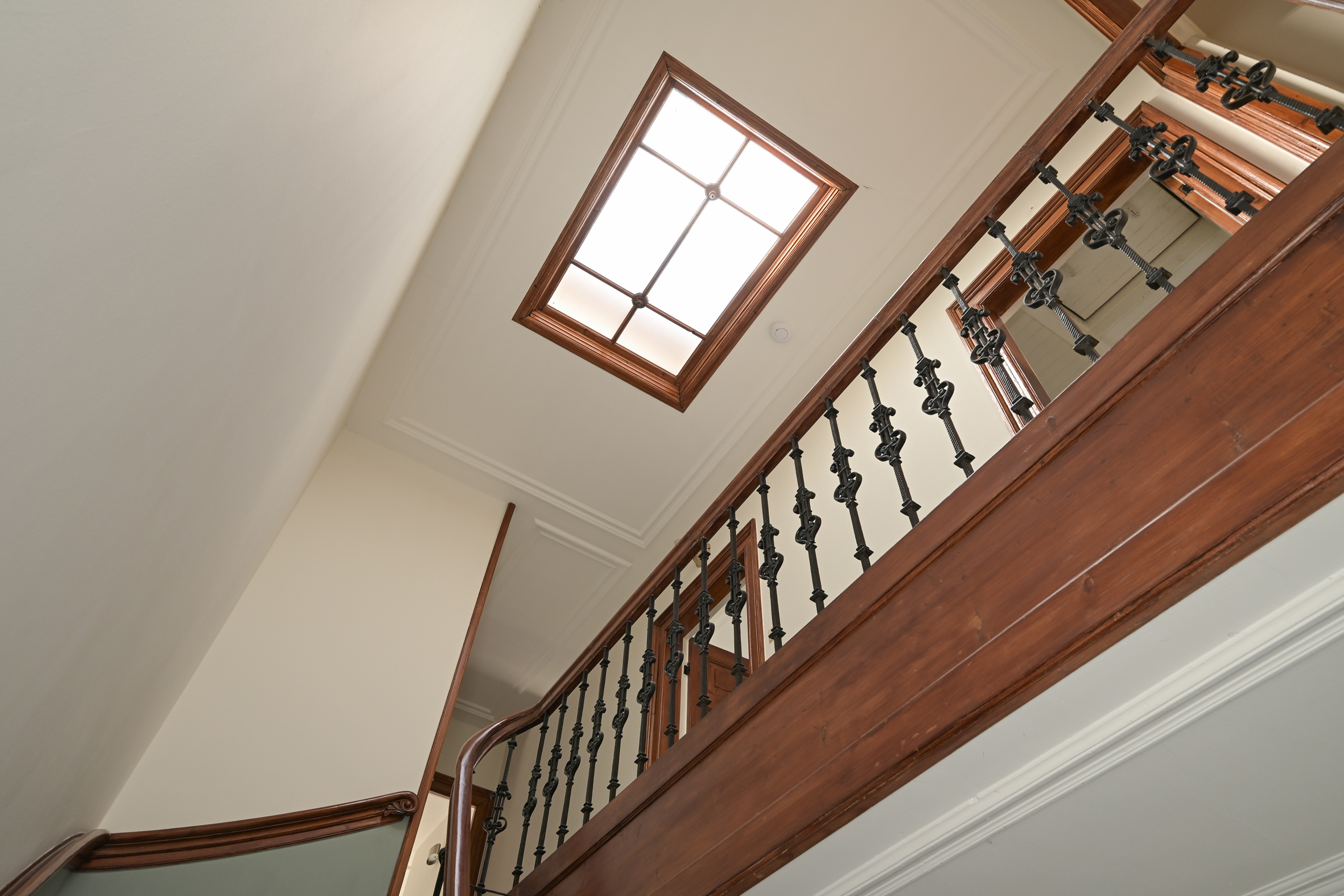 At the top of the stairs is a landing with a separate modern wc. There is a large front room with an unimpeded view and a back room with access to a balcony, both with high moulded ceilings, marble mantels, and fitted wardrobes. A third room, currently in use as a walk-in closet, could function as a study or extra bedroom. The complete modern bathroom, with bath, walk-in shower, double vanity, and heated floors is accessible from both the landing and the back bedroom.