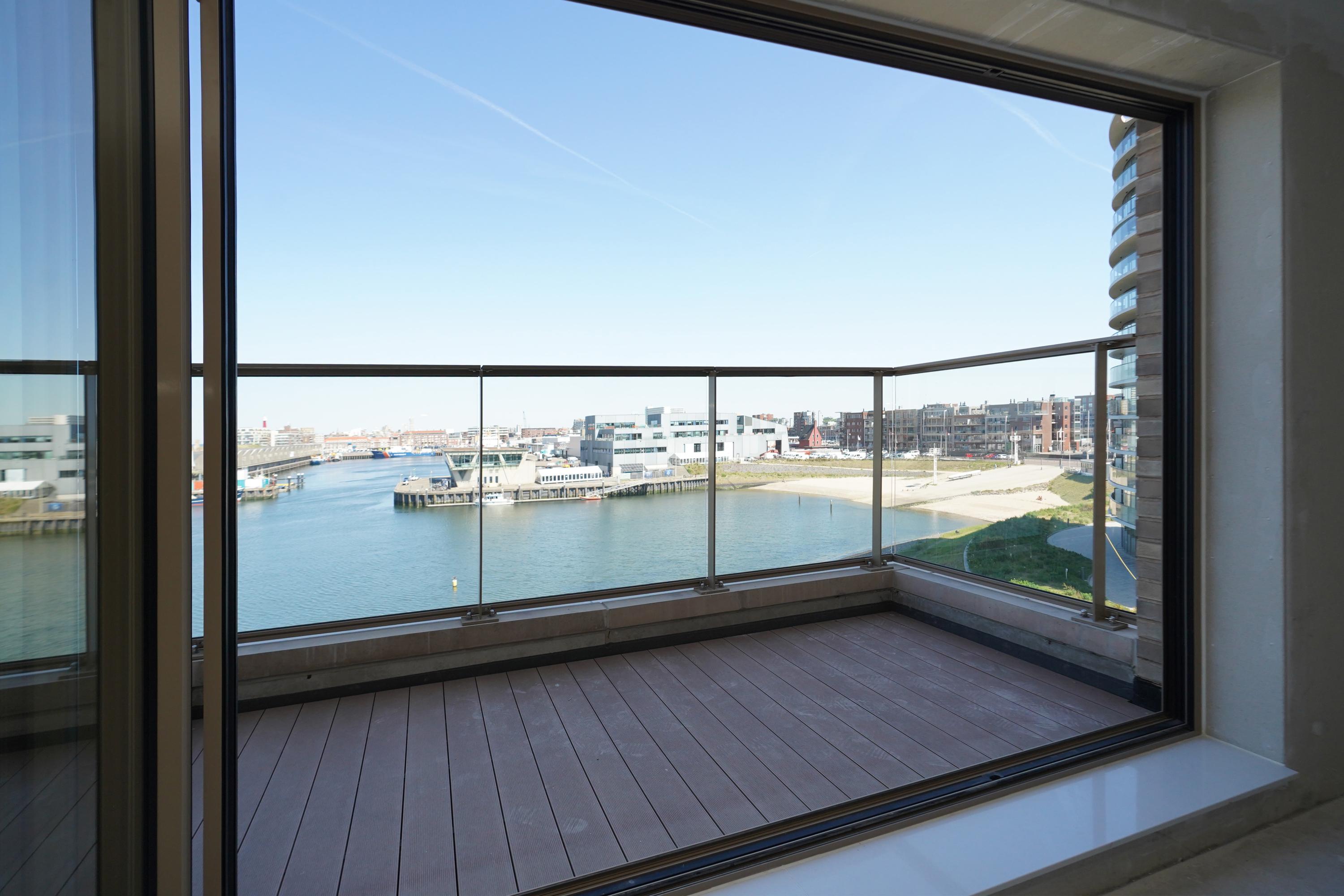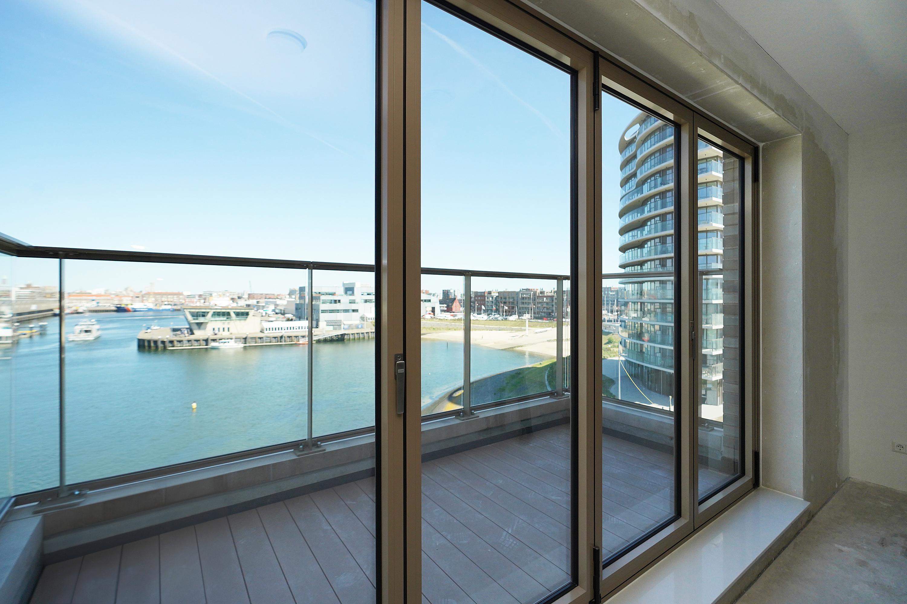 Entrance, hall, modern toilet, modern bathroom with a walk-in shower, washbasin with vanity unit, and towel radiator (Duravit sanitary ware), integrated technical room/storage with a heat pump, ventilation system, and washer/dryer connections. The spacious living room on the harbor side offers a phenomenal view thanks to large windows and the folding/sliding door to the balcony. From the living room and balcony, you have views of the Scheveningen harbor and the sea, a lively view that never gets boring with the arriving and departing fishing boats, pleasure yachts, and numerous water sports enthusiasts.