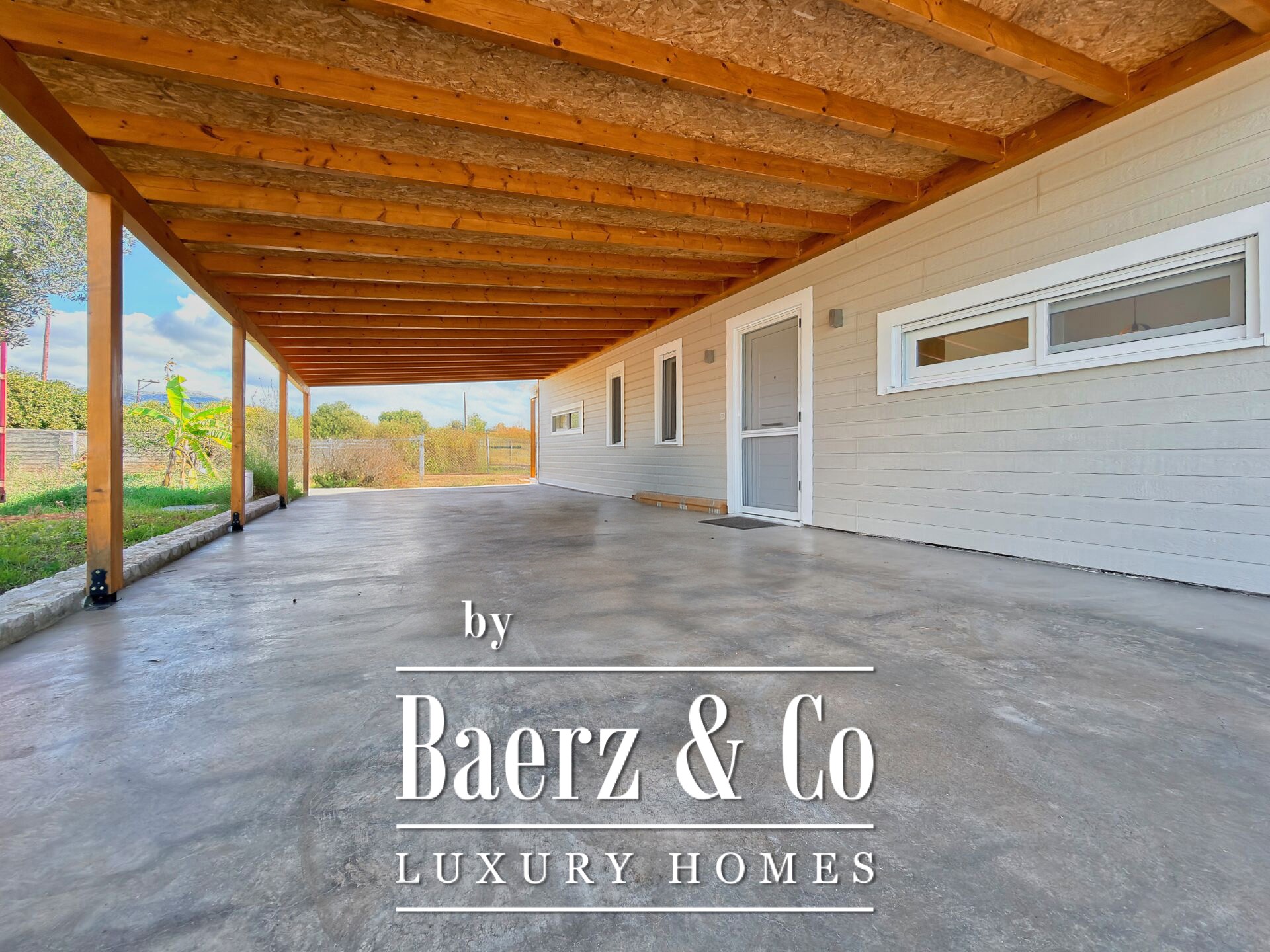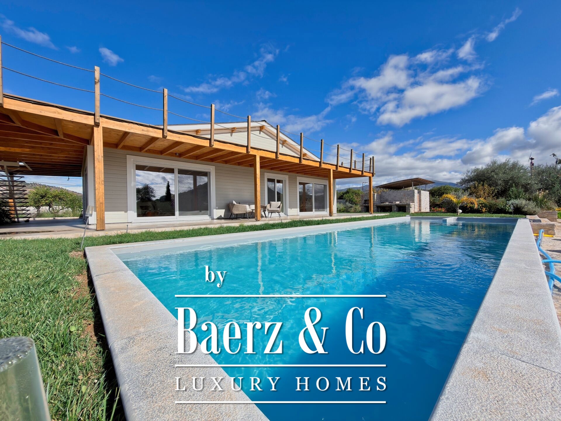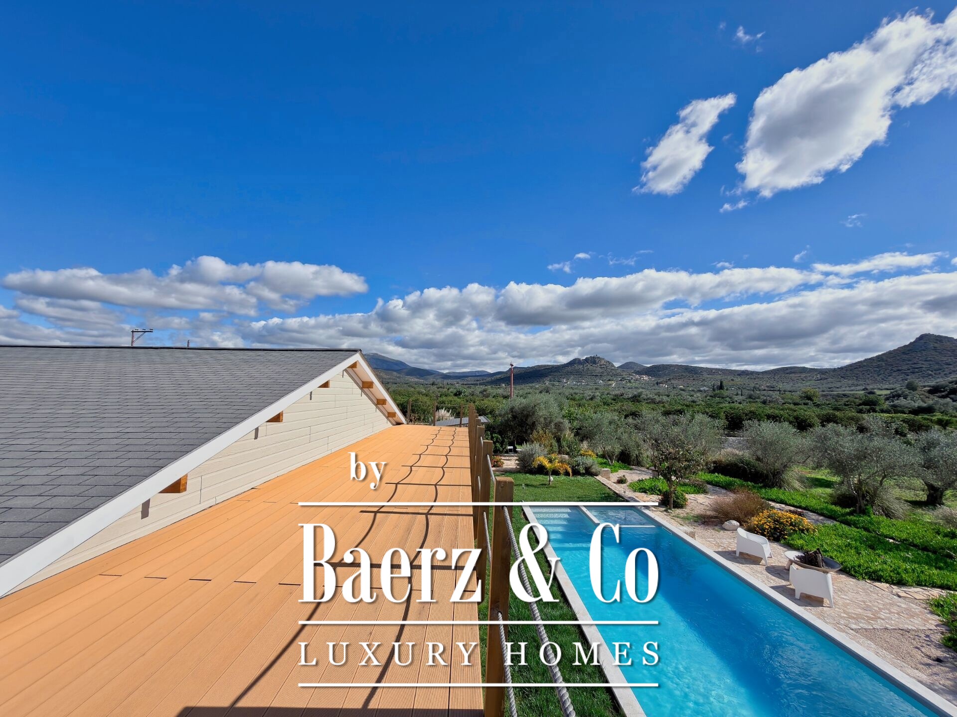 Detached house Agios Adrianos welcomes you a few kilometers from Nafplio, set quietly within a 6,900 m² garden. This 125 m² property, crafted by a renowned prefabrication builder in 2023, offers contemporary comfort just 10 kilometers from the coast. Spaces flow naturally from the open-plan living and dining area to a kitchen designed for ease, three bright bedrooms, and two refined bathrooms. An exterior staircase rises to a balcony giving panoramic mountain and nature views, while terraces connect seamlessly to a 4 by 13 meter pool, surrounded by uninterrupted vistas.