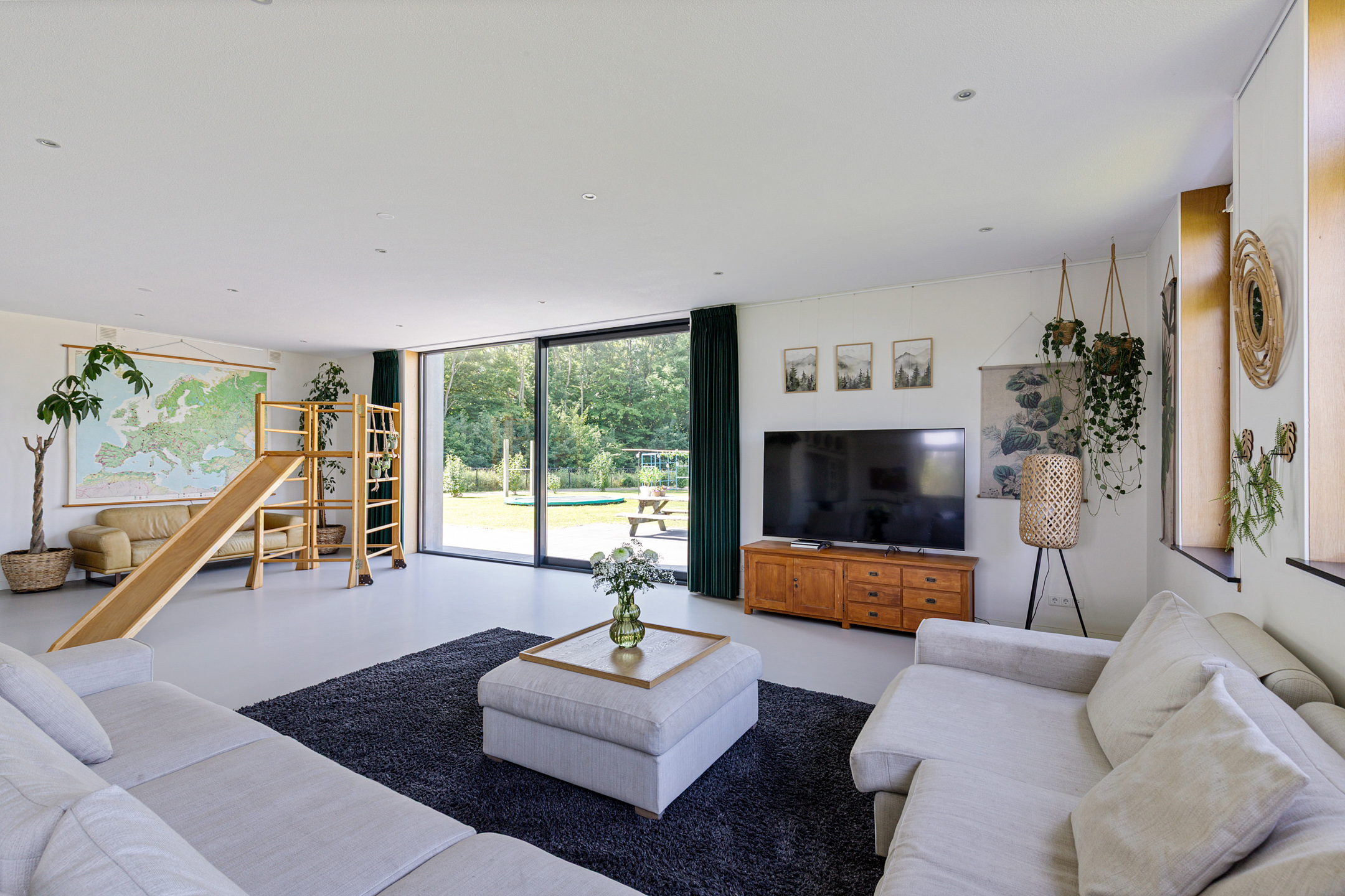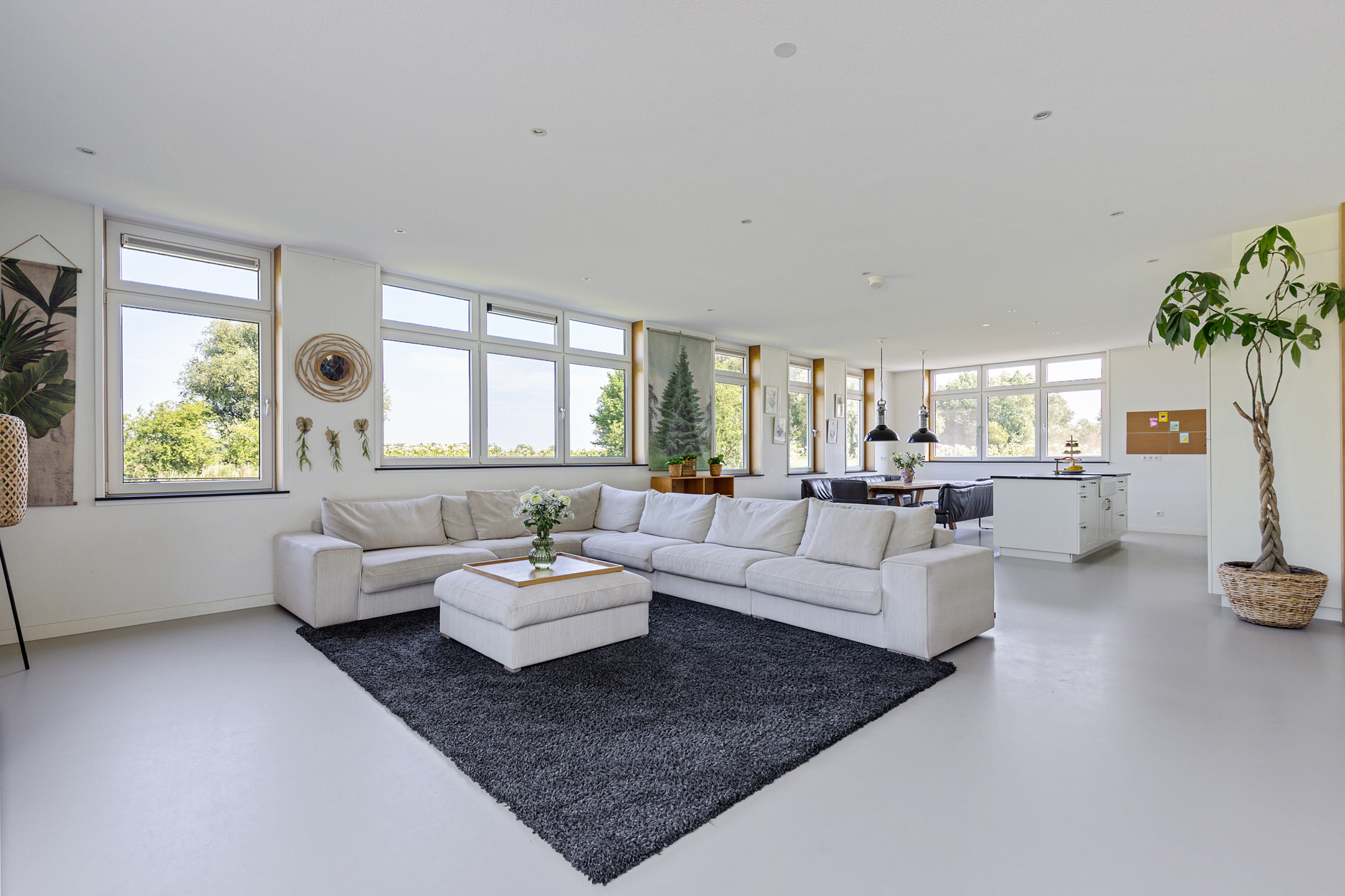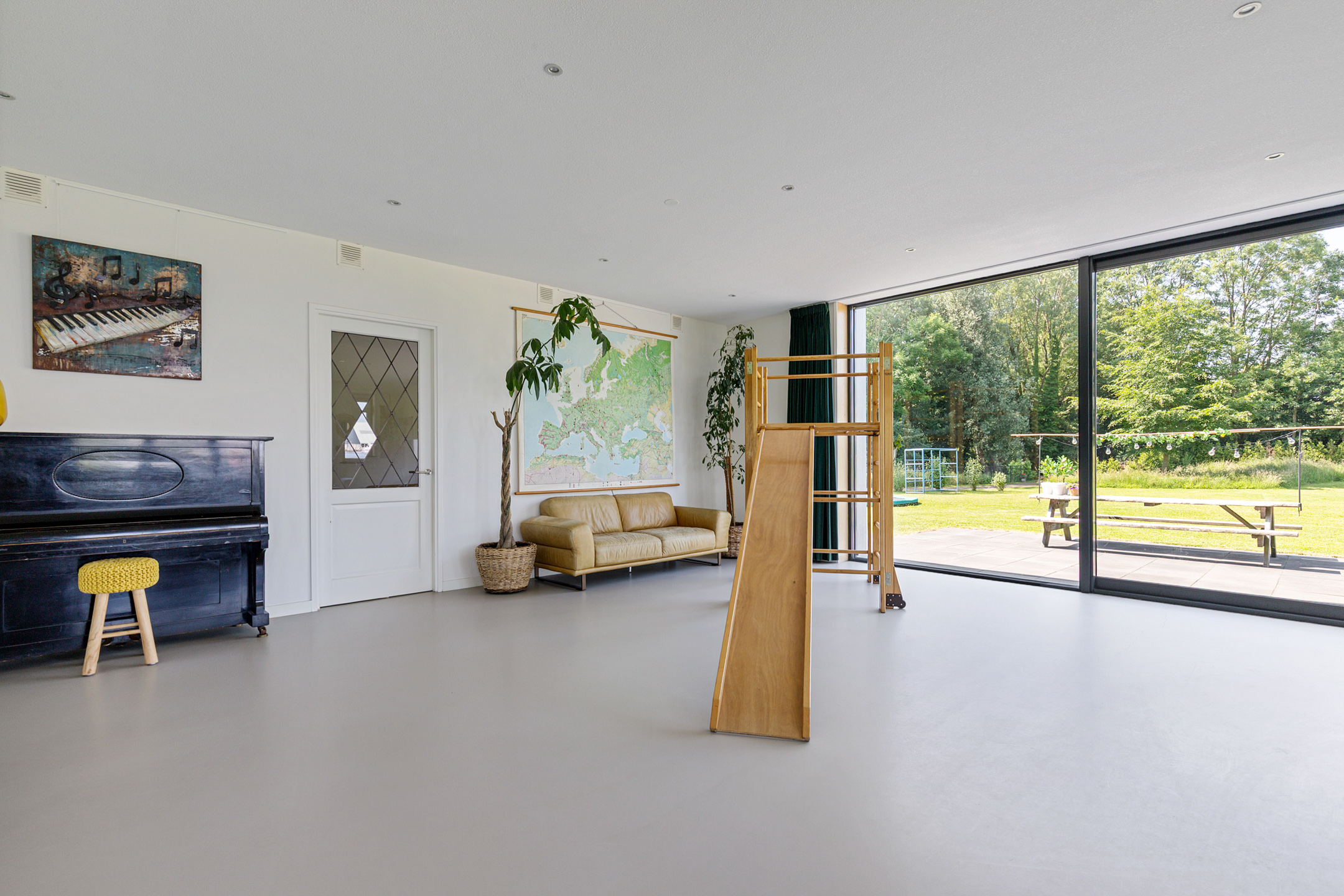 The attached barn (or *deel*), accessible from the hall, is fully insulated and features a concrete floor with underfloor heating and large windows. High double barn doors make it ideal for multiple vehicles or even a motorhome. The technical installations are also housed here. This space offers excellent potential to be converted into extra living or work space.