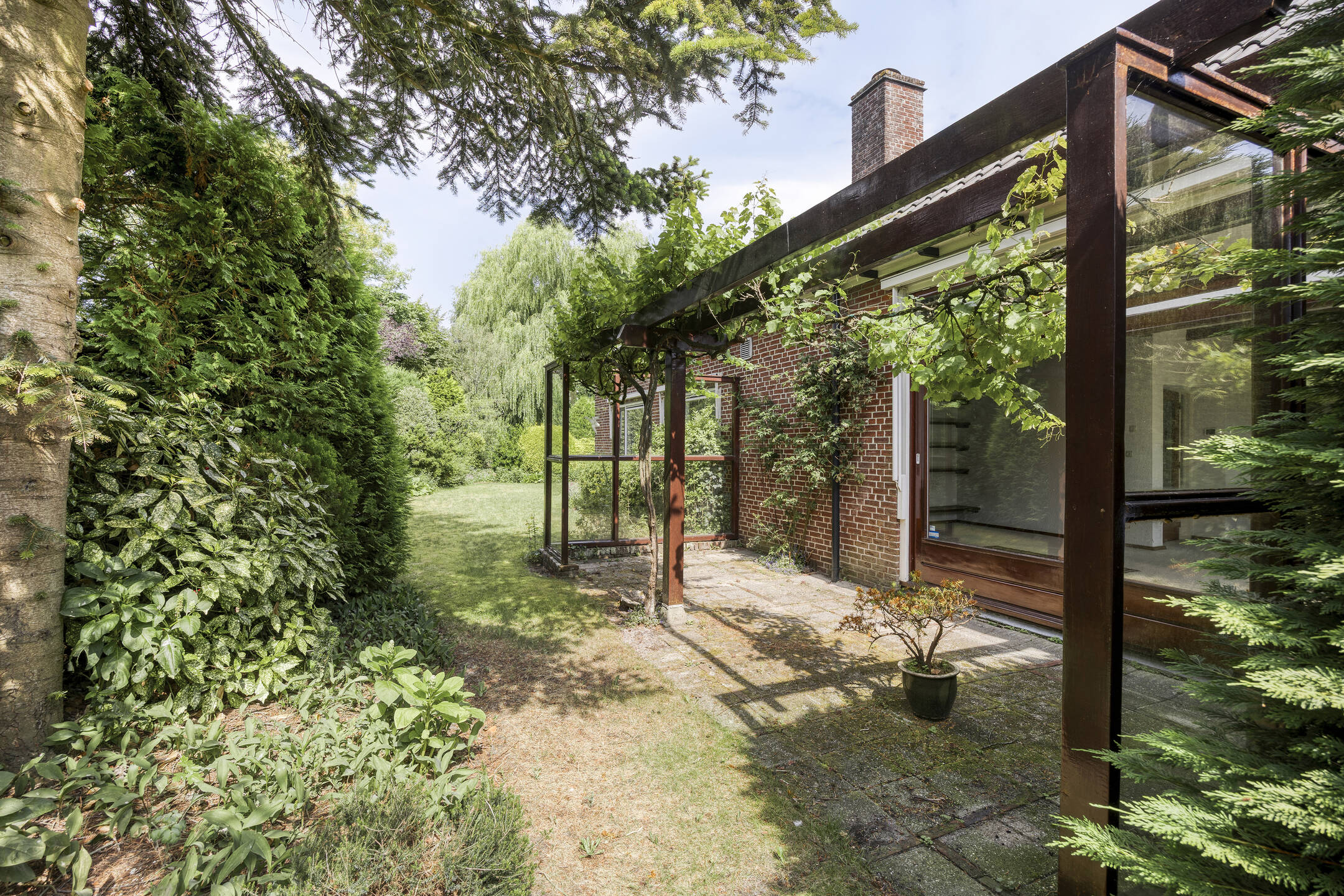 To the left of the hallway is a separate toilet with a small sink, the fuse box, and access to the living room. The living room is spacious and bright, with large windows, an original built-in cabinet, a fireplace, and sliding doors leading to the mature front, side, and back gardens.