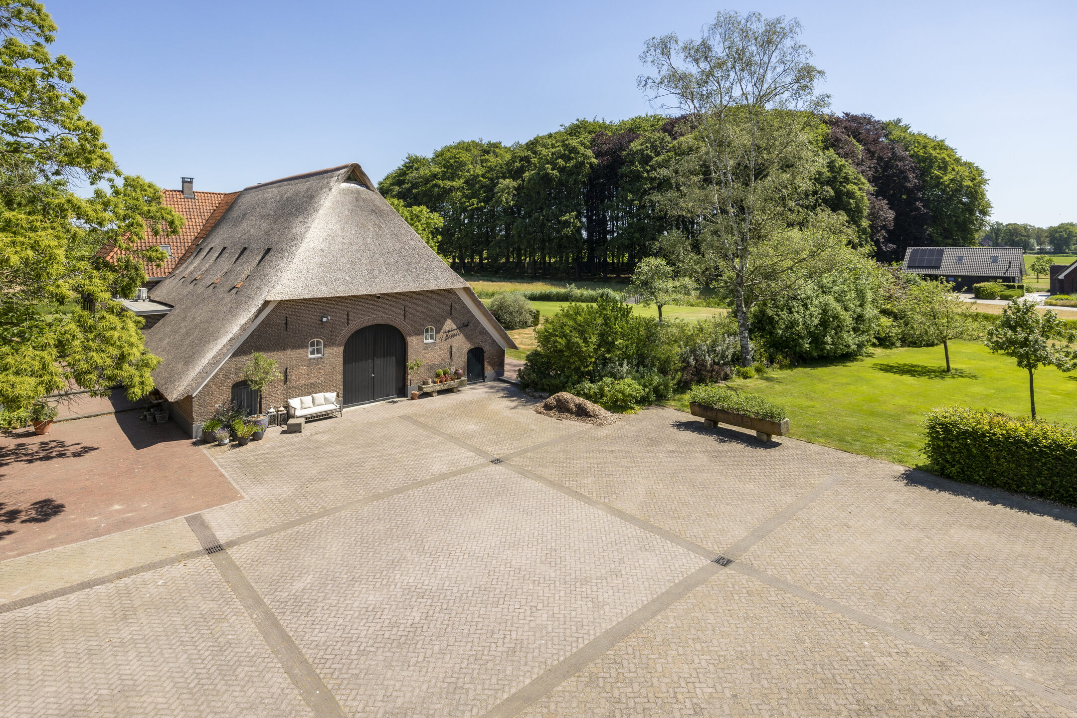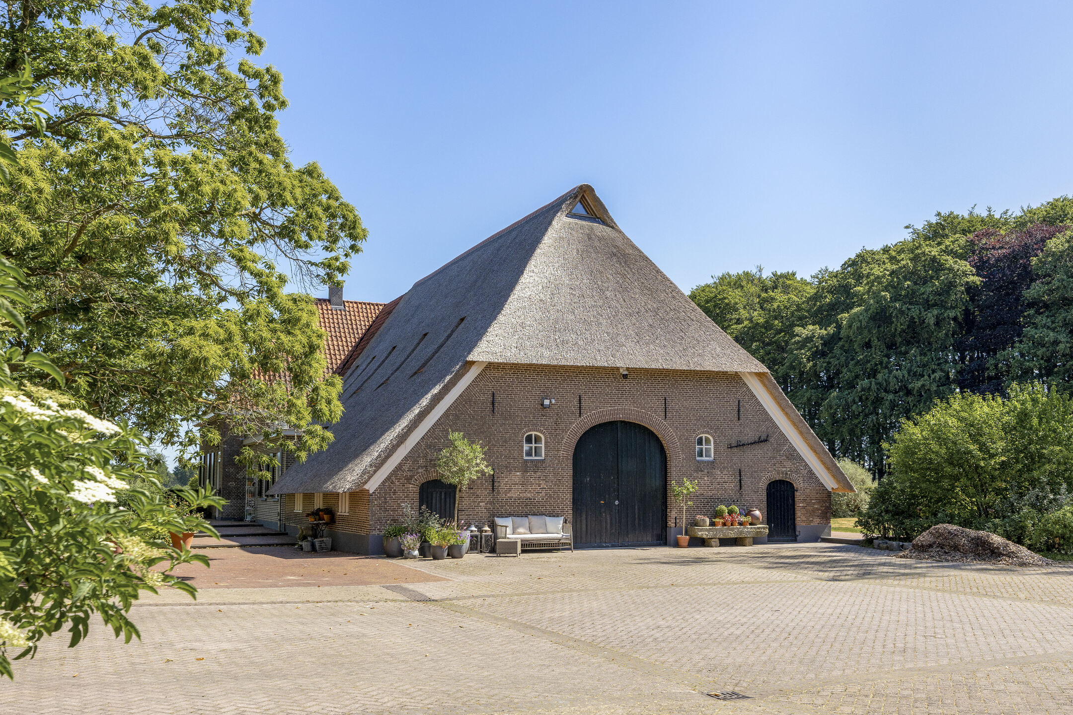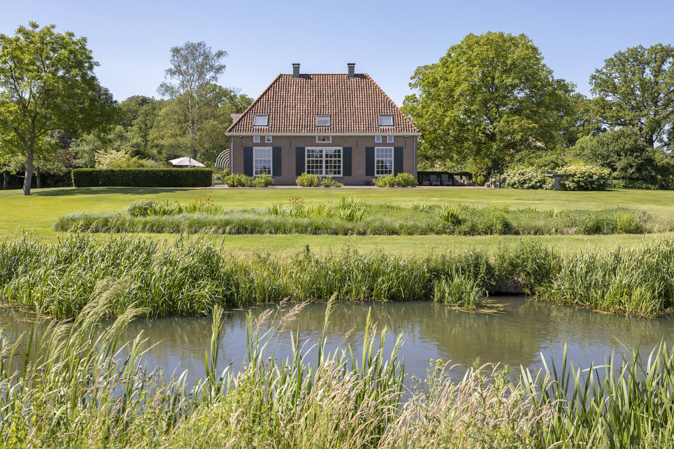 When an agency like Eelerwoude gets involved in landscaping, you just know it's going to be okay. And so it did. The gardens around the house are once again bordered by the moat, through which the crystal-clear water of the Berkel gaily splashes. From the house, living is focused on the Berkel and the village beyond. On the right side you have a view of the beech forest, where you can go via the little bridge to take a walk; between the trees is a path.
