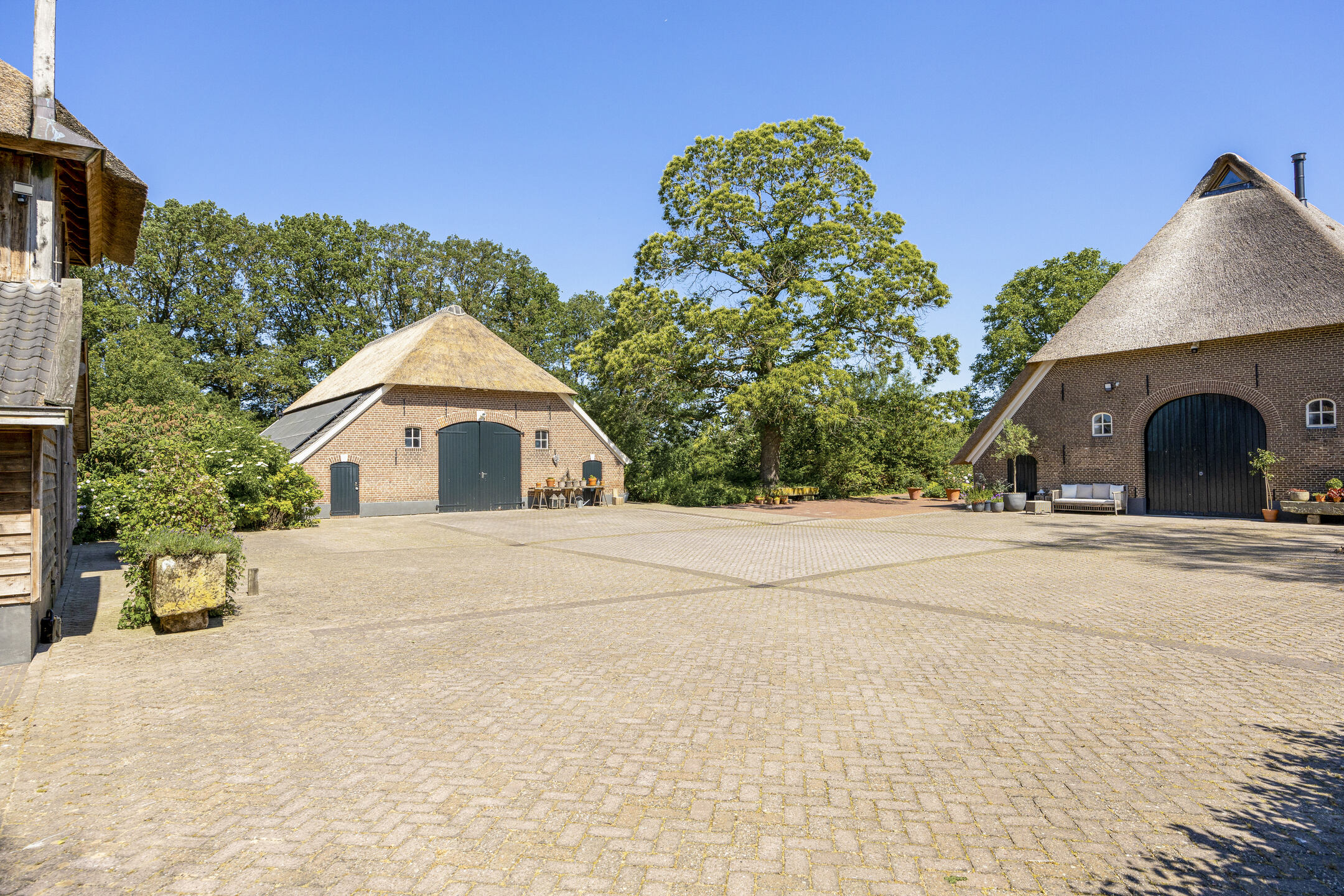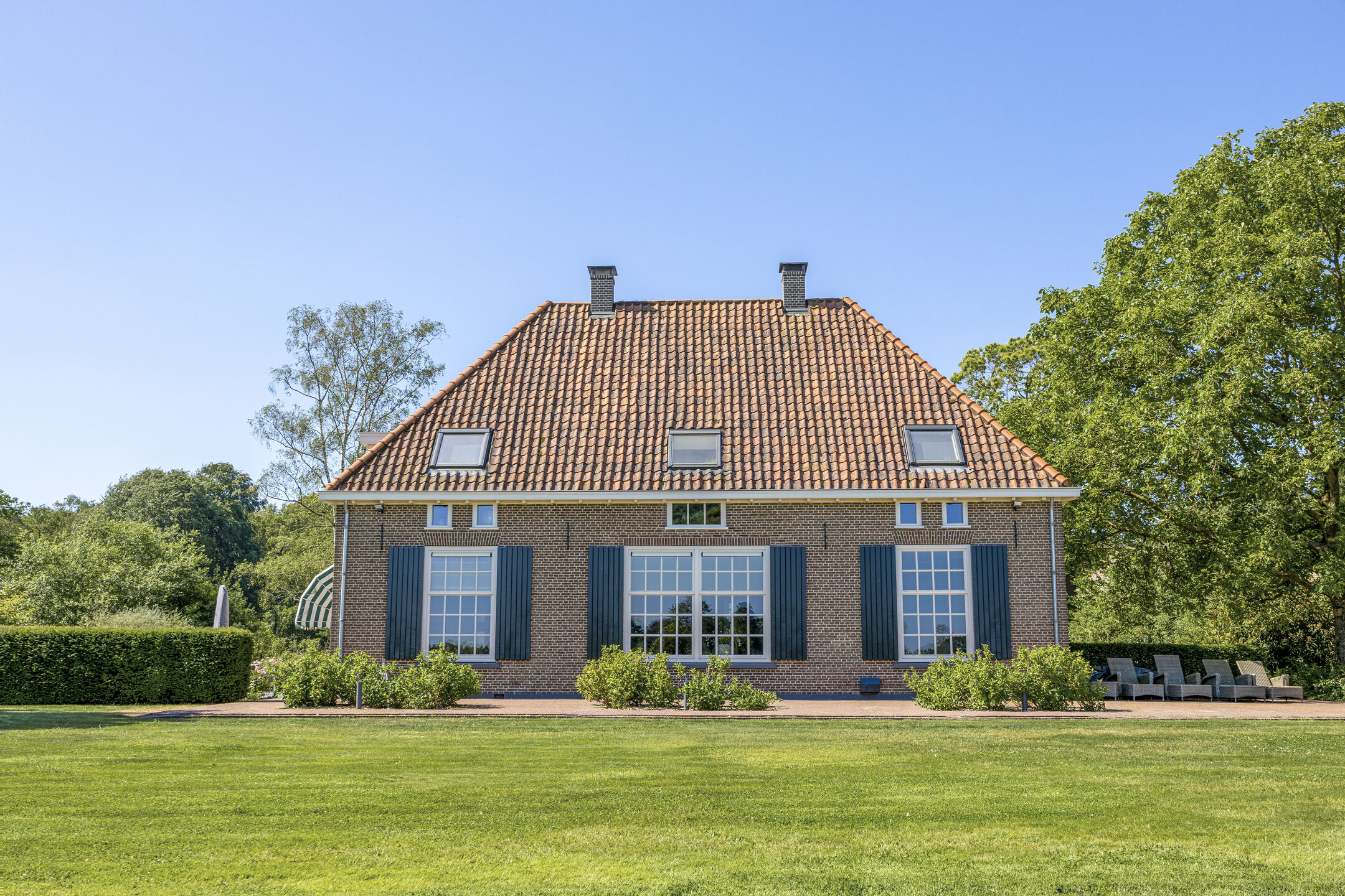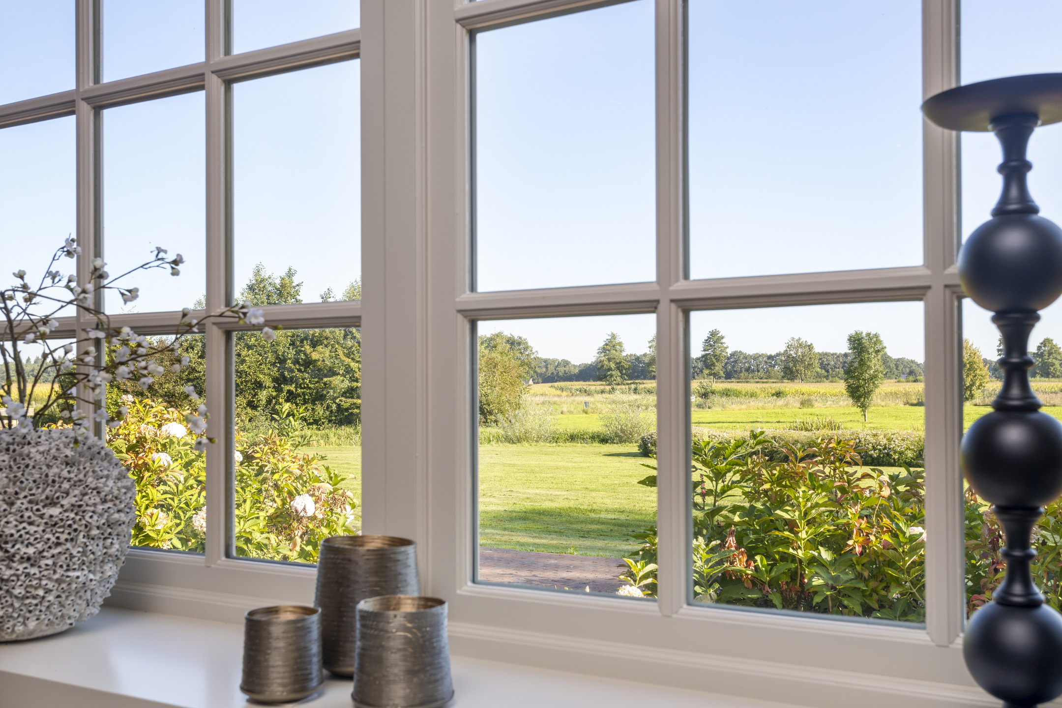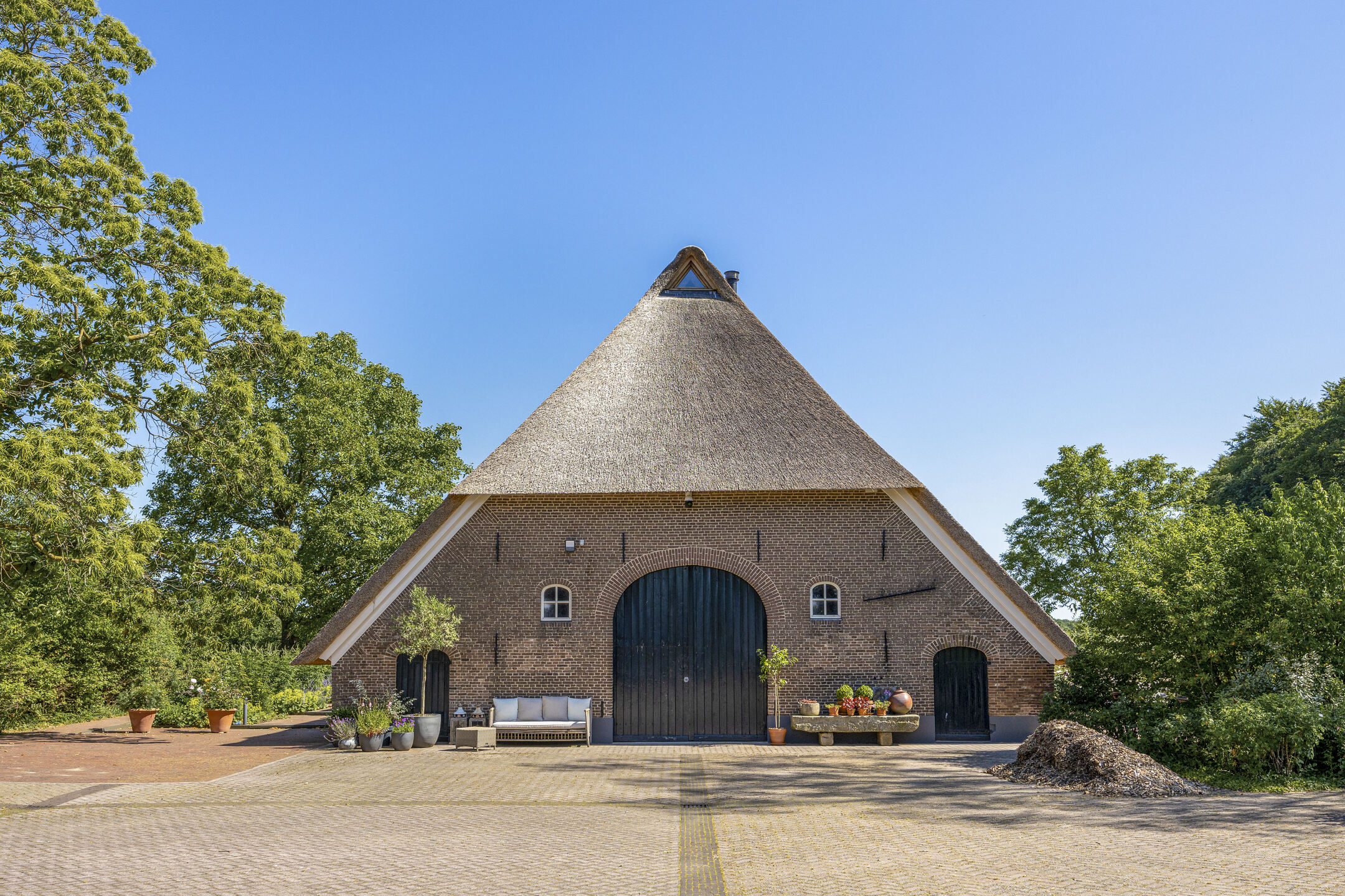 When an agency like Eelerwoude gets involved in landscaping, you just know it's going to be okay. And so it did. The gardens around the house are once again bordered by the moat, through which the crystal-clear water of the Berkel gaily splashes. From the house, living is focused on the Berkel and the village beyond. On the right side you have a view of the beech forest, where you can go via the little bridge to take a walk; between the trees is a path.