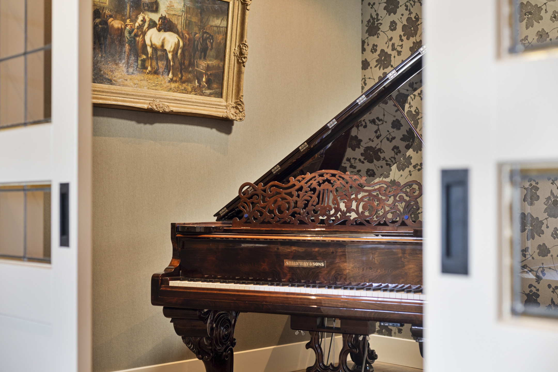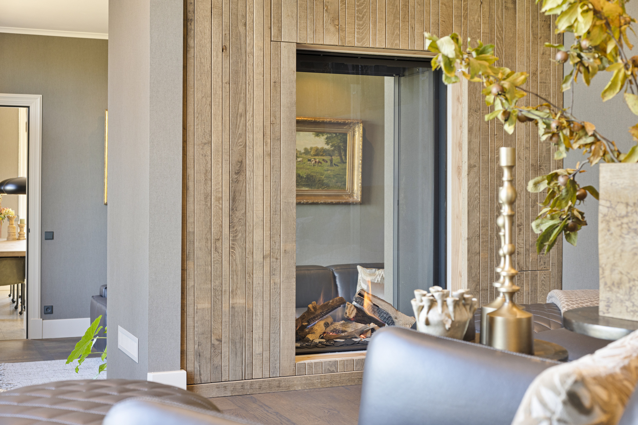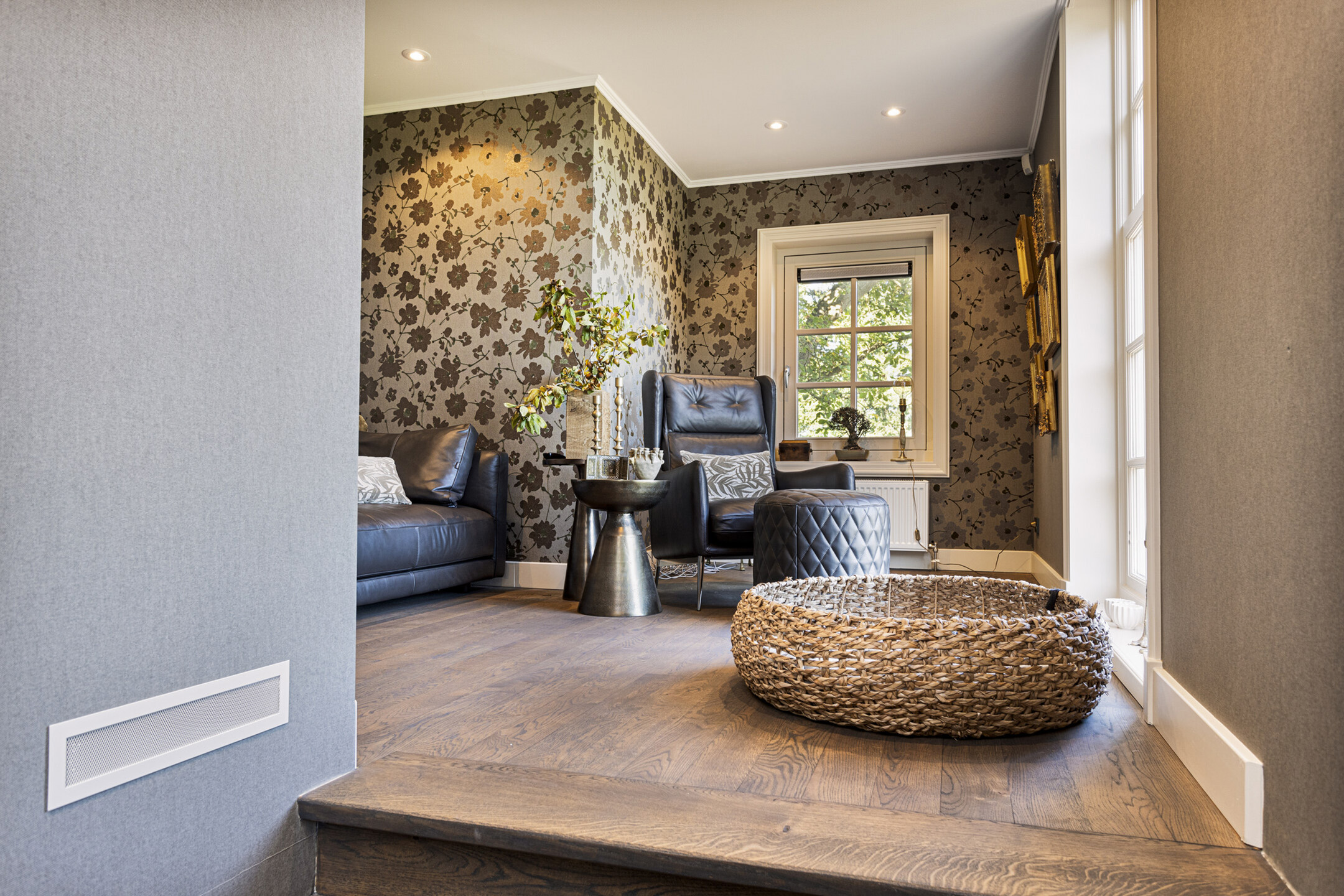 The living room has a magnificent floor; it is an old castle floor from the French chateau of the previous owners. The current residents had it beautifully sanded and coated with a refined gray floor oil, blending seamlessly into the contemporary interior. The music room is a room en-suite, separated from the living room by sliding doors, and now has the role of an old-fashioned art cabinet, but one whose indoor climate can be adjusted entirely as desired. If you do not have a Steinway or art collection to display here, then this is a wonderful study, library, cinema or dining room. To the left, overlooking the garden and side terrace, is the upstairs room, which shares a gas fireplace with the living room. A lovely corner to crawl away with a good book.