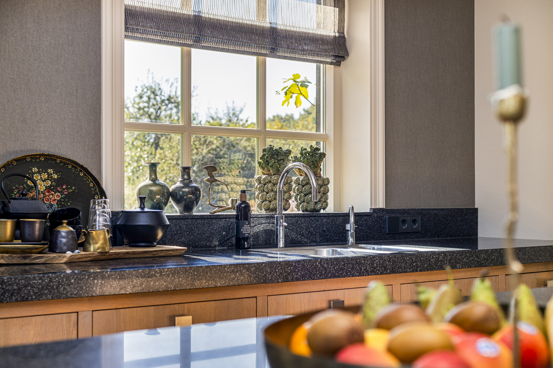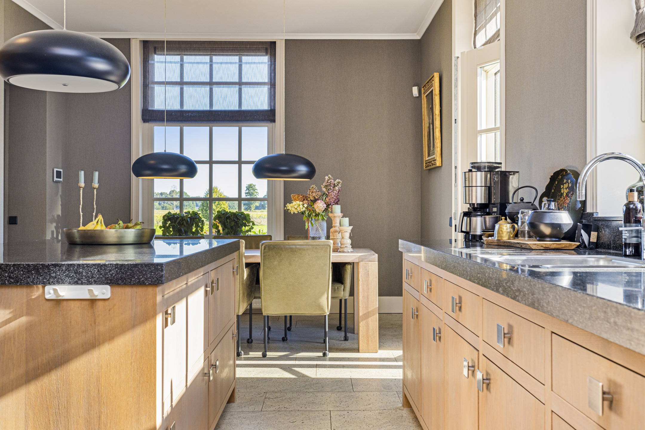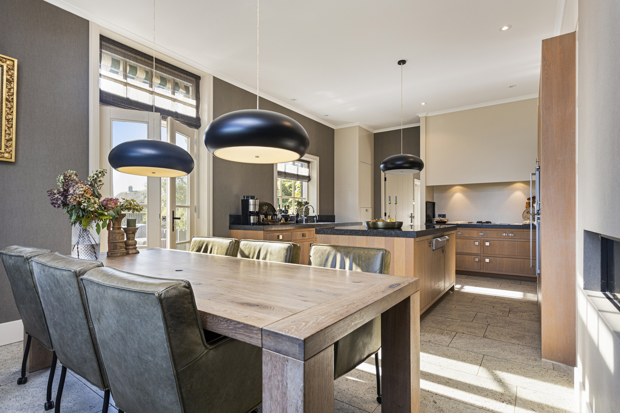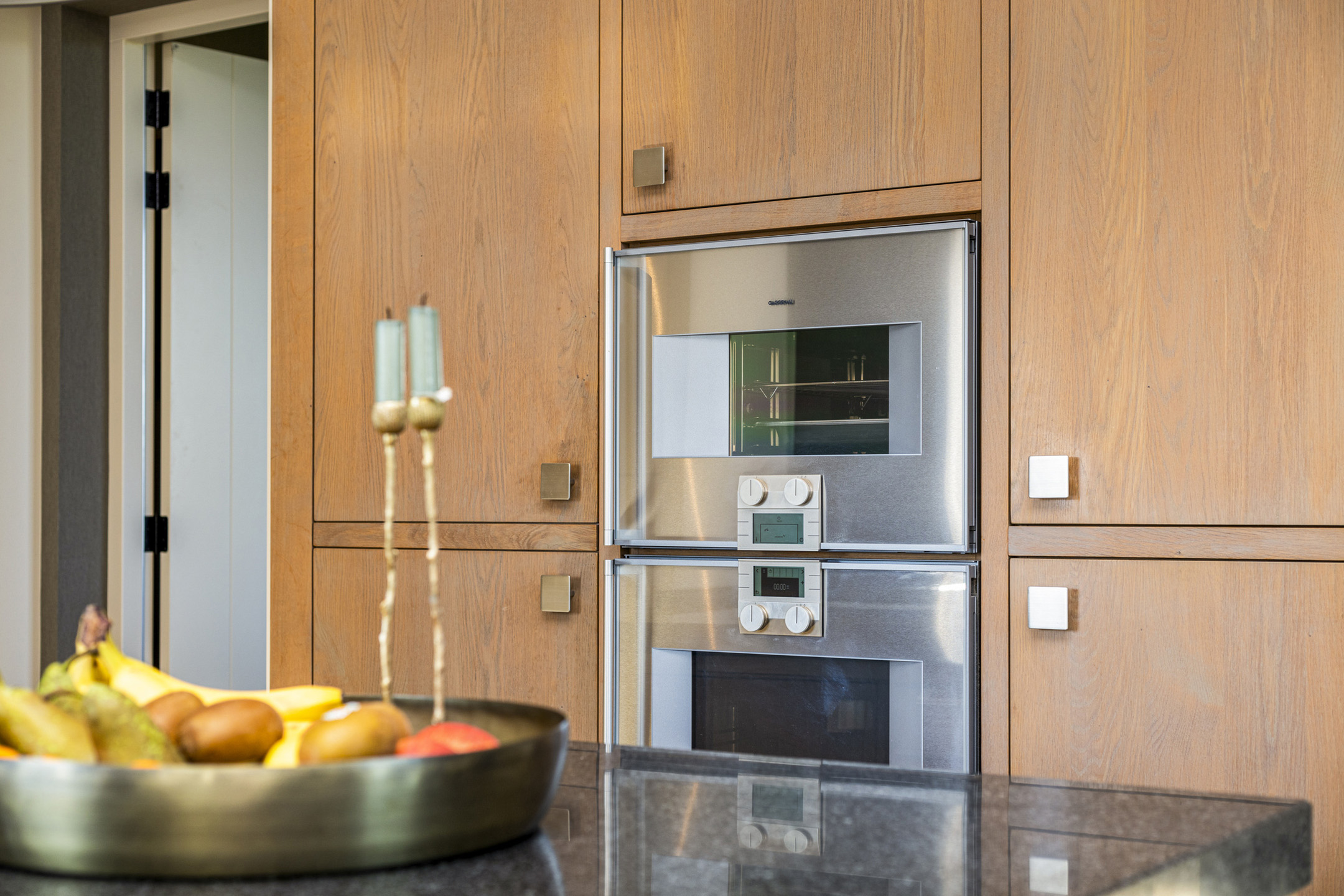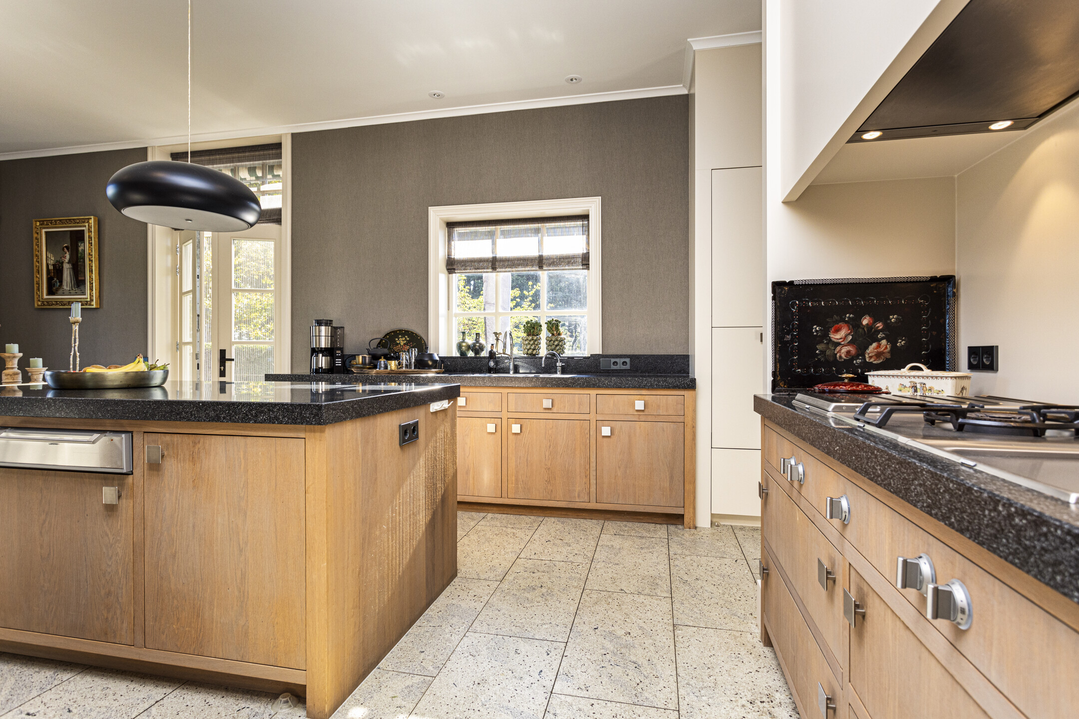 The kitchen is truly one of a kind: completely custom made and put together by a kitchen studio. The large kitchen features heavy oak fronts and granite countertops. All built-in appliances are by Gaggenau, which guarantees optimal design and function. There is an appliance wall with double refrigerators and a steam and a convection oven. On the other side, overlooking the sunny side terrace a large worktop with double sink and a five-in-one boiling water faucet. Up front, in the contemporary cove, the stove with wok burner, plancha and four large gas burners.