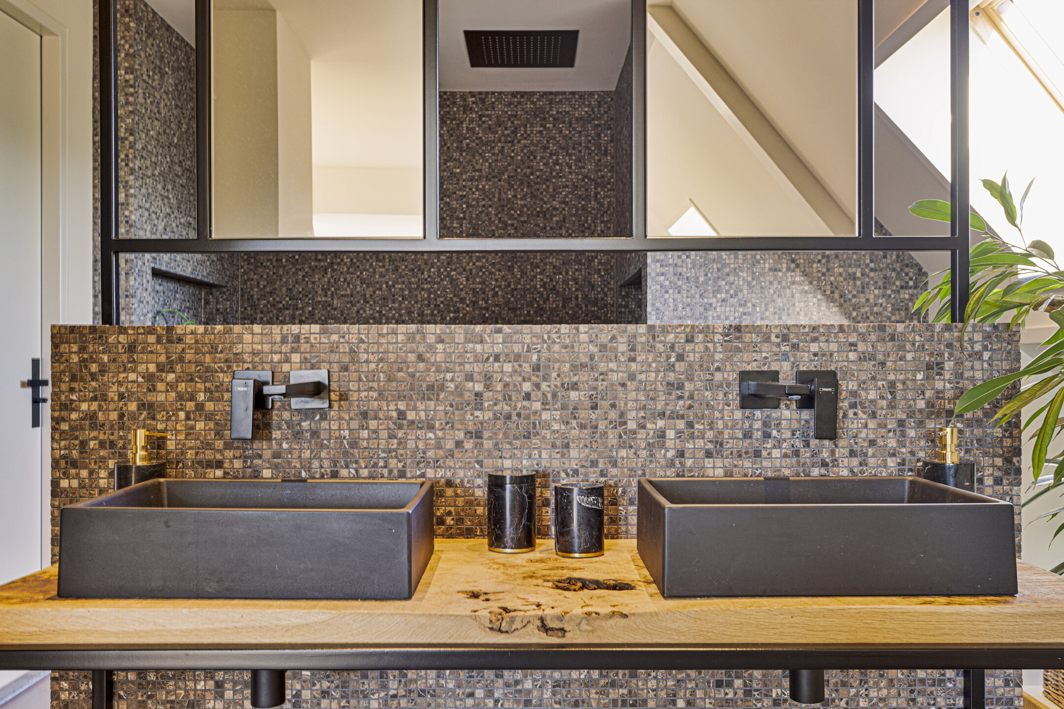 The master bedroom is accessed through the bathroom: with the allure of an exclusive resort, it features a double shower with rain shower, a freestanding bathtub overlooking the garden, and a large double sink.