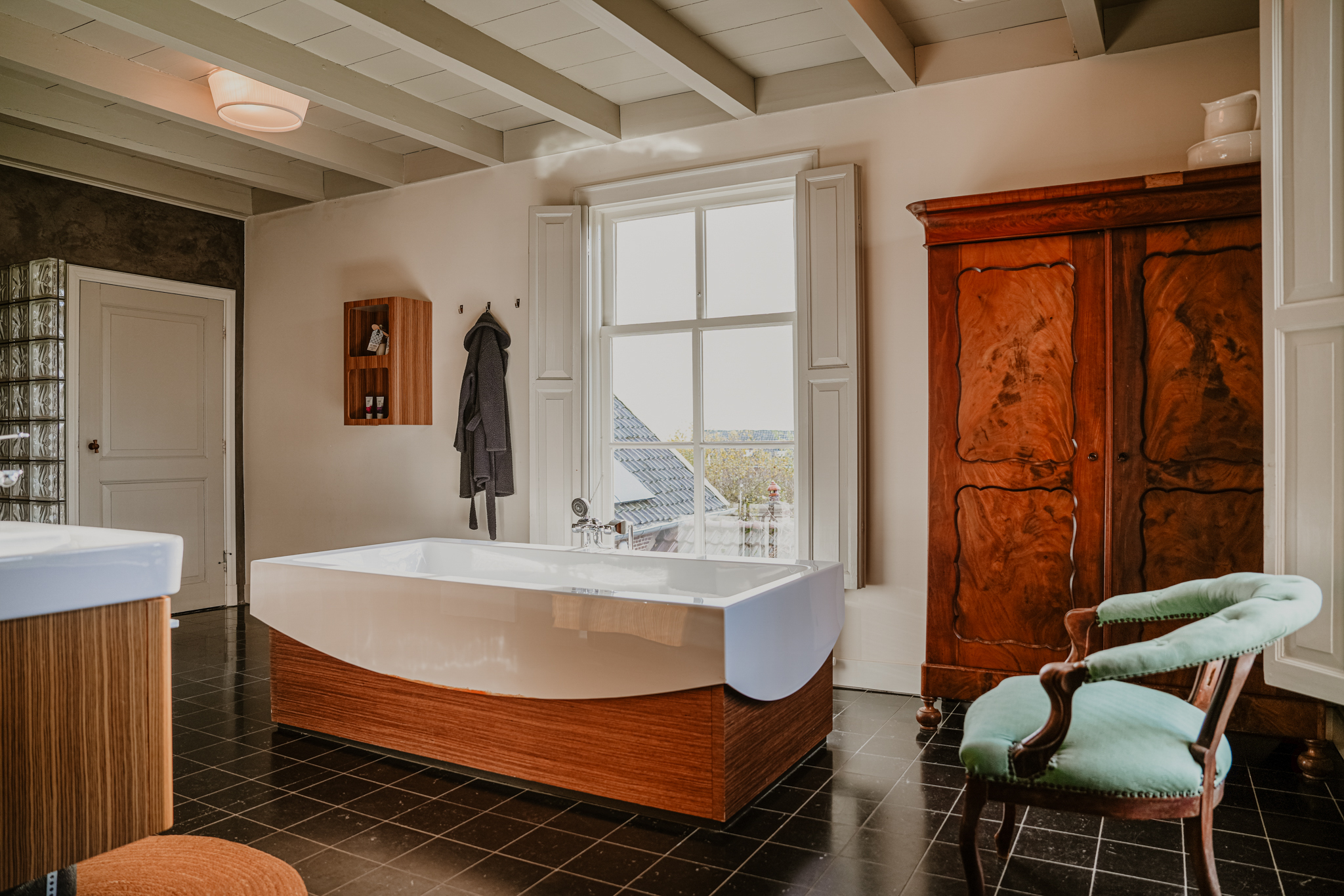 De slaapkamer en garderobekamer bevinden zich op de plaats waar in het verleden de raadzaal zich bevond. Deze was bereikbaar vanuit een separate zijentree. Door deze tweede entree is de ‘westvleugel’ ook uitstekend in te richten als zelfstandige gastenkamer. De badkamer is zonder meer riant te noemen. Er zijn een vrijstaand bad, een royale inloop regendouche en twee wastafels. De toiletruimte is separaat. Alle slaapkamers en de badkamer in het voorhuis zijn voorzien van airconditioning.