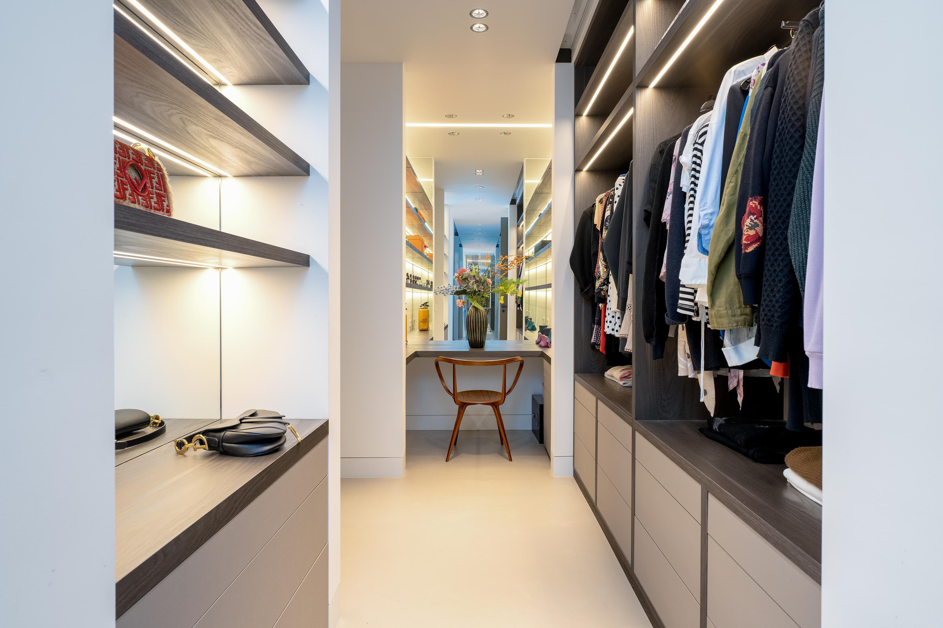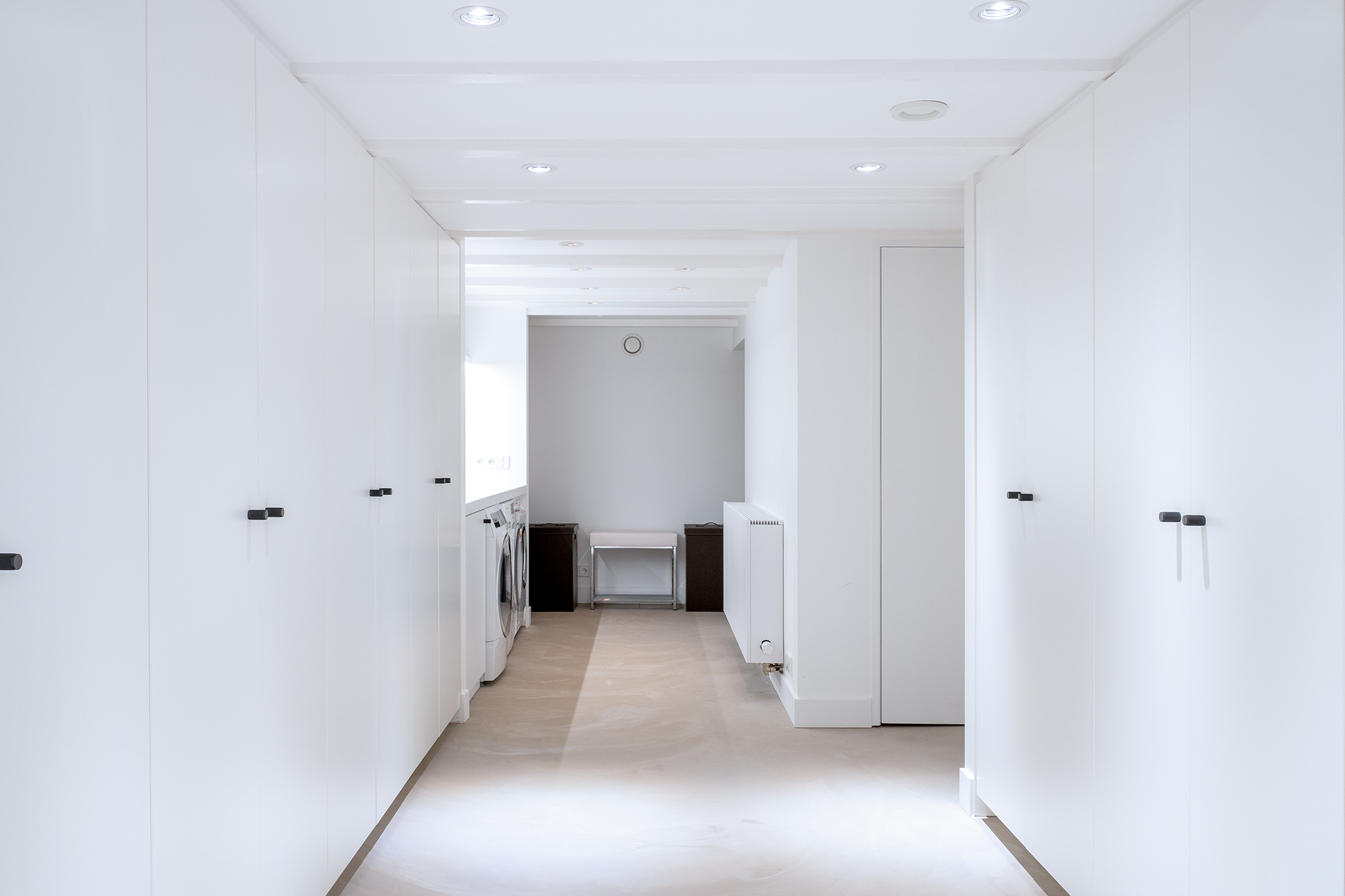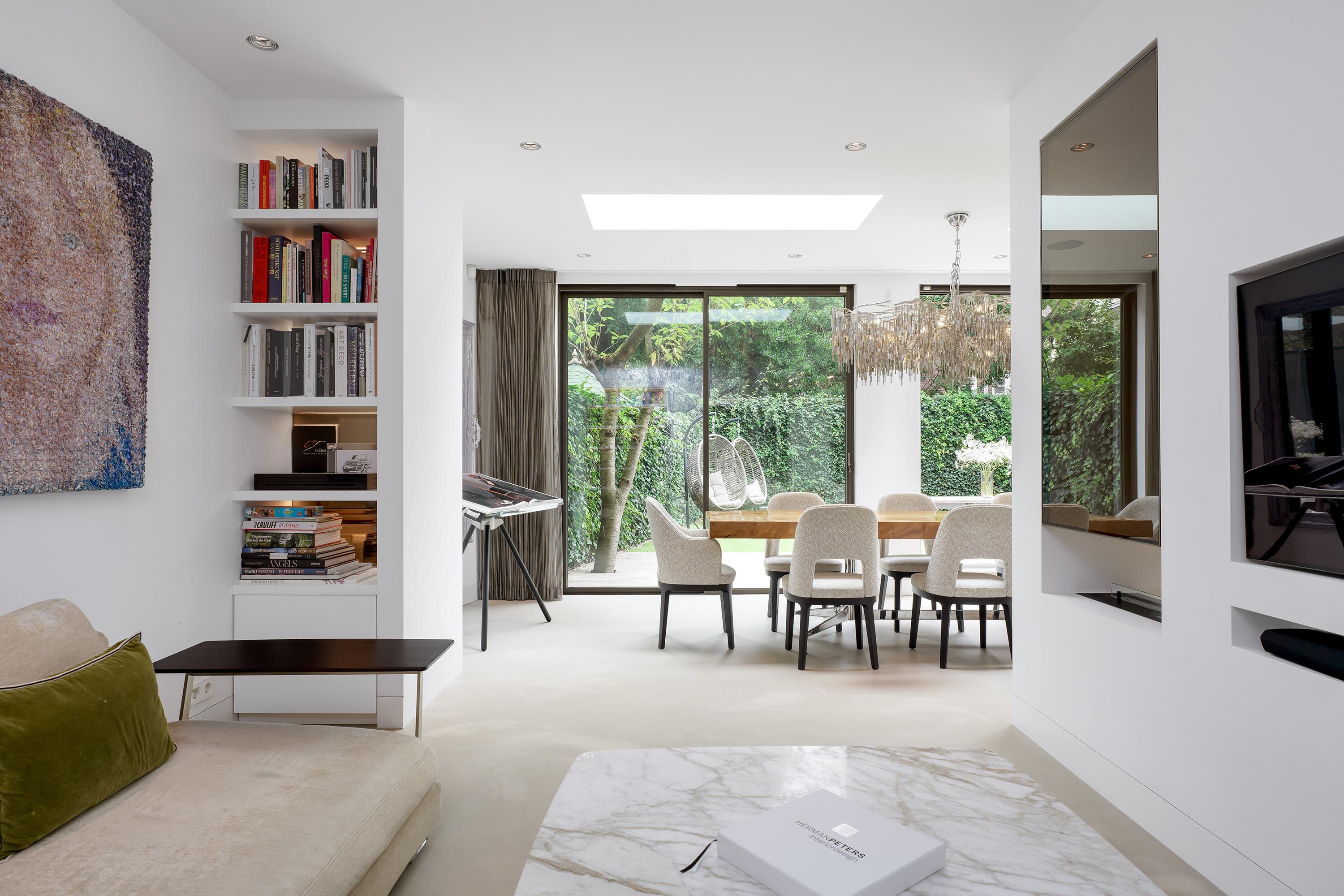 At the back of this floor, there is a large living space with a lovely, luxury kitchen, which really does come with everything you might expect: a sink island with a Quooker tap and also a cooler, oven, combi steam oven, hot plate, fridge, freezer, induction hob and built-in extractor unit. All the built-in appliances are by Gaggenau. The kitchen’s pièce de résistance is a special alcove with a pull-out unit for a coffee machine. Two attractive ethanol fireplaces separate the kitchen from the living-room area. The living space has been fitted with a number of built-in cupboards. The dining-room area, which is located in the extension, is next to the kitchen and the living-room area and comes complete with electric curtains. Skylights flood this space with light. A sliding door gives access to the large, south-east facing back garden.