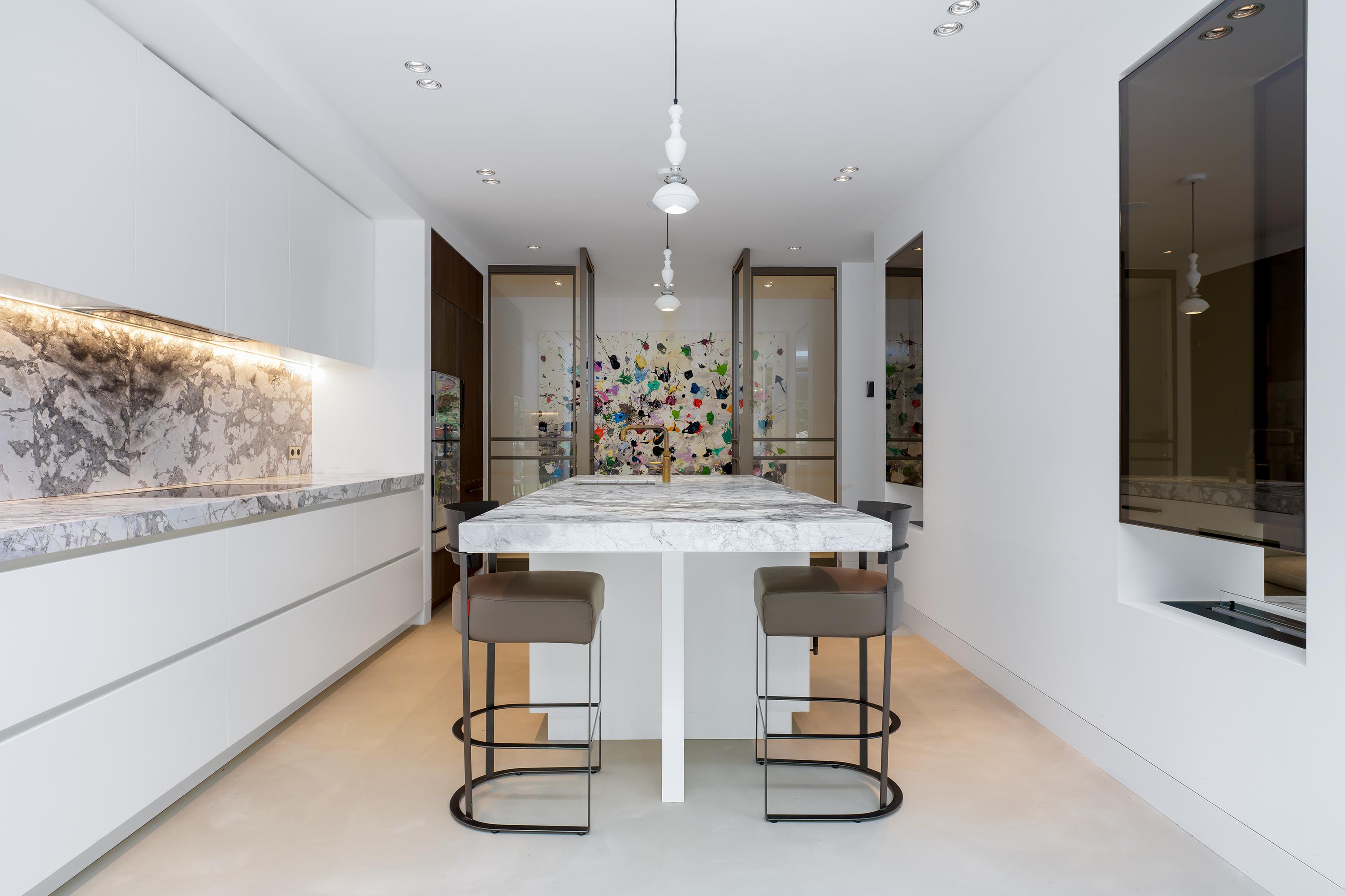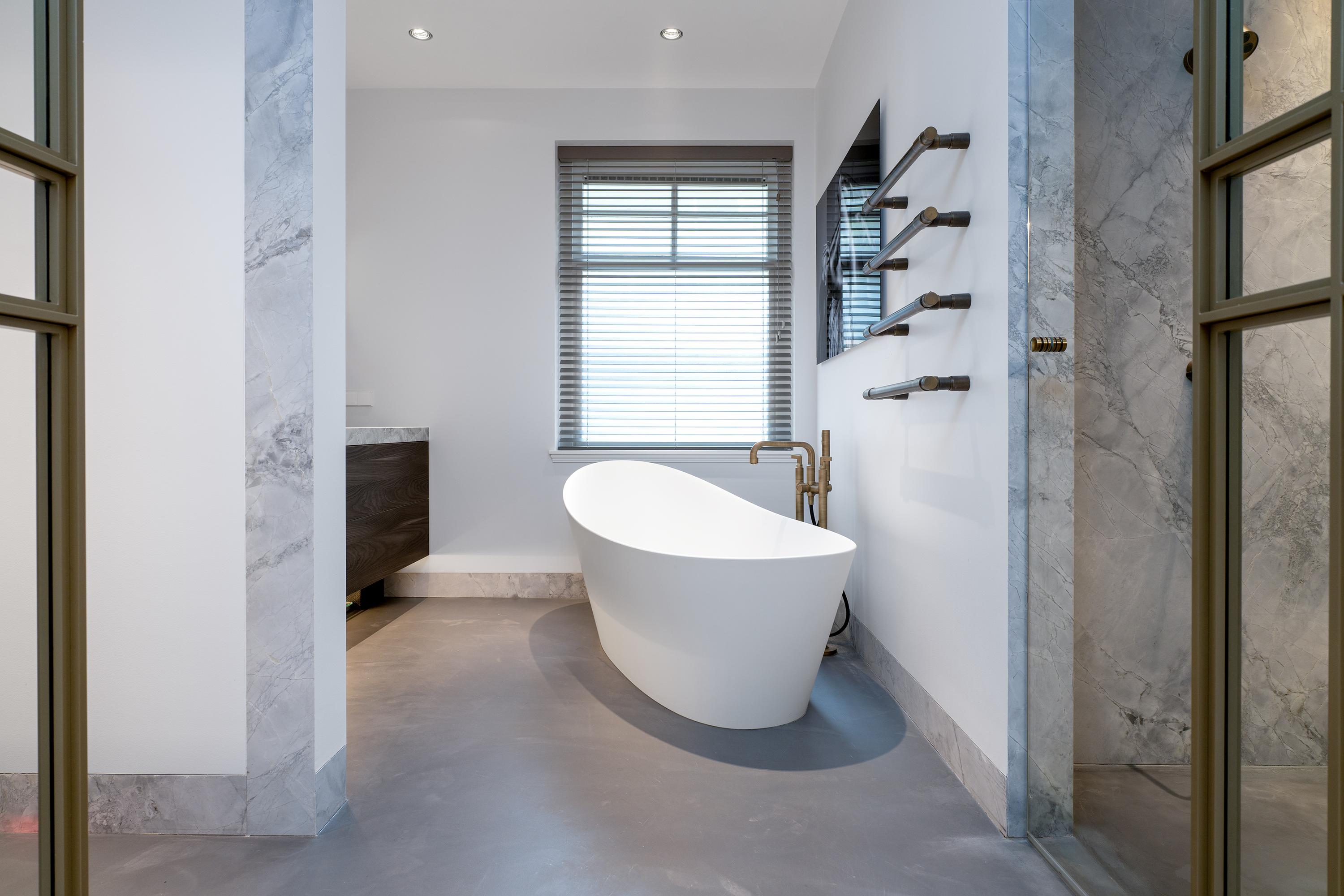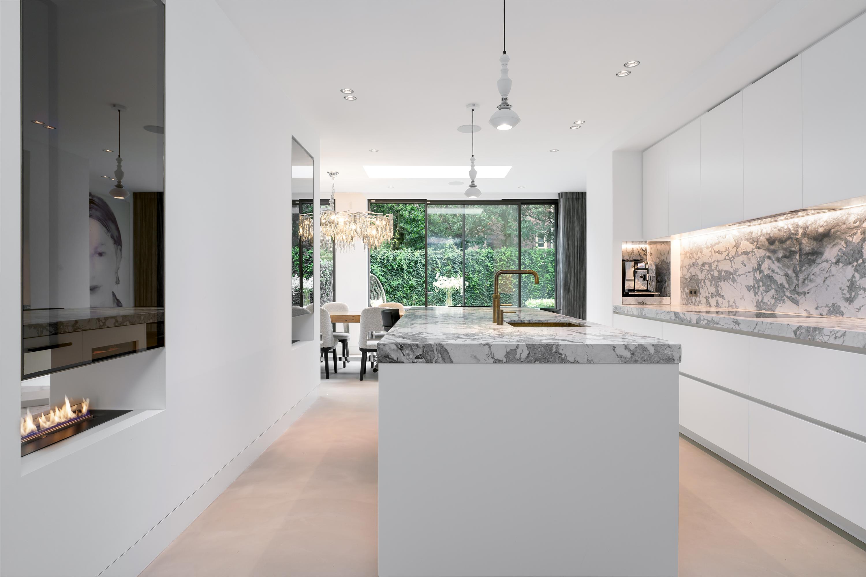 At the back of this floor, there is a large living space with a lovely, luxury kitchen, which really does come with everything you might expect: a sink island with a Quooker tap and also a cooler, oven, combi steam oven, hot plate, fridge, freezer, induction hob and built-in extractor unit. All the built-in appliances are by Gaggenau. The kitchen’s pièce de résistance is a special alcove with a pull-out unit for a coffee machine. Two attractive ethanol fireplaces separate the kitchen from the living-room area. The living space has been fitted with a number of built-in cupboards. The dining-room area, which is located in the extension, is next to the kitchen and the living-room area and comes complete with electric curtains. Skylights flood this space with light. A sliding door gives access to the large, south-east facing back garden.