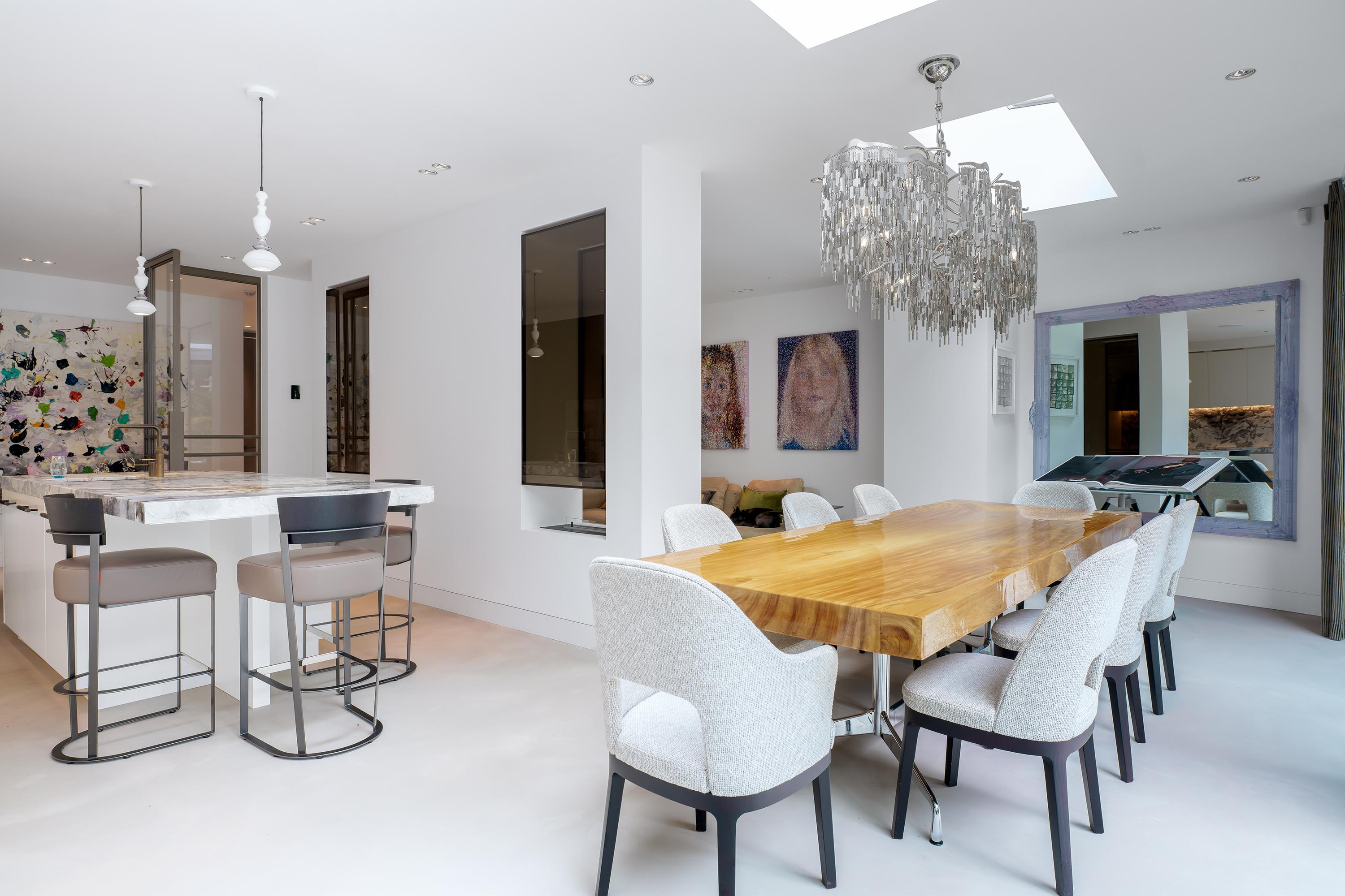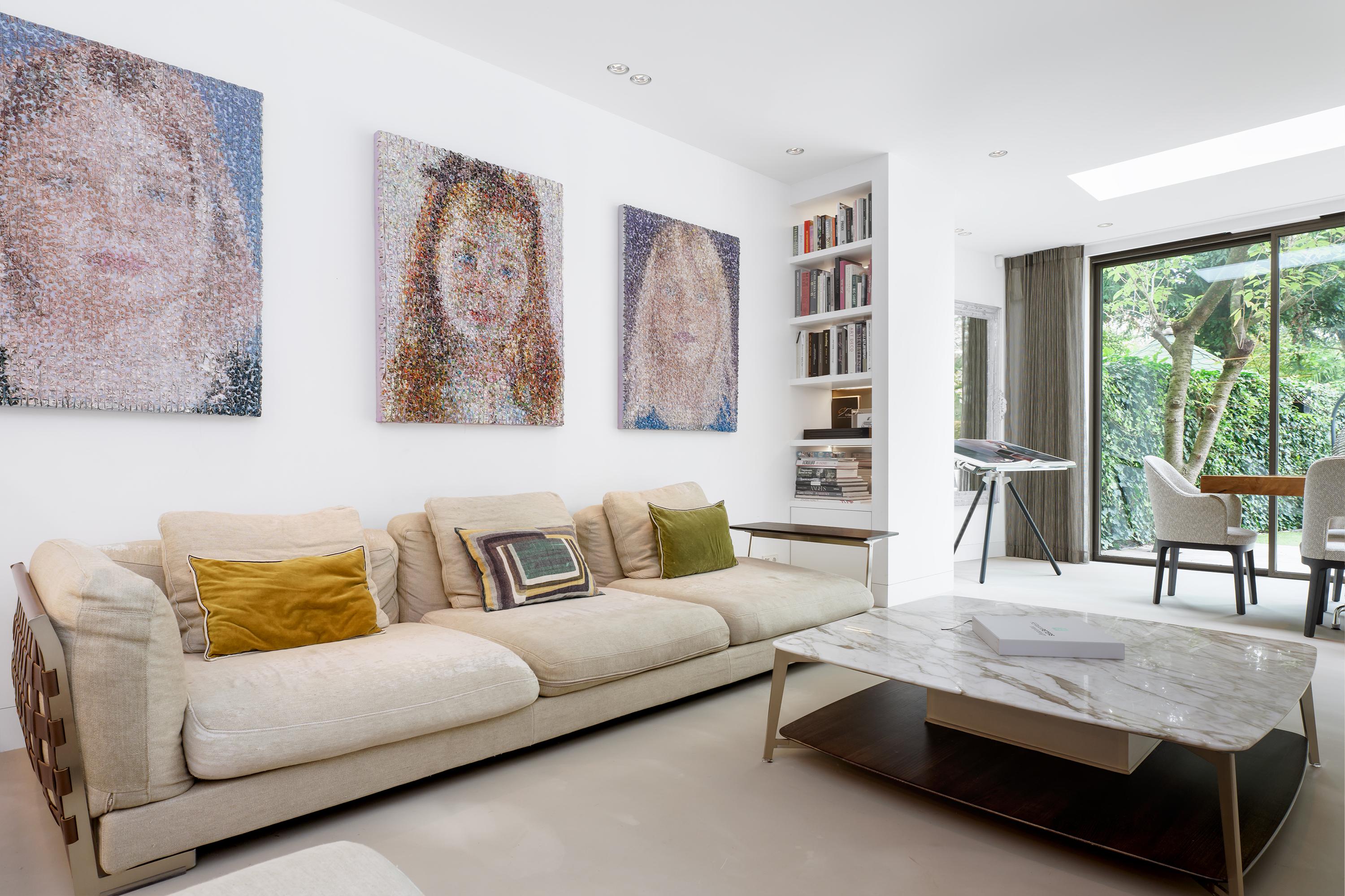 There is a bedroom at the back of this floor too, part of which extends into the extension; it opens out into the back garden via French doors. This large bedroom has a built-in desk and wall unit and sliding doors. A luxury bathroom on this floor is accessed from the hall and has a double, natural-stone washbasin vanity unit, a toilet and a large shower.