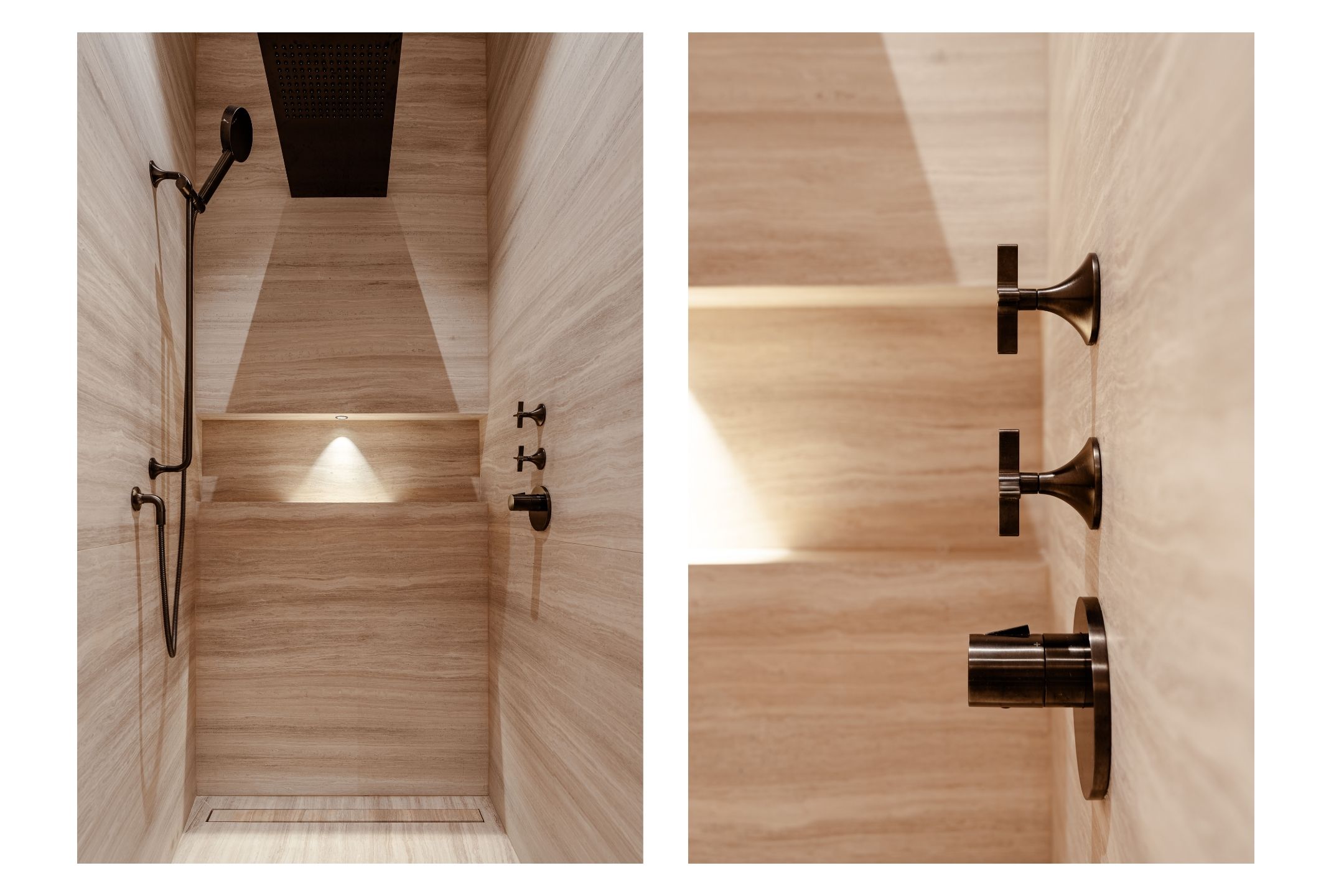 The apartment offers three bedrooms, each furnished with luxury Hästens beds. The master suite includes a private walk-in closet and a luxurious bathroom finished in marble and mosaic, featuring a bathtub, double washbasin, walk-in shower, and separate toilet. The second bathroom, designed in warm earthy tones, is also fully equipped and smartly laid out. Throughout the apartment lies a beautiful wooden floor, combined with underfloor and ceiling heating and cooling, recessed lighting, and electric sun blinds. A private storage room, as well as a technical and laundry room, are also included.