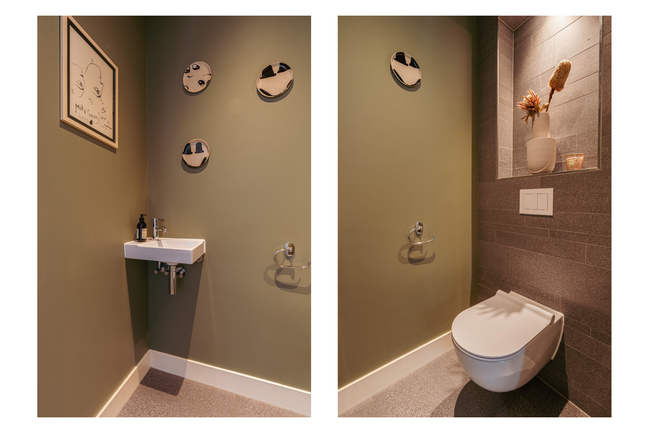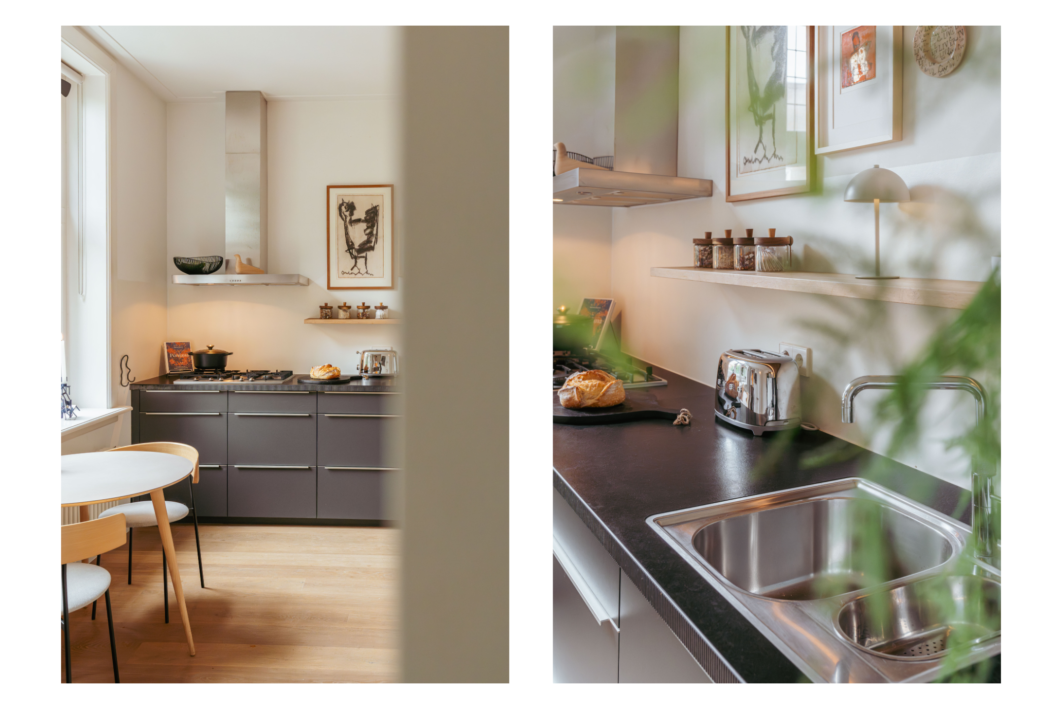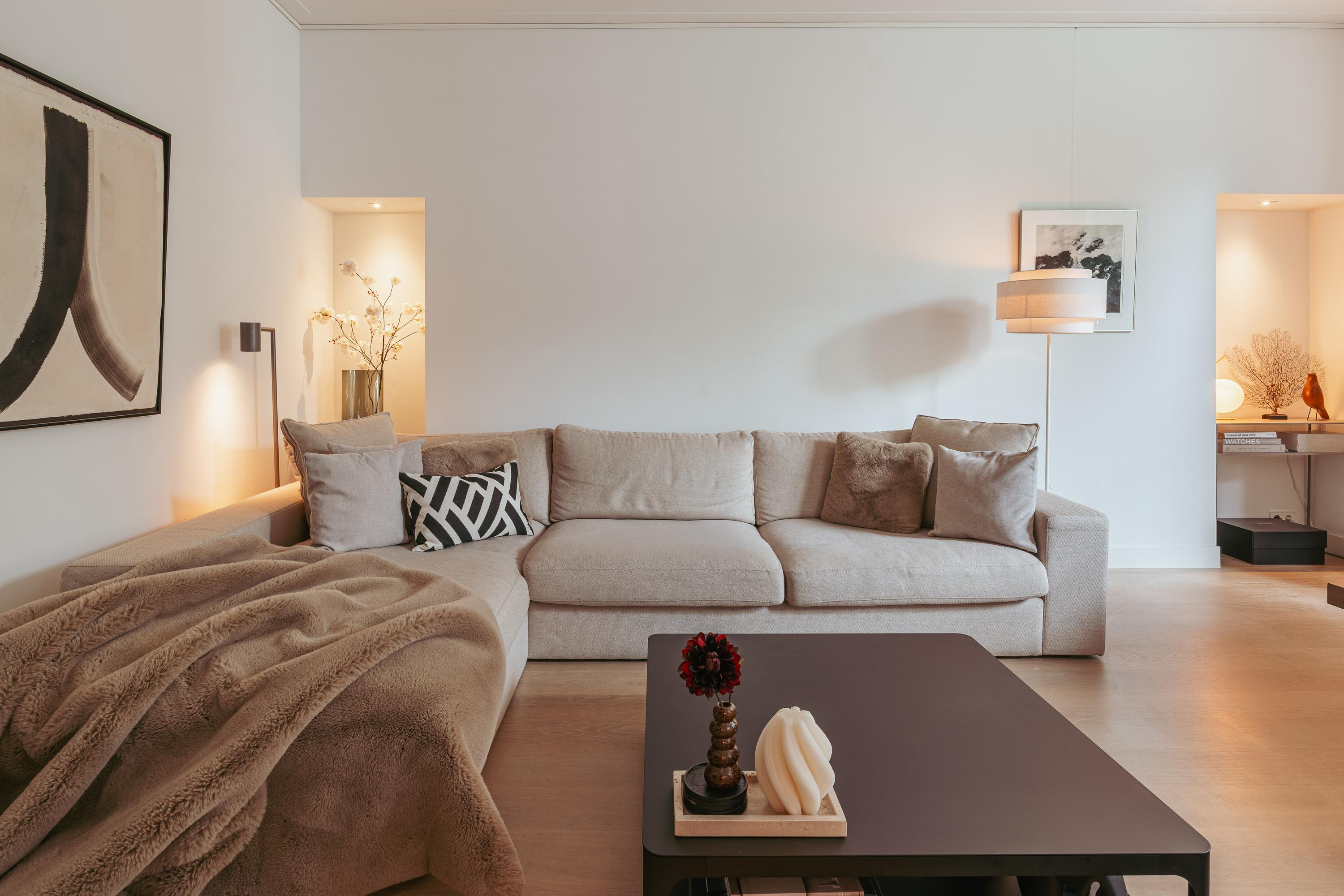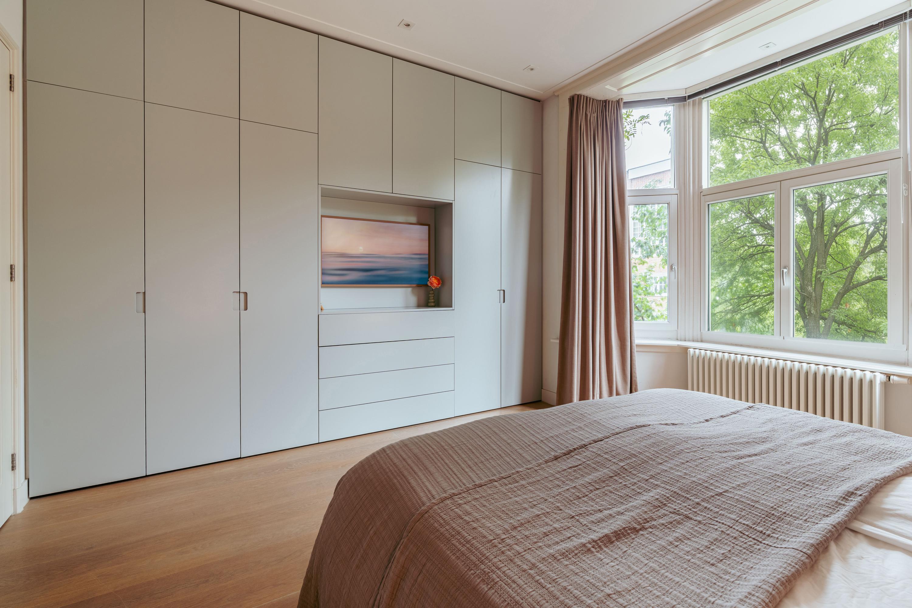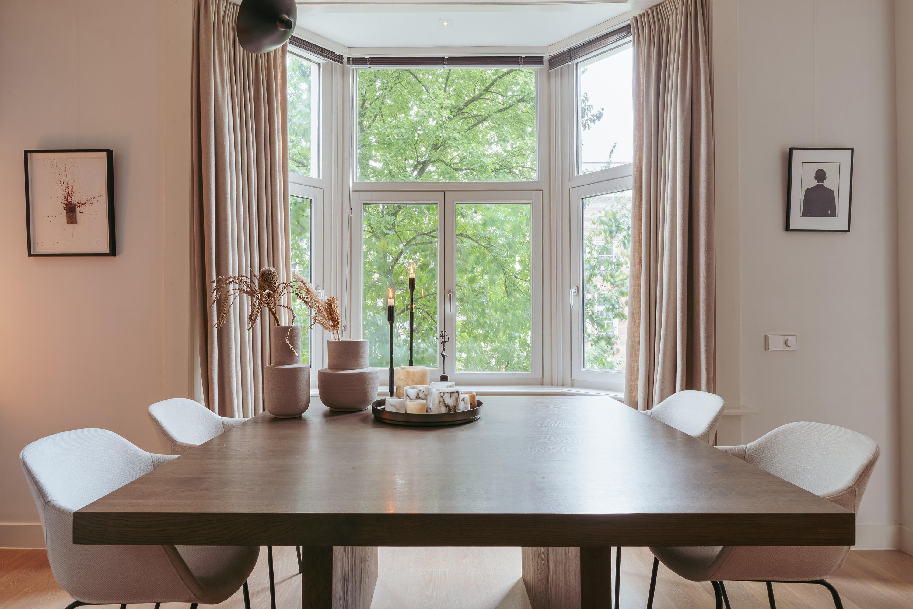The apartment is located on the second floor, where the high ceilings and authentic features of the Amsterdam School style immediately catch the eye. You enter into the modern, sleekly finished kitchen, equipped with high-quality built-in appliances: a five-burner gas stove with extractor, combi-oven, fridge-freezer, dishwasher, and Quooker. Large, decorative windows allow plenty of natural light to flow in, creating an elegant and inviting atmosphere. The adjoining living area offers ample space for a generous sitting area and a large dining table. The charming niches with built-in spotlights and the characteristic bay window with tilt-and-turn windows add extra character to the room and provide a lovely green view over De Lairessestraat.