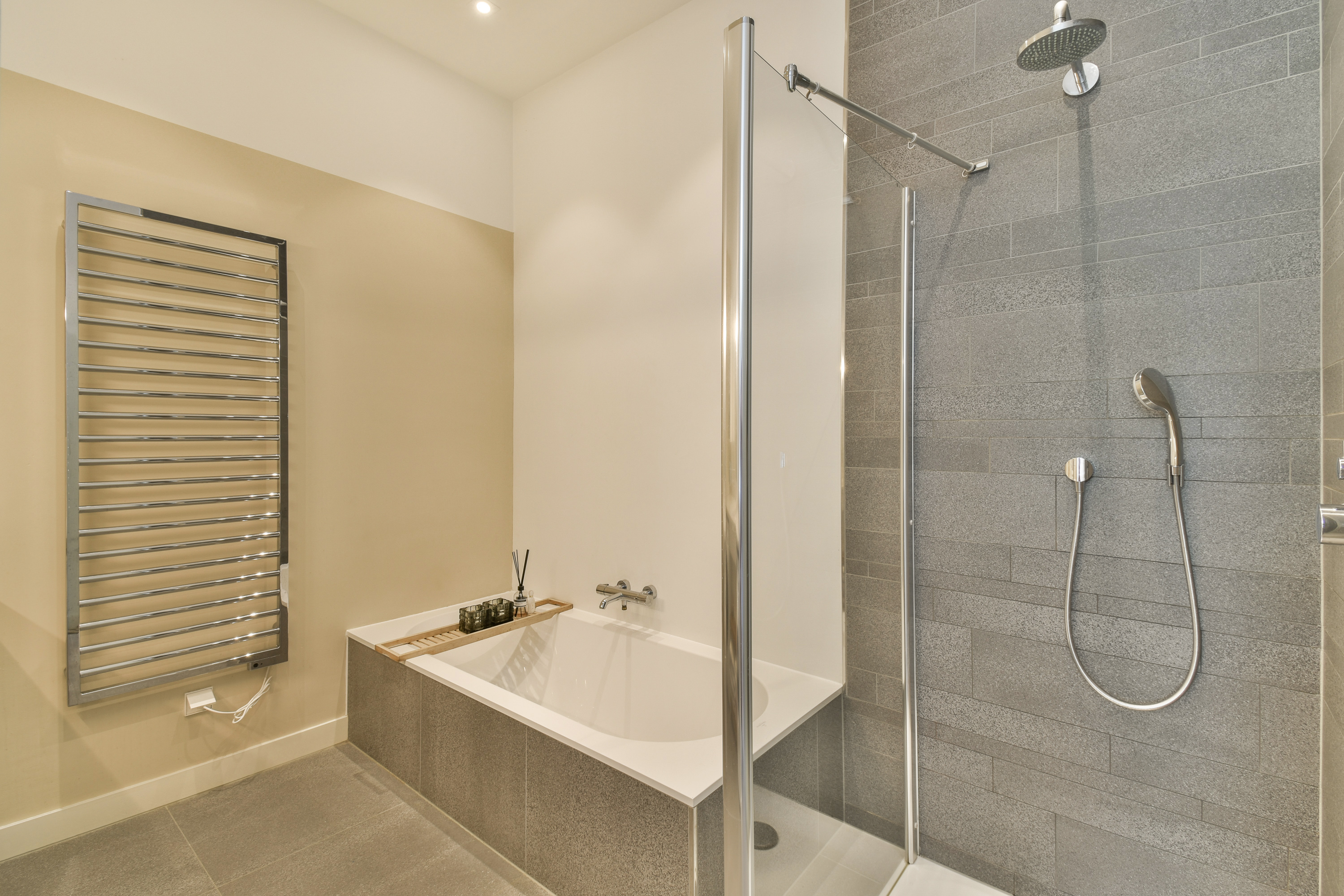 On the right-hand side of the apartment lies the well-proportioned bedroom, fitted with custom-made, ceiling-high wardrobes that also provide space for a built-in television. Here too, a bay window brings in abundant daylight and enhances the sense of space. The en-suite bathroom is equipped with a bathtub, walk-in shower, washbasin cabinet, and connections for a washing machine and dryer. Next to the bathroom is a separate toilet with a small washbasin.