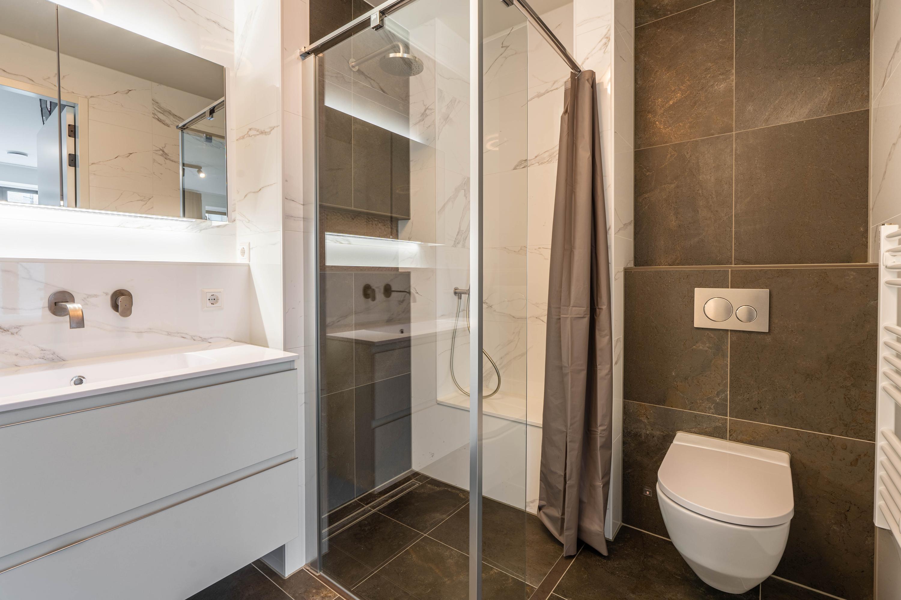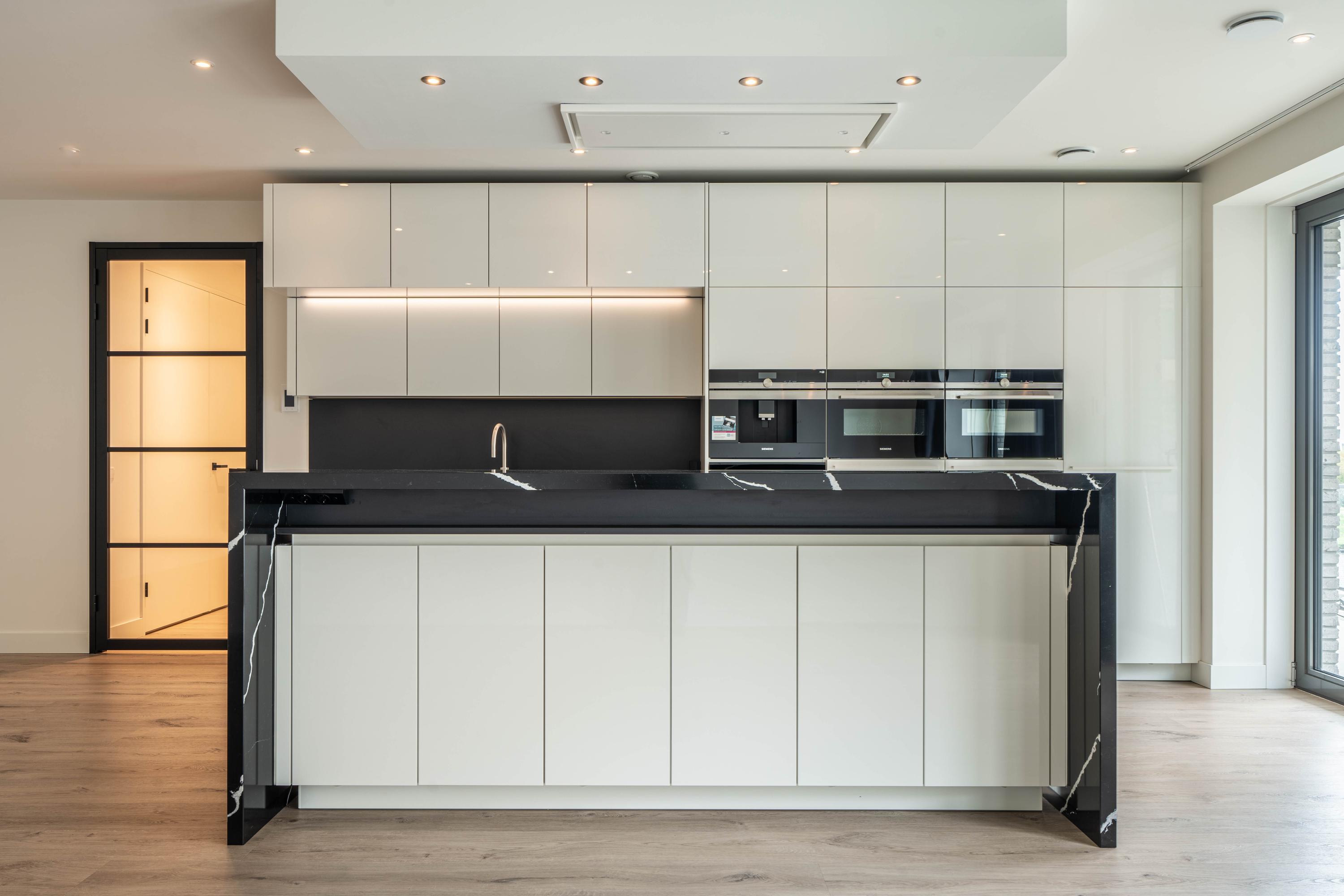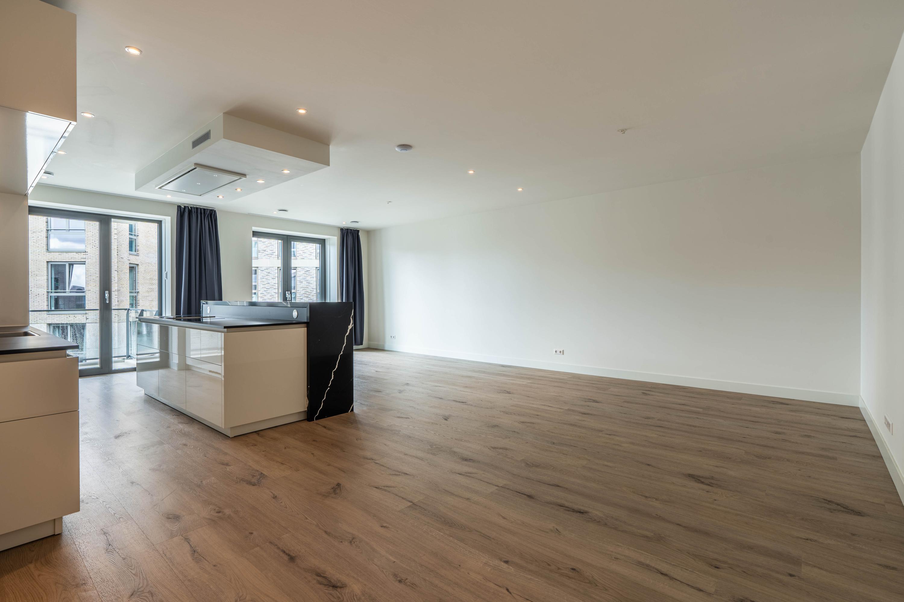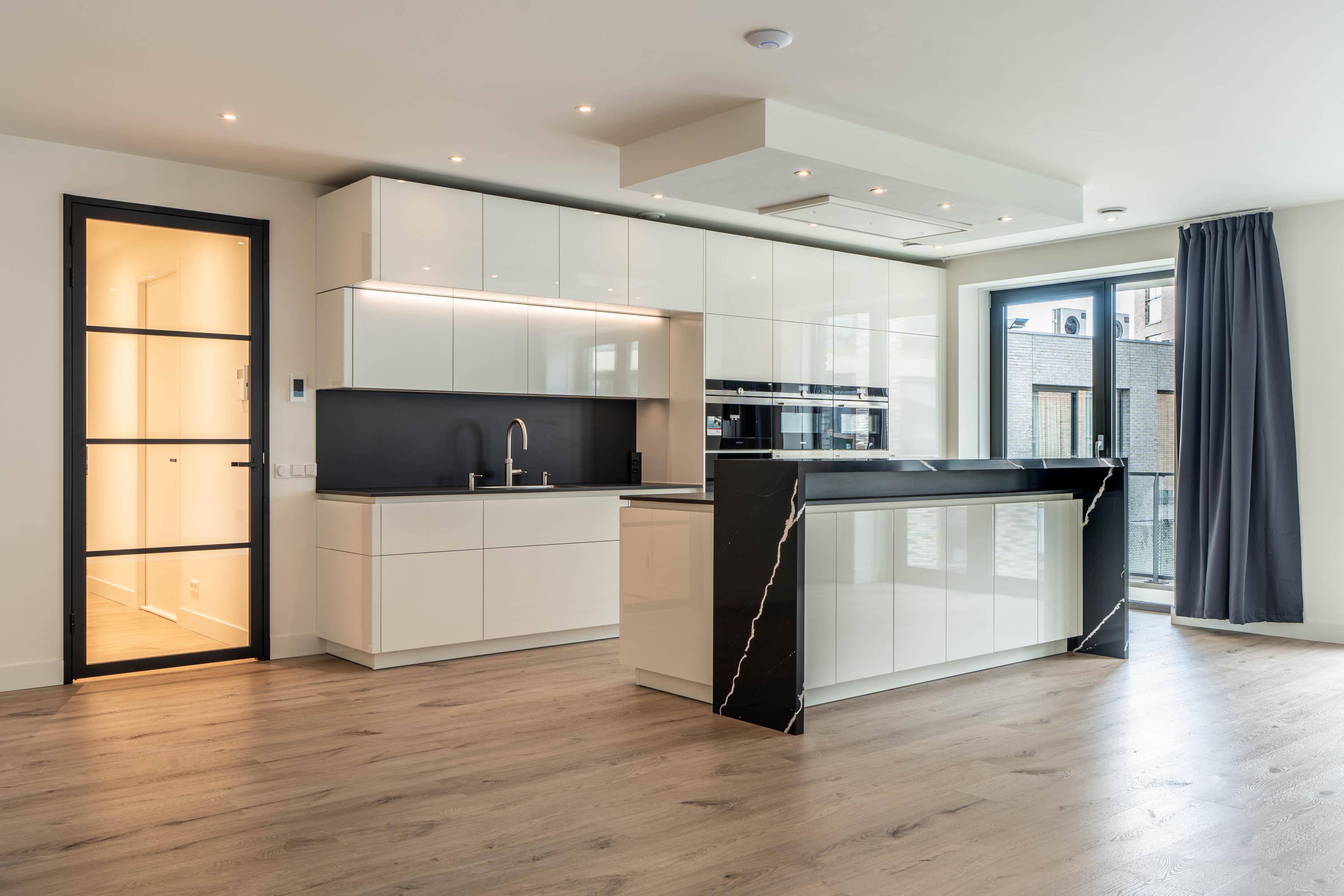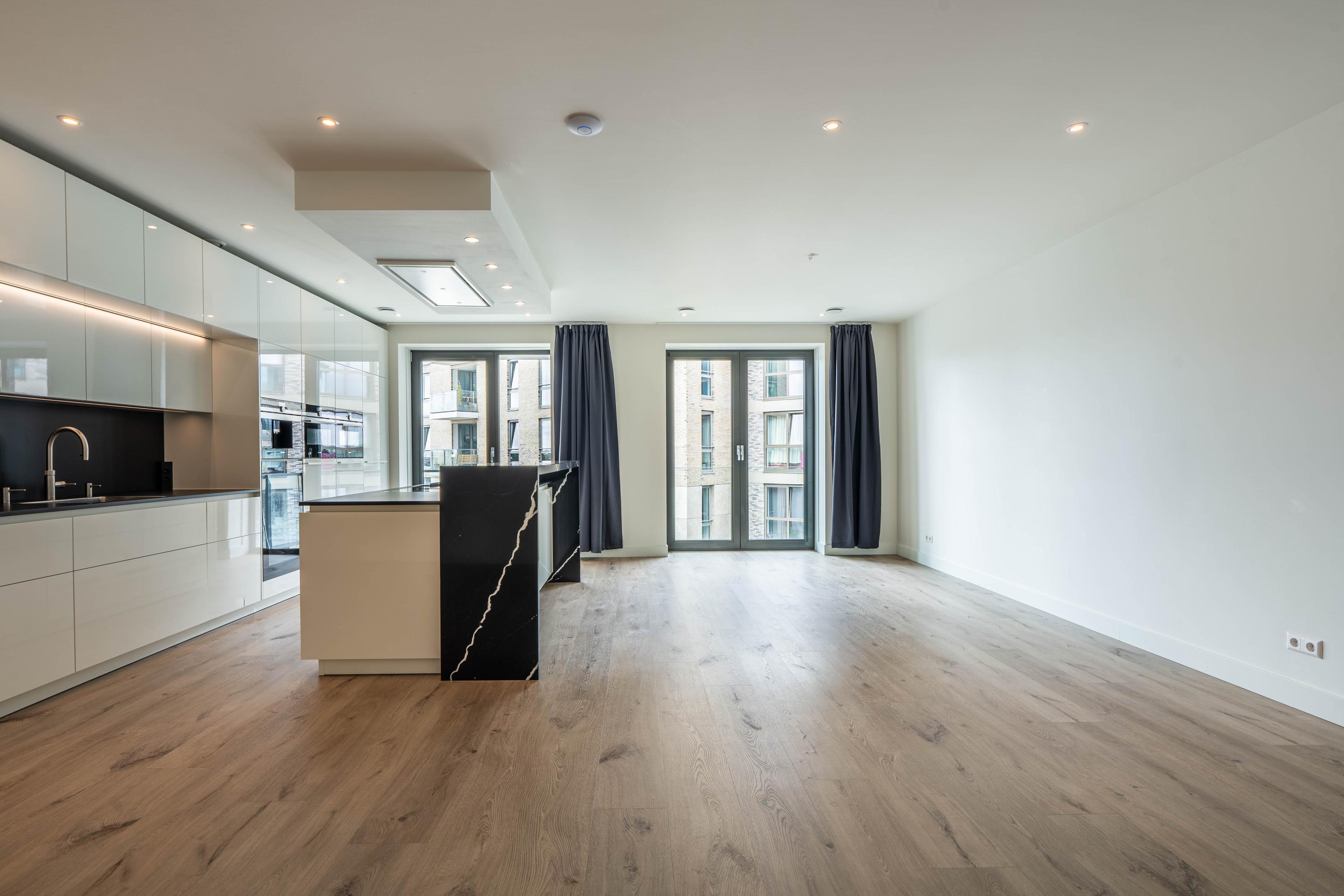 Private entrance with spacious hallway, guest toilet with washbasin, and technical room with space for cloakroom. From the hallway, the bright and spacious living room is accessible and features a luxurious kitchen with cooking island and breakfast bar. The kitchen is fully equipped with an induction hob with downdraft extractor, combi-oven, steam oven, coffee machine, dishwasher, fridge-freezer, and Quooker. The living room provides access to the large balcony.