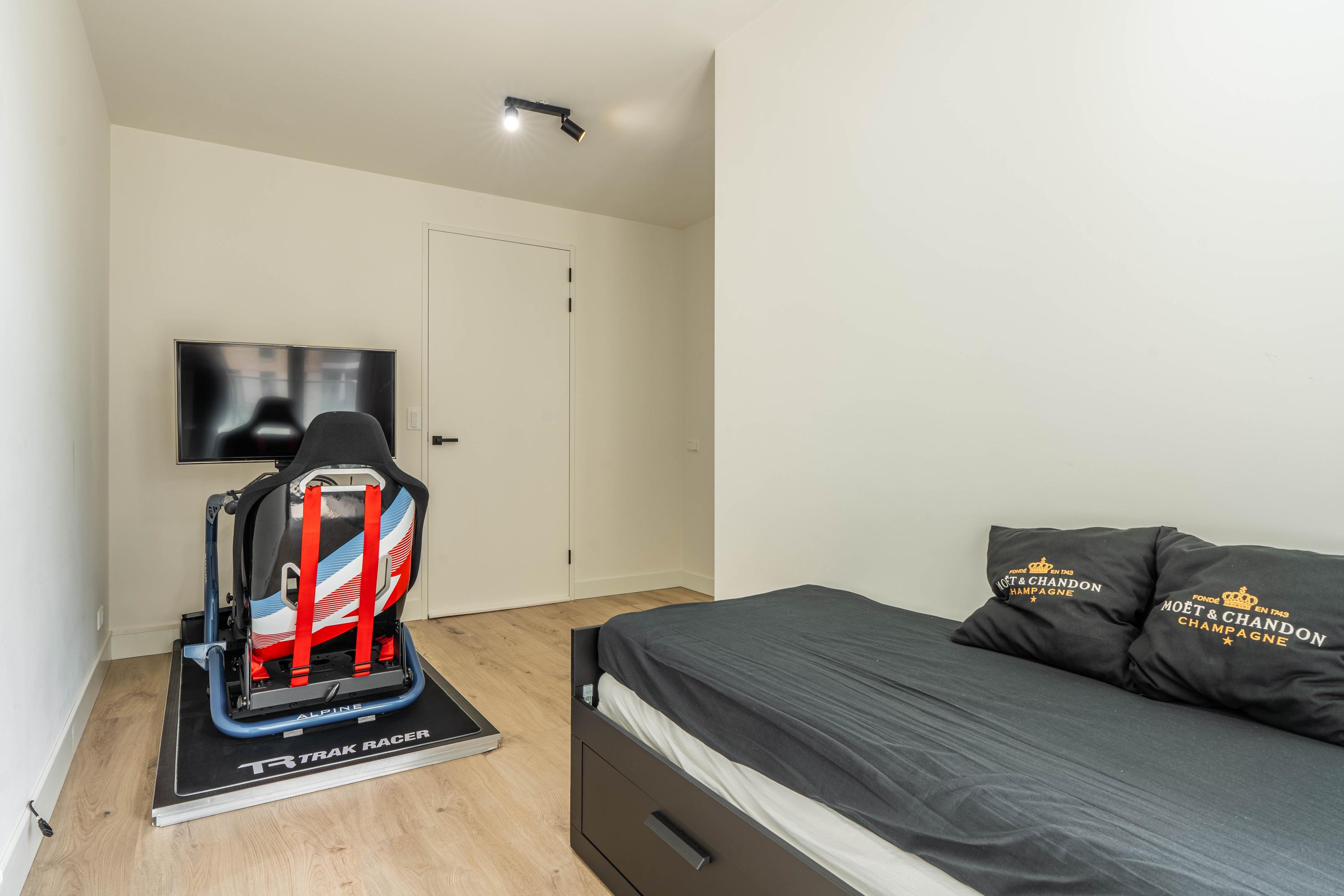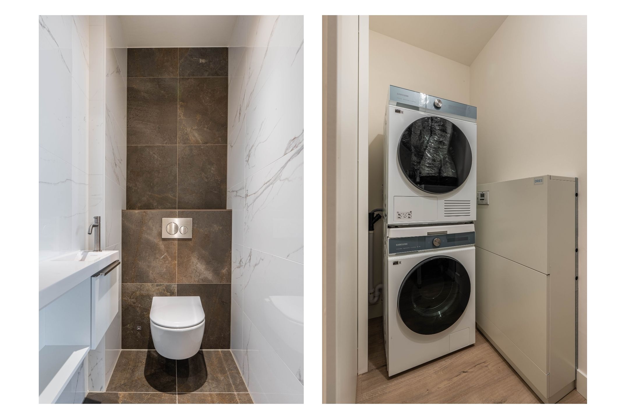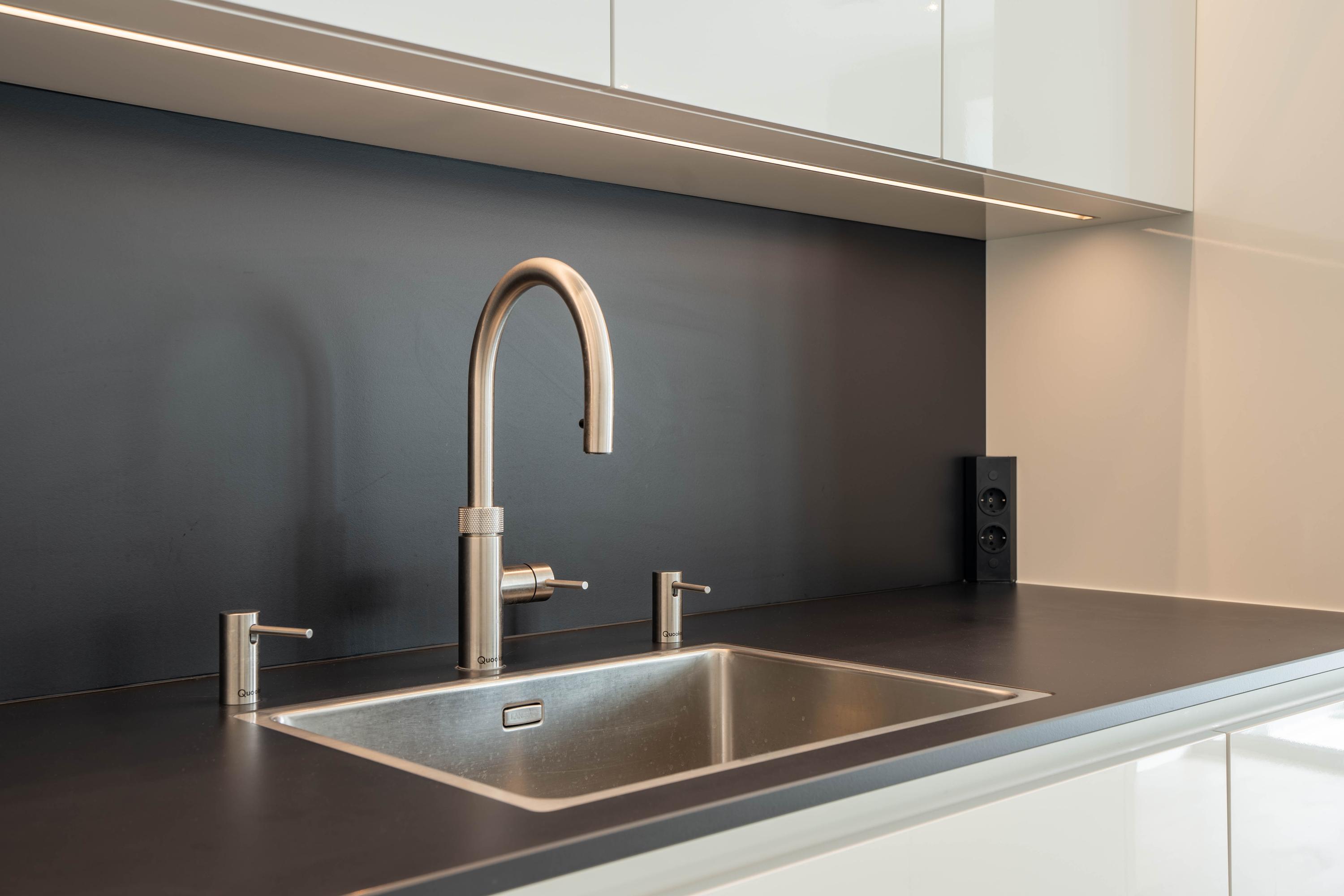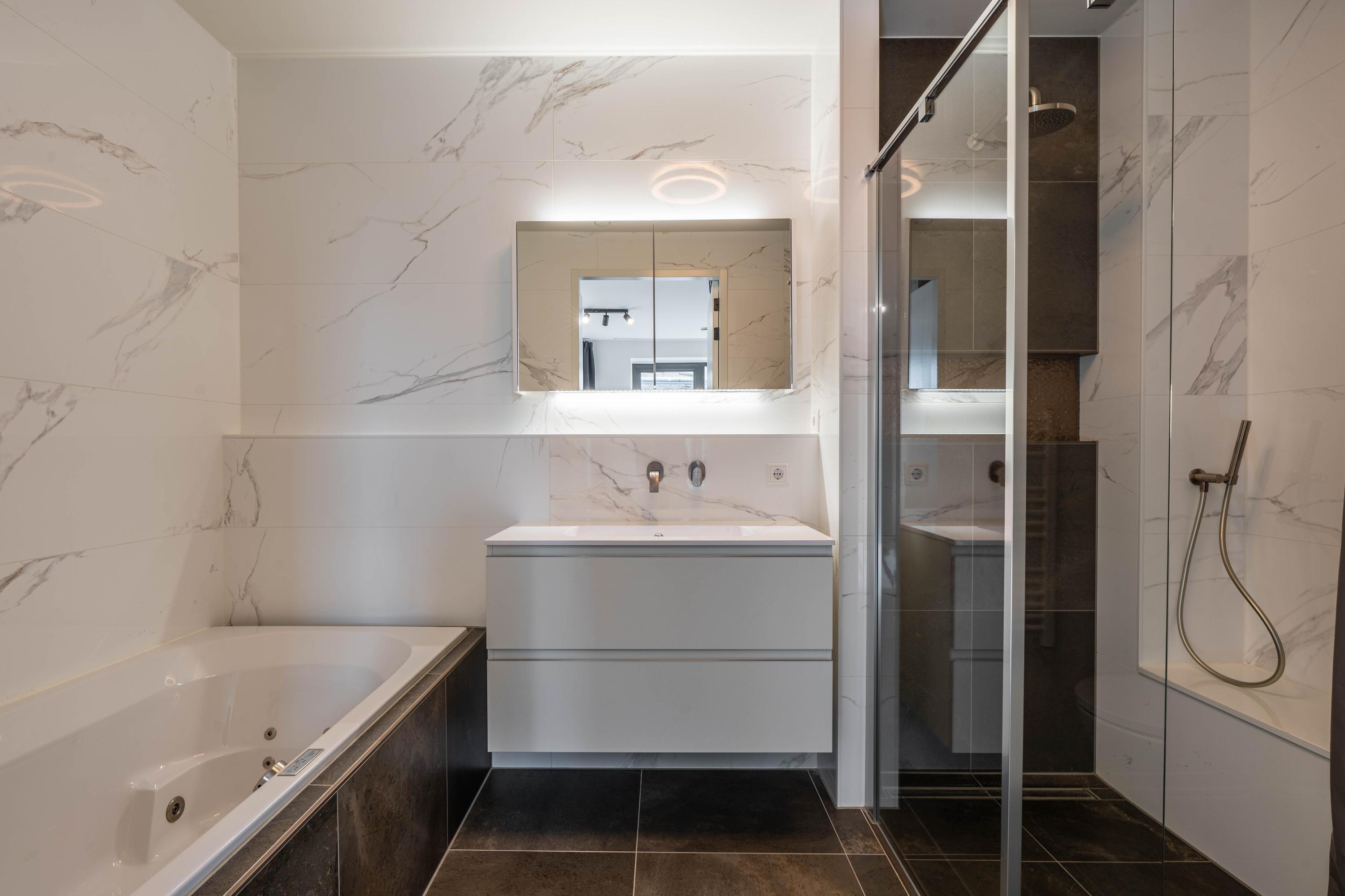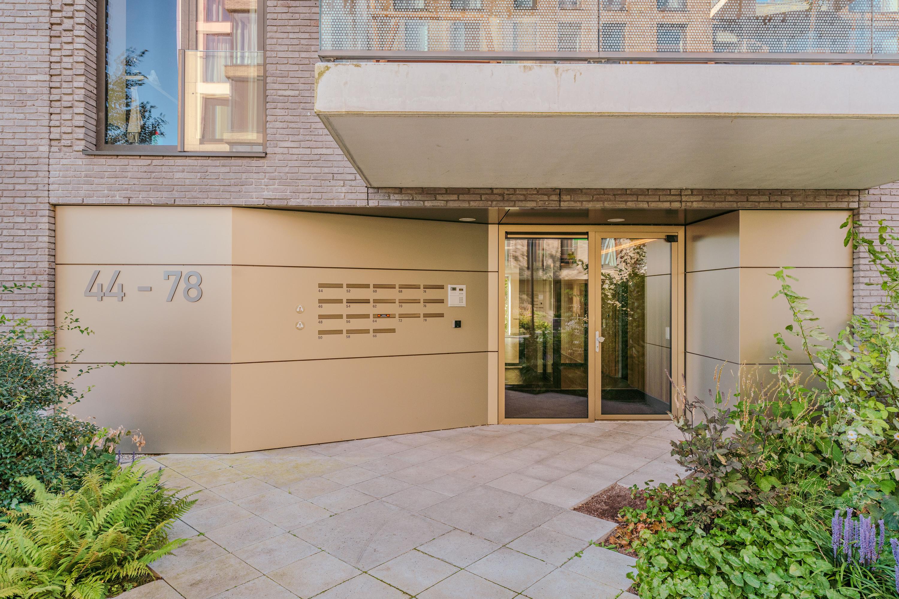 Private entrance with spacious hallway, guest toilet with washbasin, and technical room with space for cloakroom. From the hallway, the bright and spacious living room is accessible and features a luxurious kitchen with cooking island and breakfast bar. The kitchen is fully equipped with an induction hob with downdraft extractor, combi-oven, steam oven, coffee machine, dishwasher, fridge-freezer, and Quooker. The living room provides access to the large balcony.