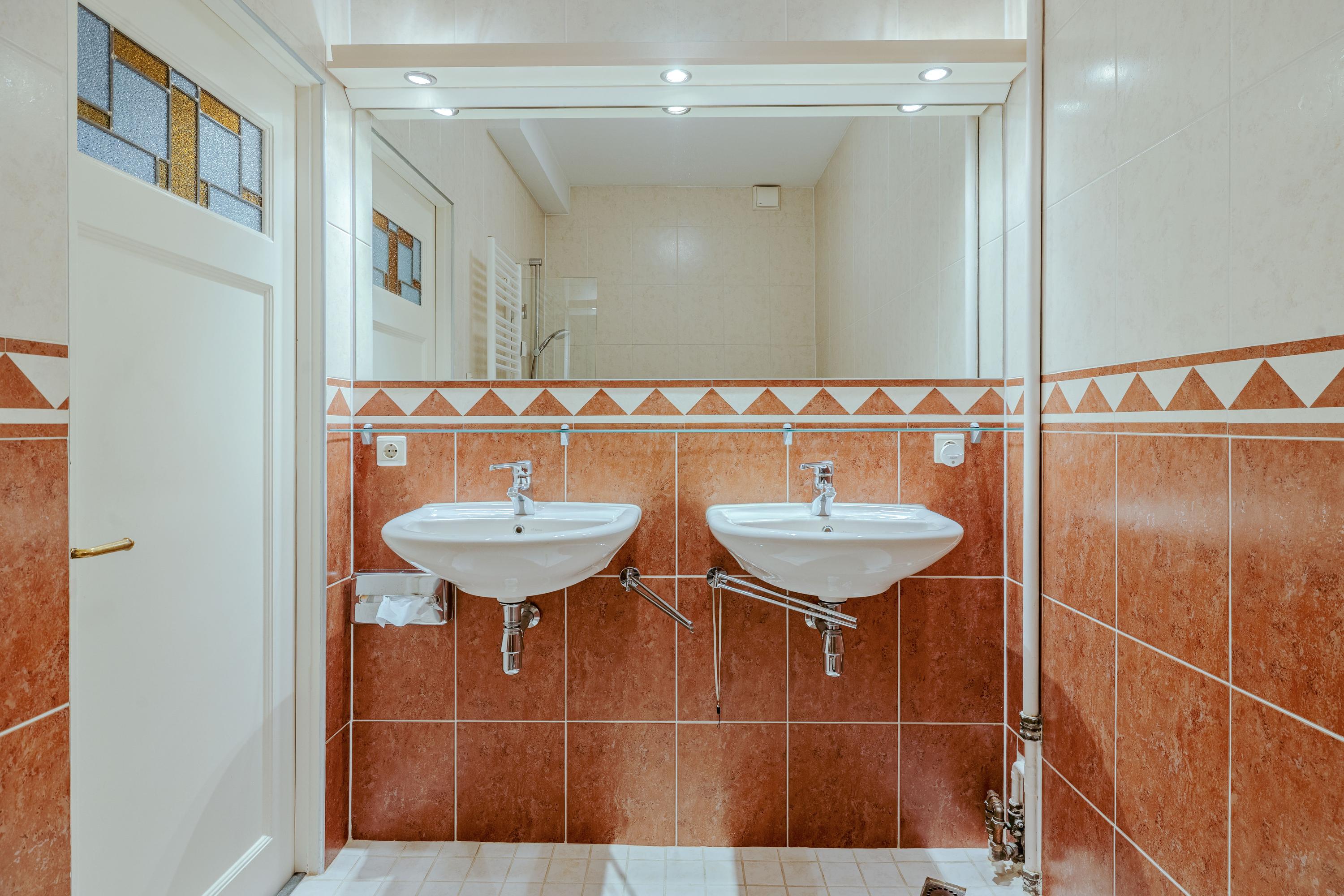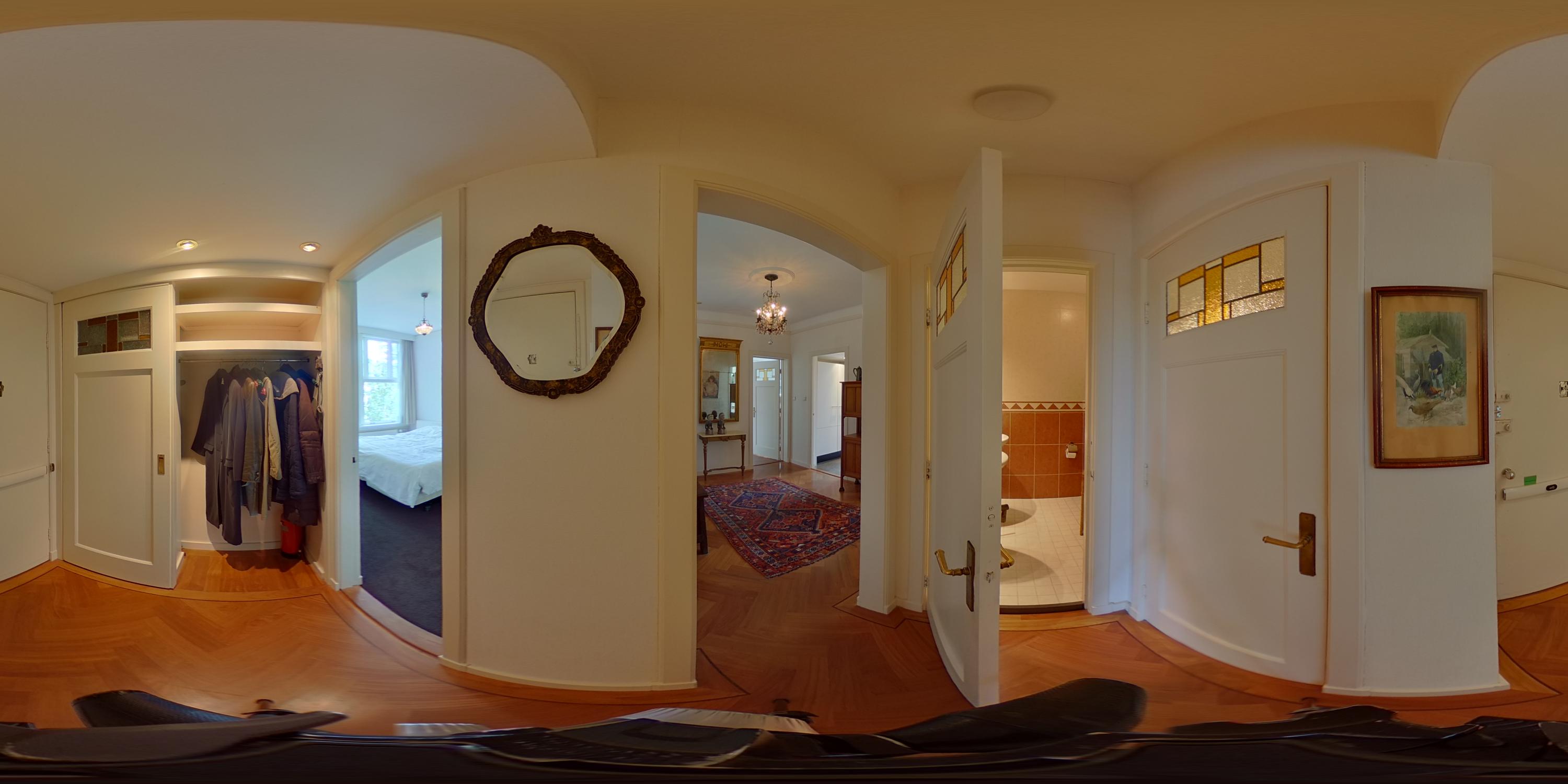 Spacious entrance hall providing access to all rooms. There is a coat closet in the hall, along with the meter cupboard and a separate toilet with a small sink. At the front, a generously sized bedroom features a walk-in closet and several built-in wardrobes. At the rear, the large main bedroom opens through French doors onto the west-facing balcony, offering views of the beautifully landscaped and well-maintained inner gardens of Minervalaan and Michelangelostraat.
