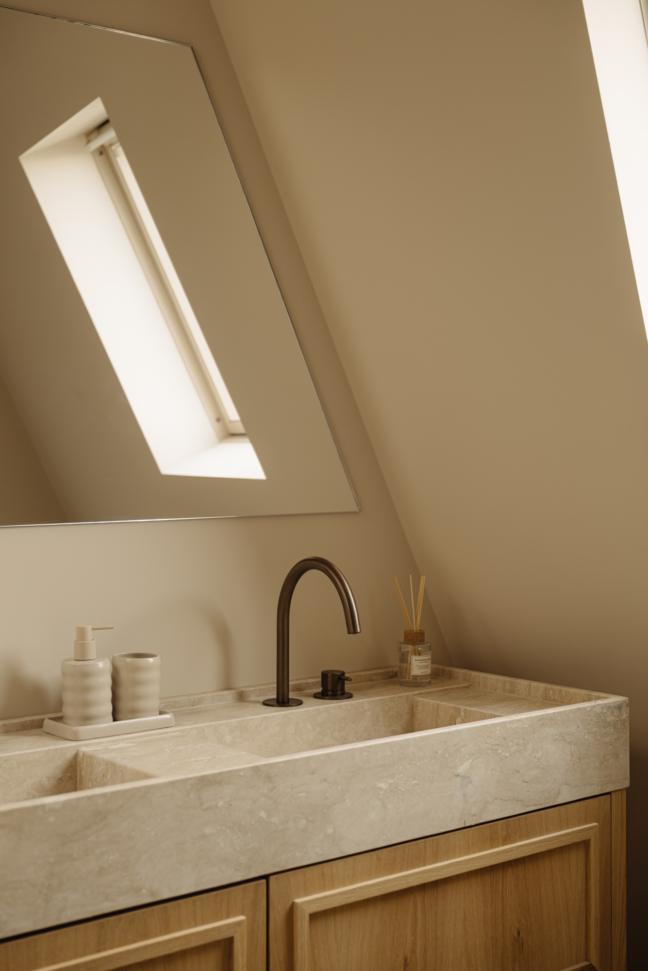 The apartment has been fully renovated to the highest standards, using rare, premium materials such as natural stone. The practical layout includes a spacious living room with ceilings reaching 3.44 metres, a modern open-plan kitchen with integrated appliances, and a private bedroom with en-suite bathroom on the lower level. Large windows flood the space with natural light, allowing the carefully designed interior to shine and enhancing the historic surroundings.