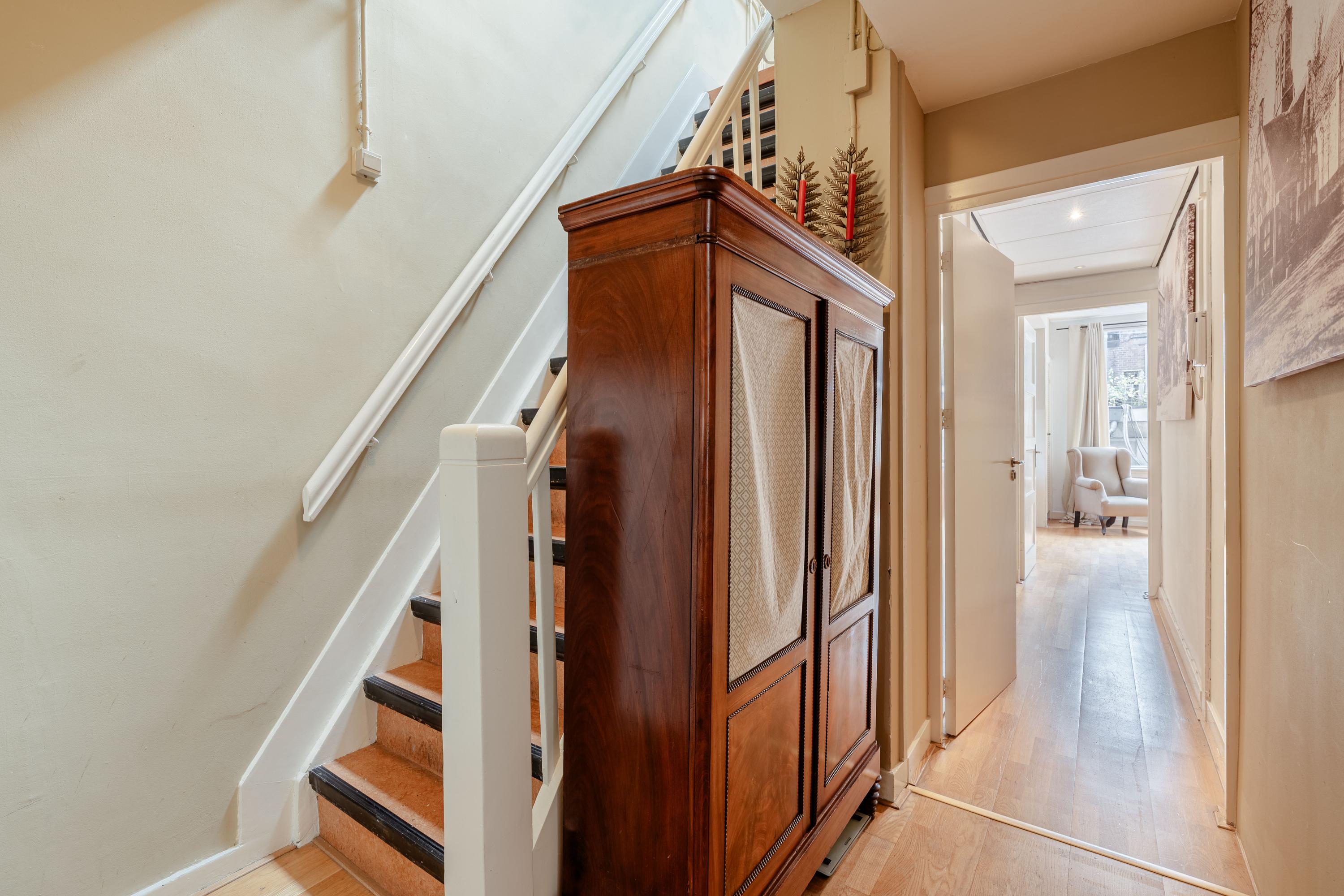 The entrance to the property is directly on the Prinsengracht, next to Brooklyn Antiques. Through the characteristic wooden front door with stained-glass transom window, you enter the shared hallway. The staircase leads to the first floor, where the entrance to the apartment is located.
