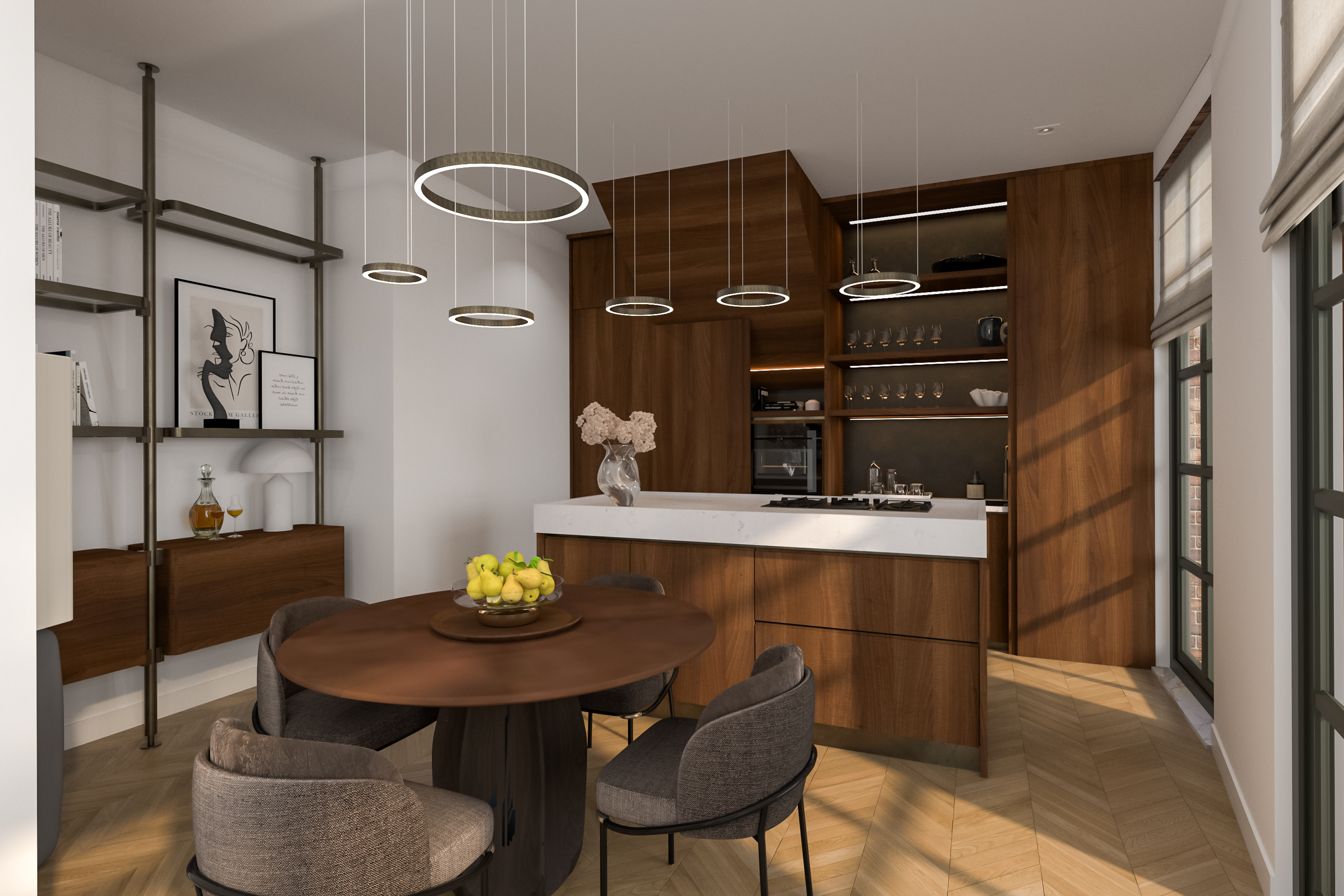 The building consists of five floors and will be divided into a generous ground-floor and upper-level apartment. This ground-floor residence has its own private entrance, an impressive main level and a fully functional basement – together offering approximately 100 m² of living space. With its waterside location and large windows, the apartment is filled with natural light and offers a unique living experience.