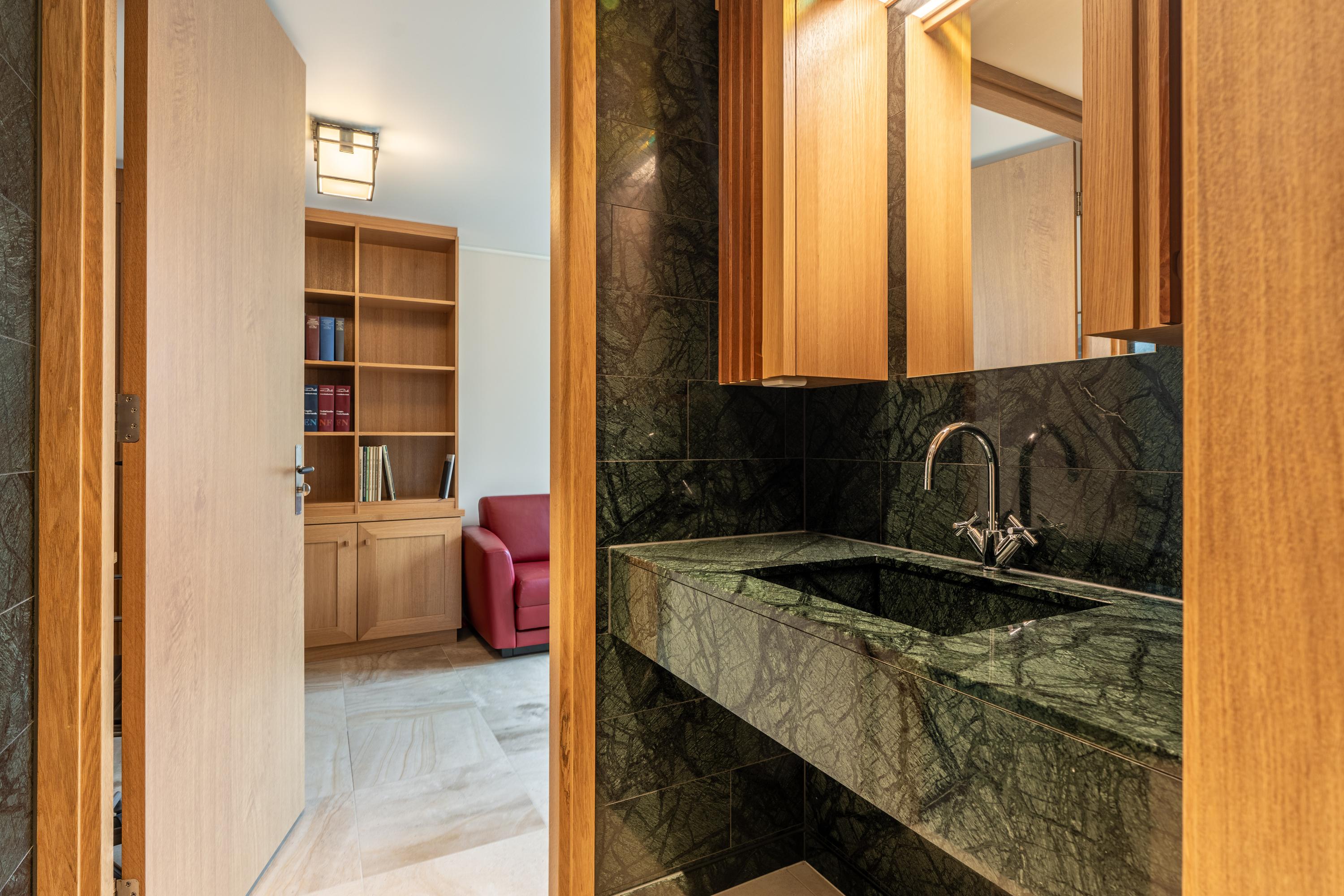 The primary bedroom, located in the northwest corner, includes spacious built-in wardrobes, air conditioning, built-in speakers, and an en-suite bathroom. The bathroom features exquisite green marble, a double vanity unit, a bathtub with a showerhead, a toilet, and a walk-in shower.