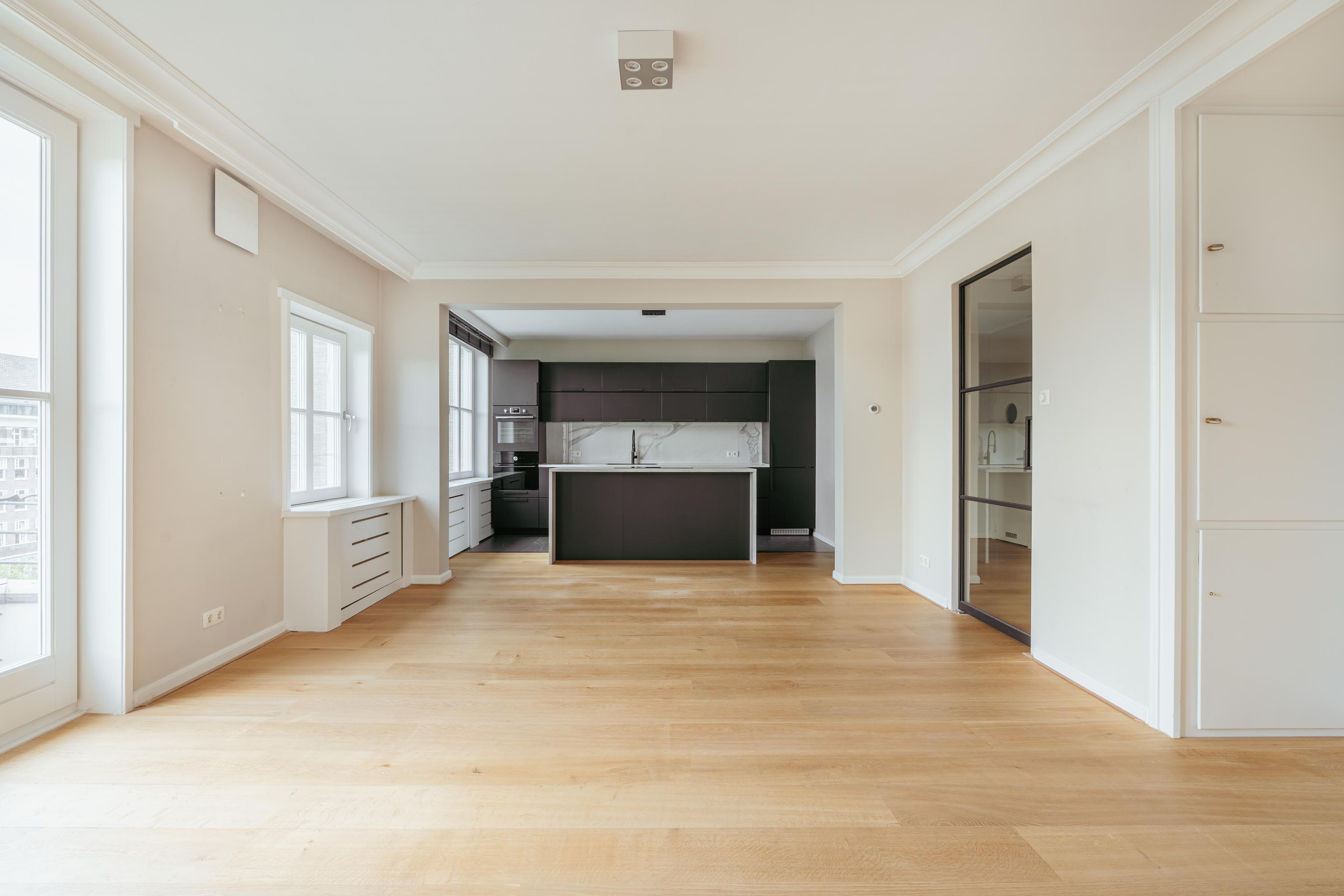 The entrance opens into a spacious hallway providing access to all rooms. At the front is the bright and spacious living area with an inviting open-plan kitchen. This living and cooking space features built-in cupboards, air conditioning, and French doors opening onto a charming south-facing balcony. The modern open kitchen is equipped with various high-quality built-in appliances and a central cooking island with a cosy breakfast bar. Here you will find an induction hob with integrated extraction system, a combi oven, dishwasher, fridge, and freezer.