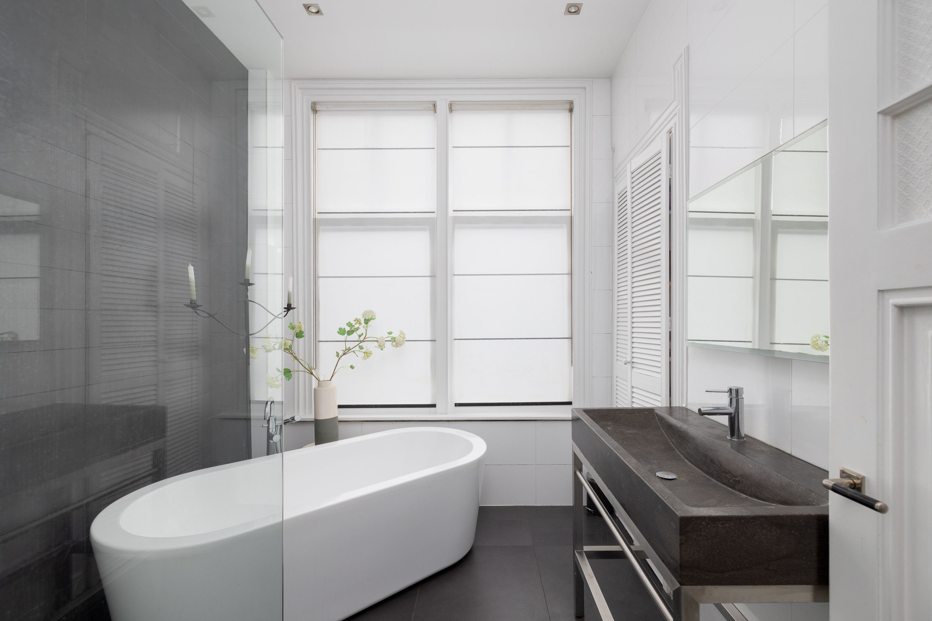 On the landing, you will find a separate toilet with a sink. From the landing, you have access to the spacious through-living room. At the front of the living room, there is enough space for both a formal sitting area and a cozy TV corner. There is also a beautiful balcony with a view of Valeriusstraat and Amstelveenseweg. At the rear of the house is the dining area, open kitchen with island, and a French balcony. The kitchen is equipped with a 5-burner gas stove, oven, microwave, and a fridge/freezer combination. Due to the abundance of glass and the ceiling height of 3.07 meters, this floor is particularly light and spacious.