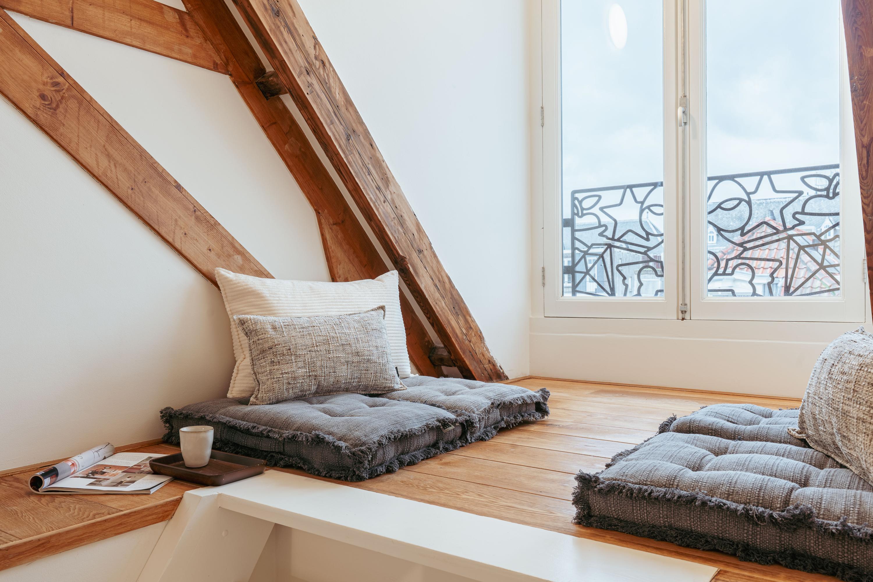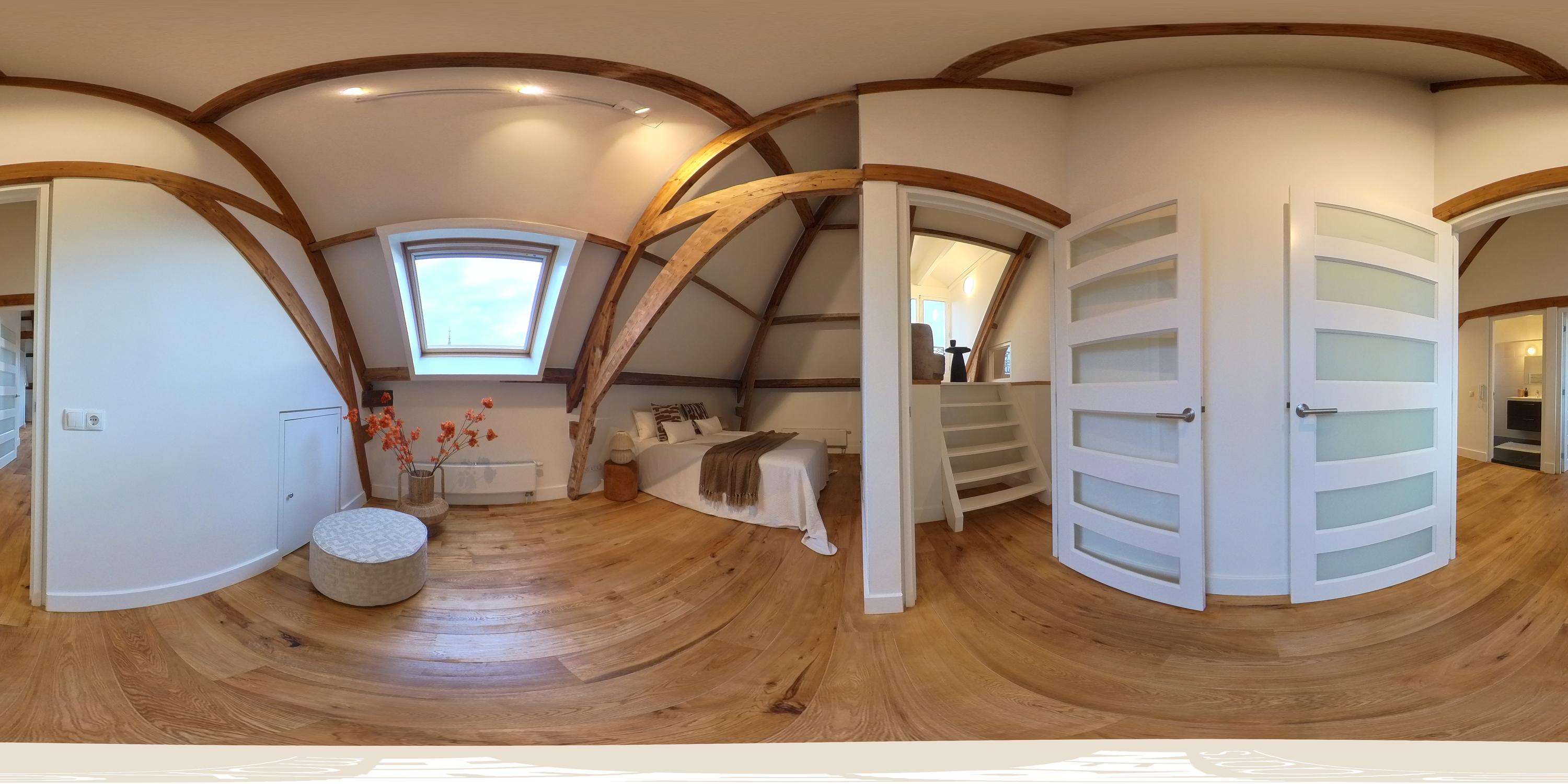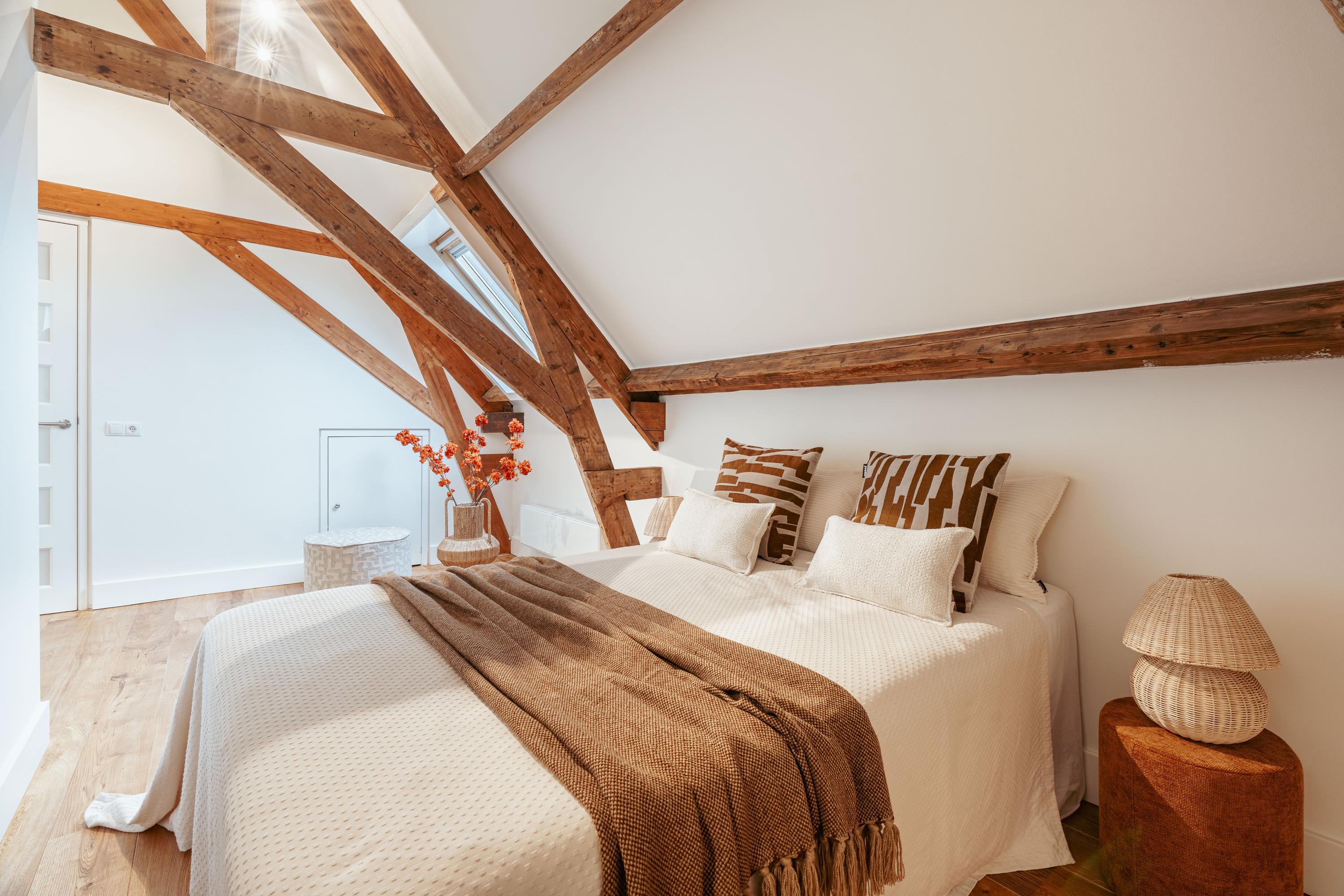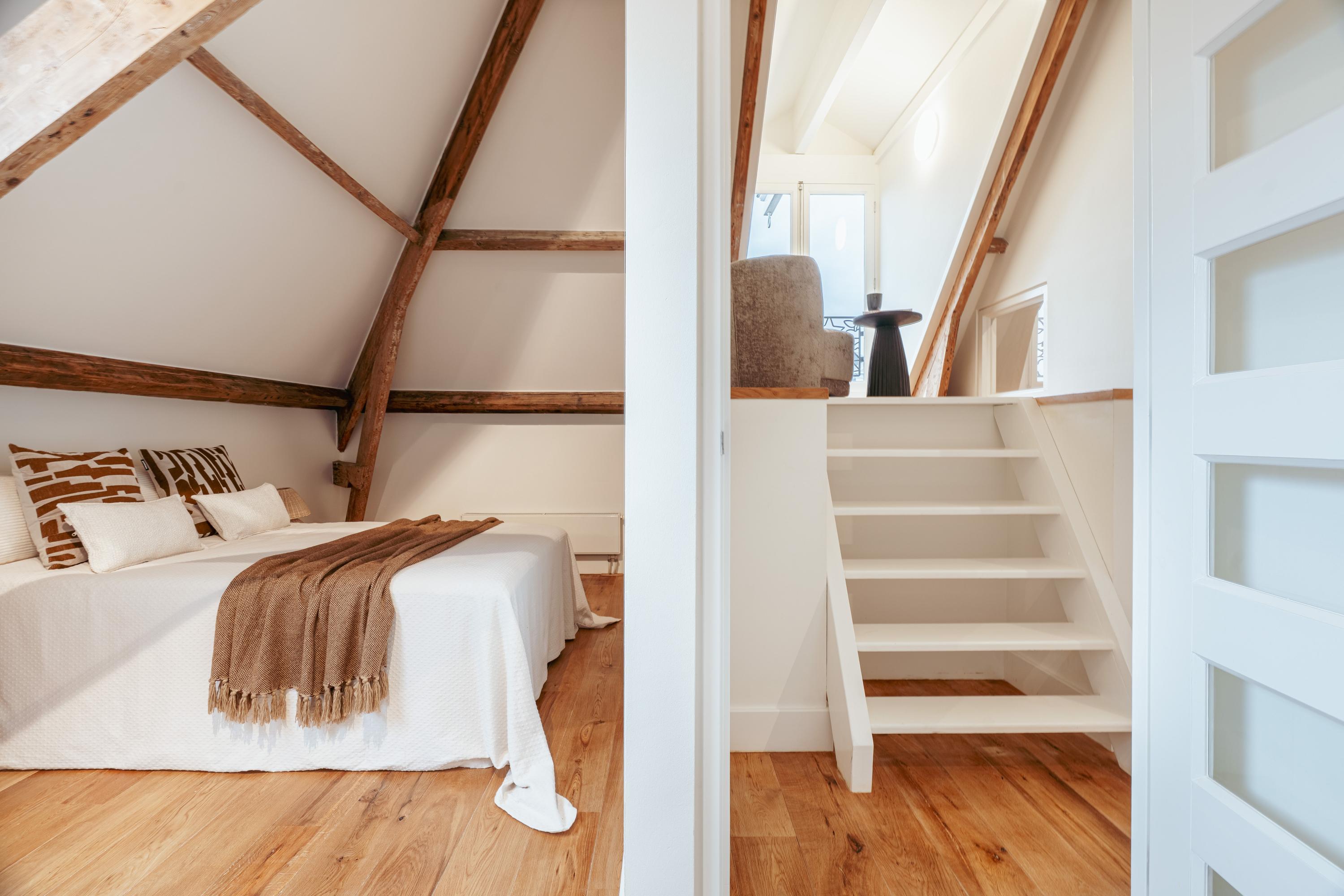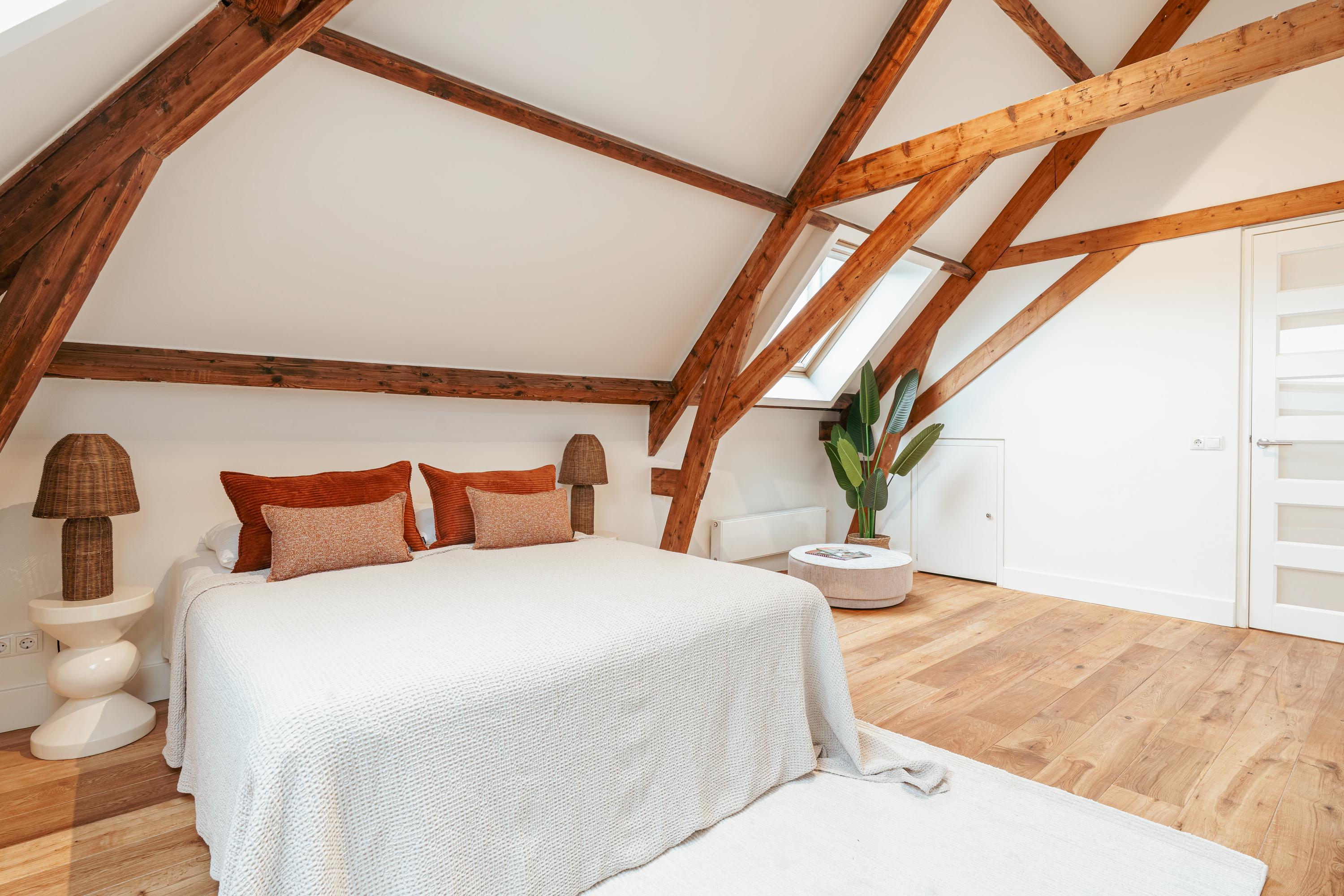 A special and playful feature is the two mezzanines between the rooms — inviting spots for reading or enjoying a cup of coffee. Under these mezzanines are integrated storage cupboards. A small portion of this floor has a ceiling height below 1.5 metres, fitting with the characteristic roof shape. Throughout all rooms, authentic beams remain visible, contributing to the charm of the home.