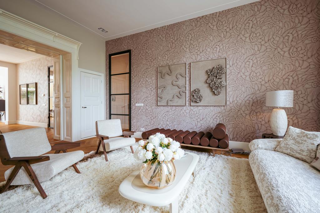 Adjacent to the dining room is a versatile room, perfect as a guest bedroom or home office. The entire floor boasts premium finishes with elegant wallpaper, enhancing its warmth and character. Large windows on both sides ensure exceptional natural light and emphasize the floor’s sense of space and luxury.