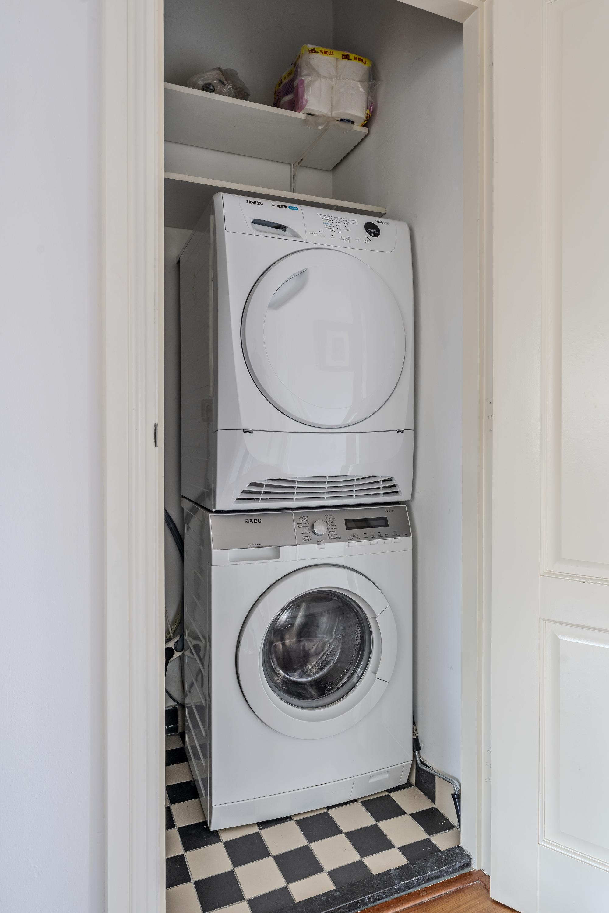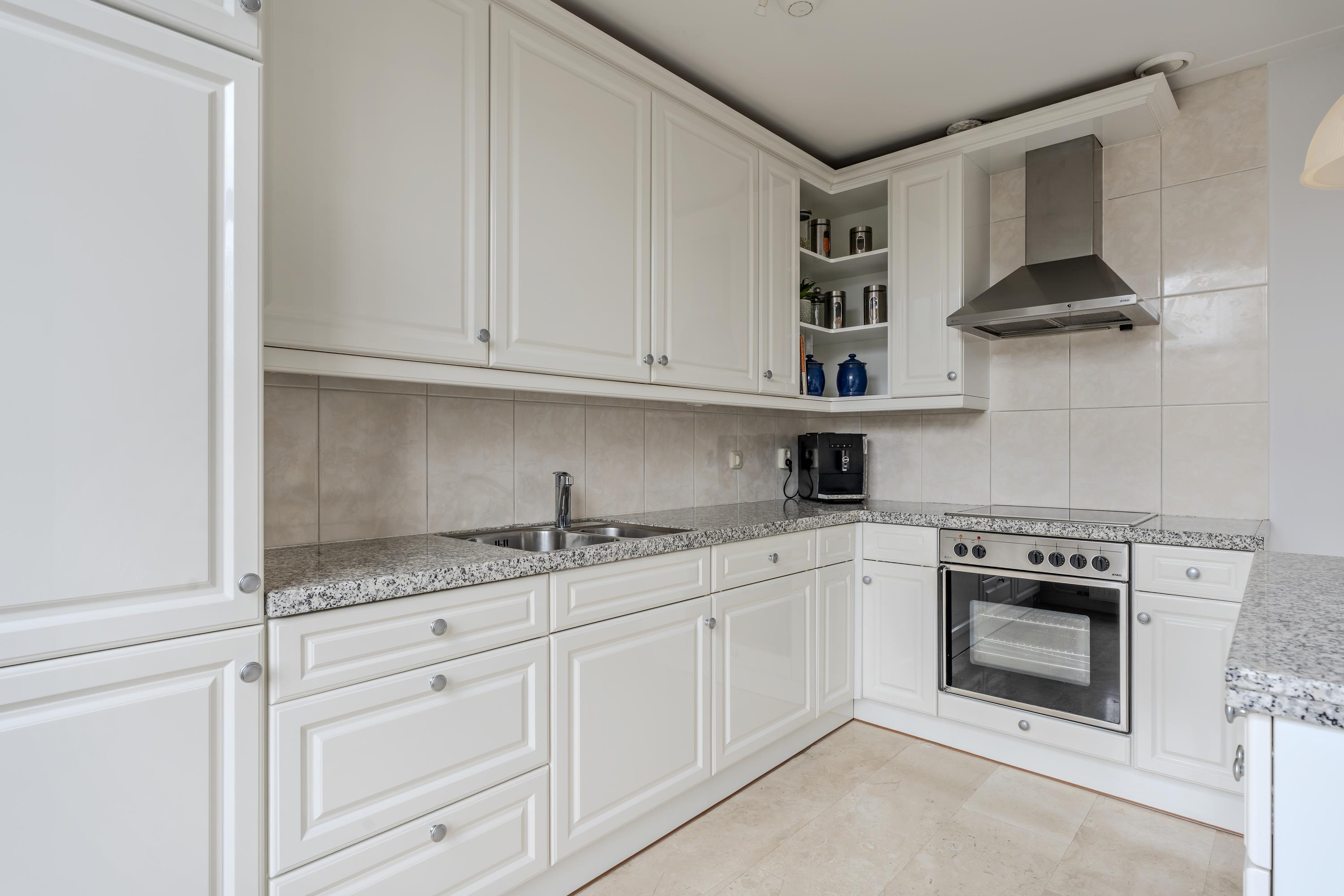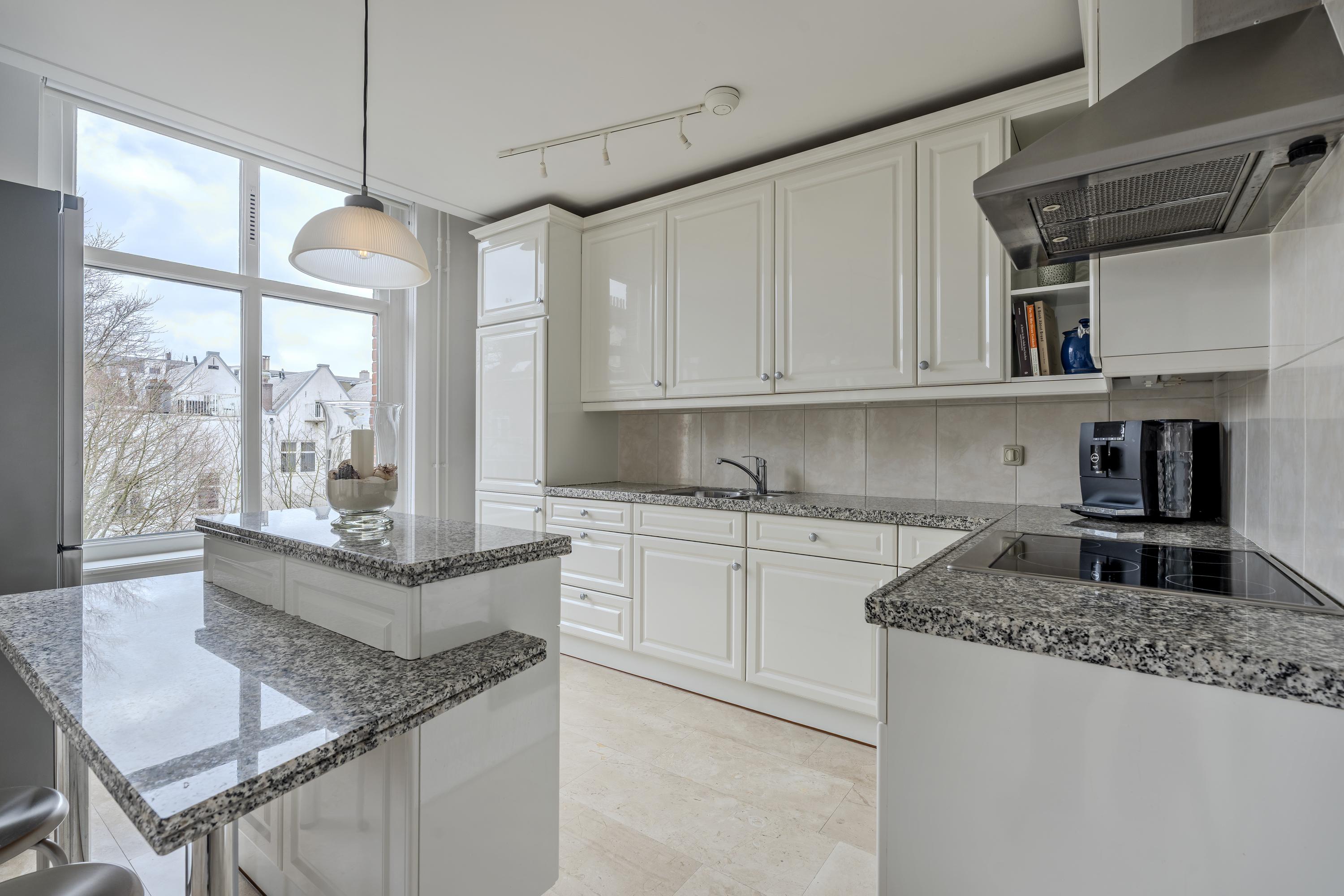 At the rear of this comfortable apartment, the dining room with an open kitchen is located, equipped with a kitchen island, a four-burner electrical cooktop with an extractor hood, a dishwasher, a fridge-freezer combination, and a wide oven. The dining room also provides access to a delightful south-east facing balcony of approximately 4 m², complete with sunshading. You can even see the Rijksmuseum!