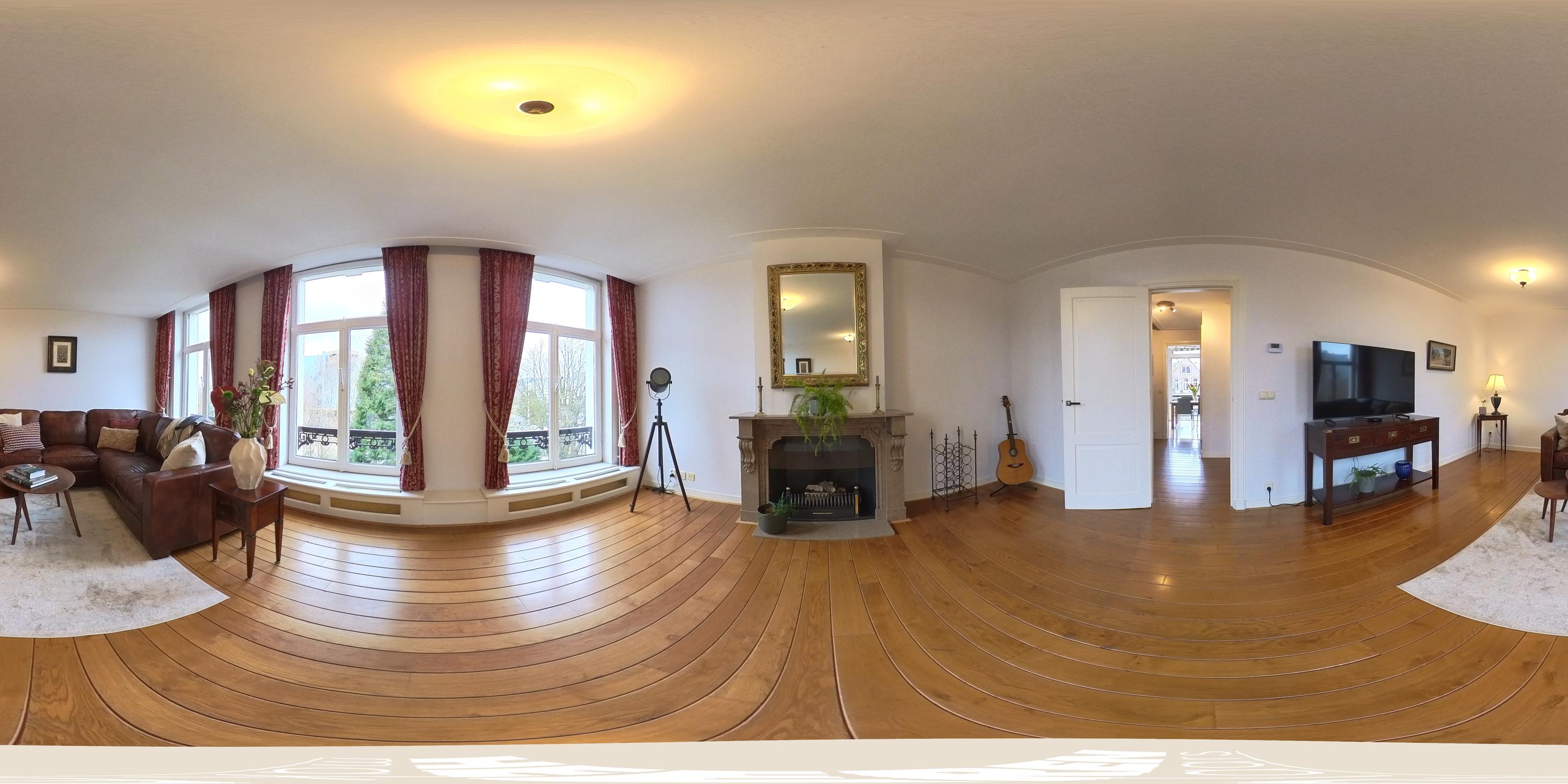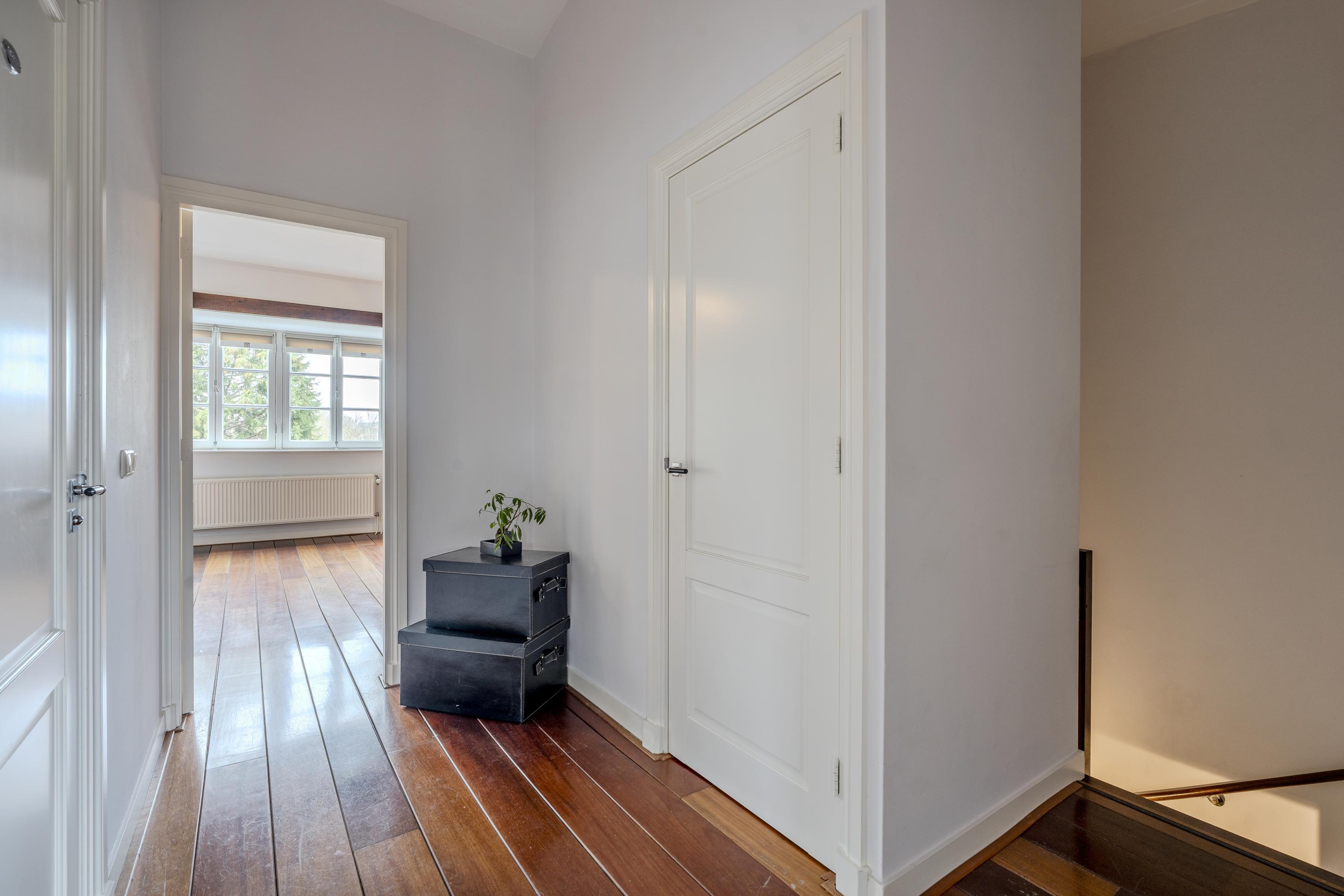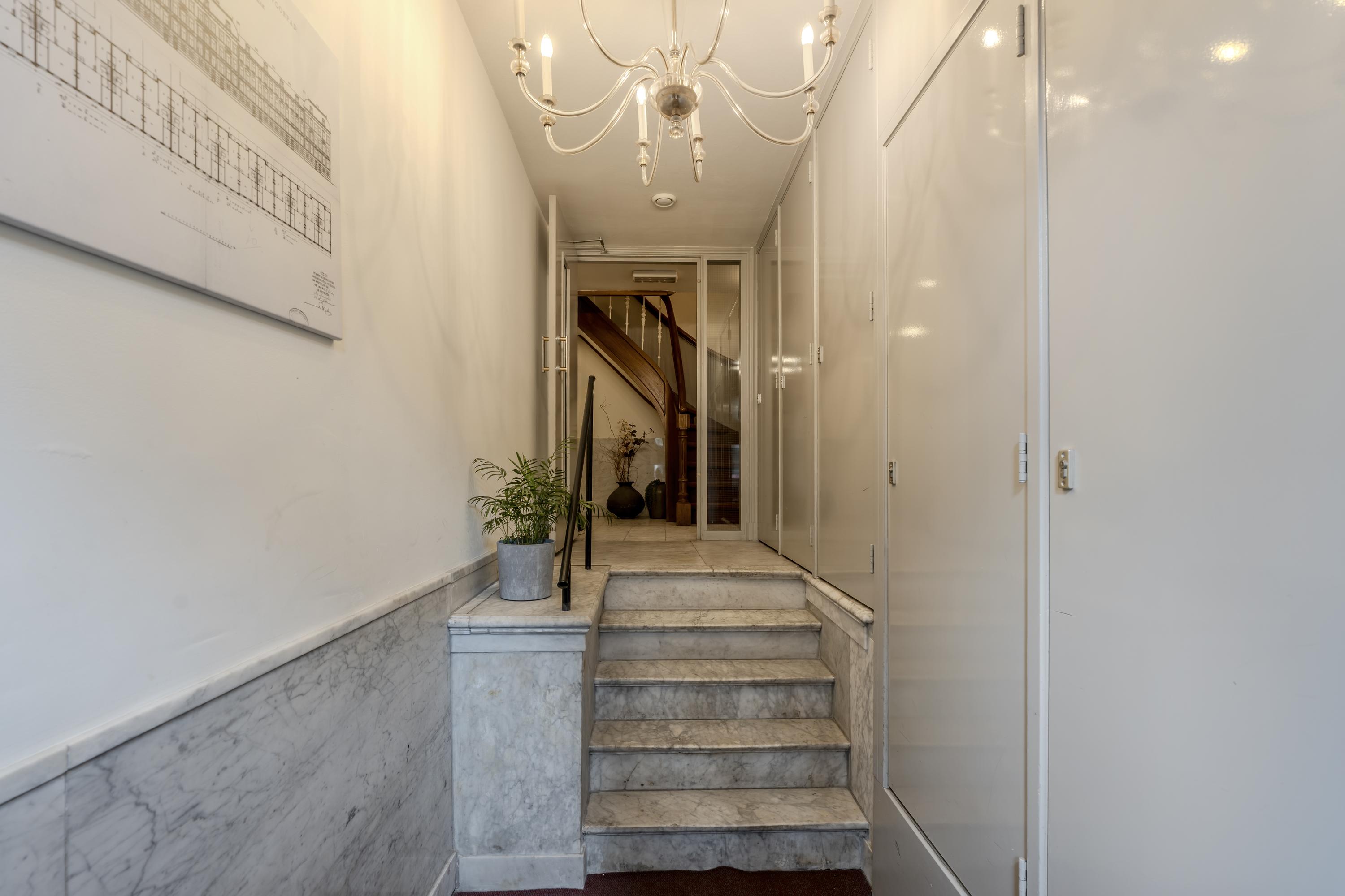 Entrance on the third floor. From the central hall, you have access to all rooms. At the front of the apartment, you will find the very spacious living room with a cozy fireplace and large windows, each featuring a French balcony. From here, you can enjoy breathtaking views over the lush greenery of the Vondelpark and the Singelgracht.