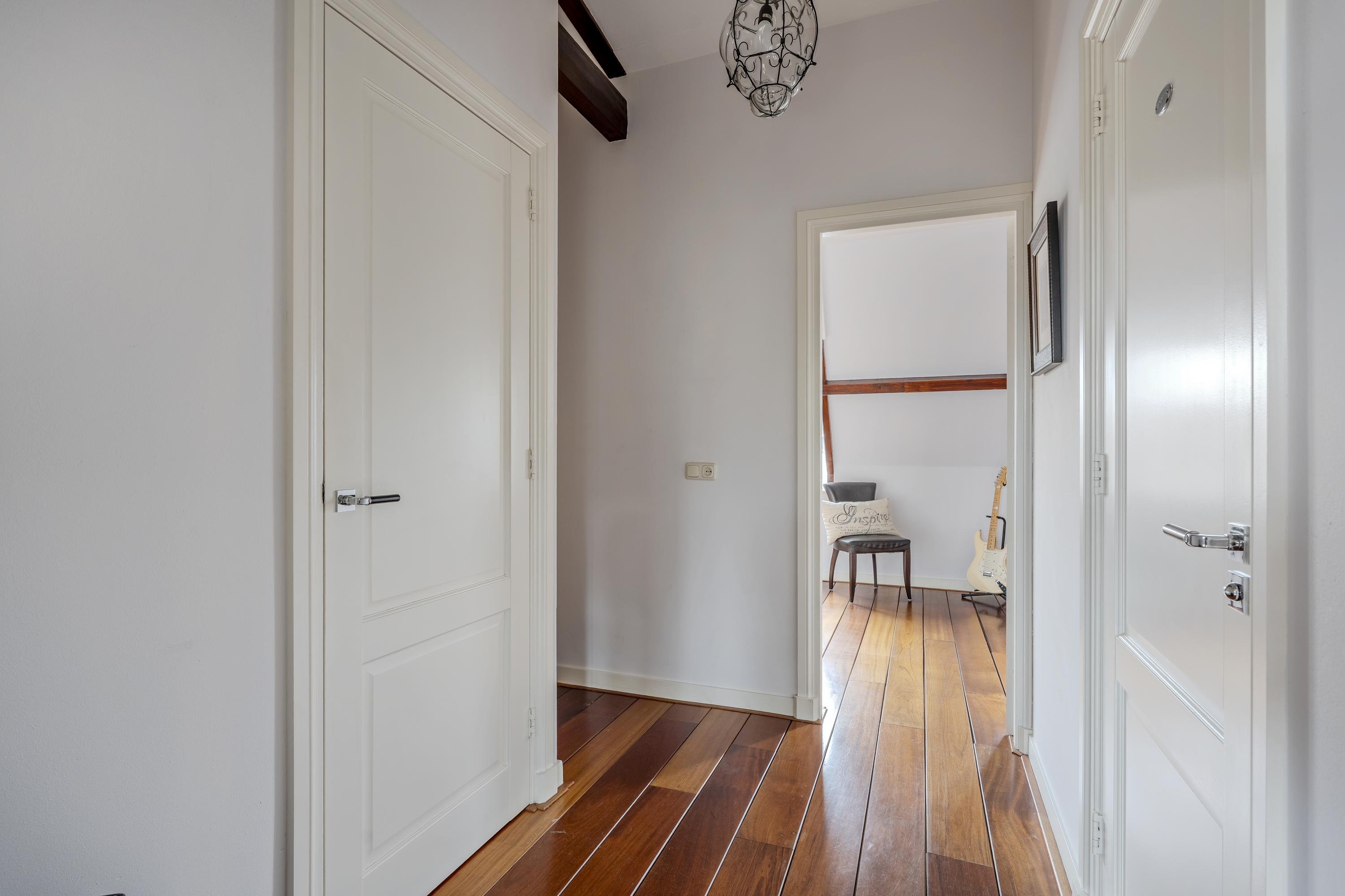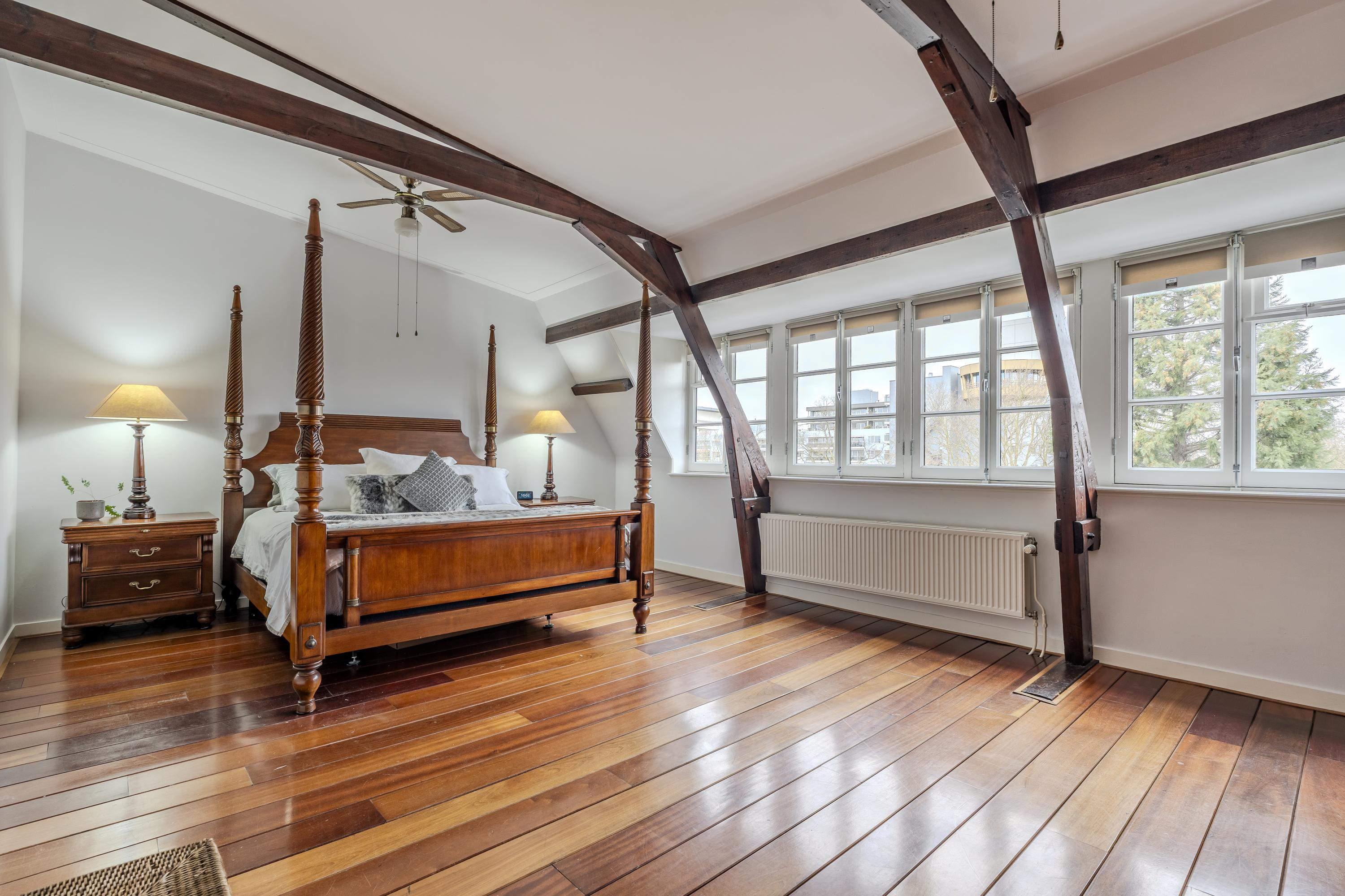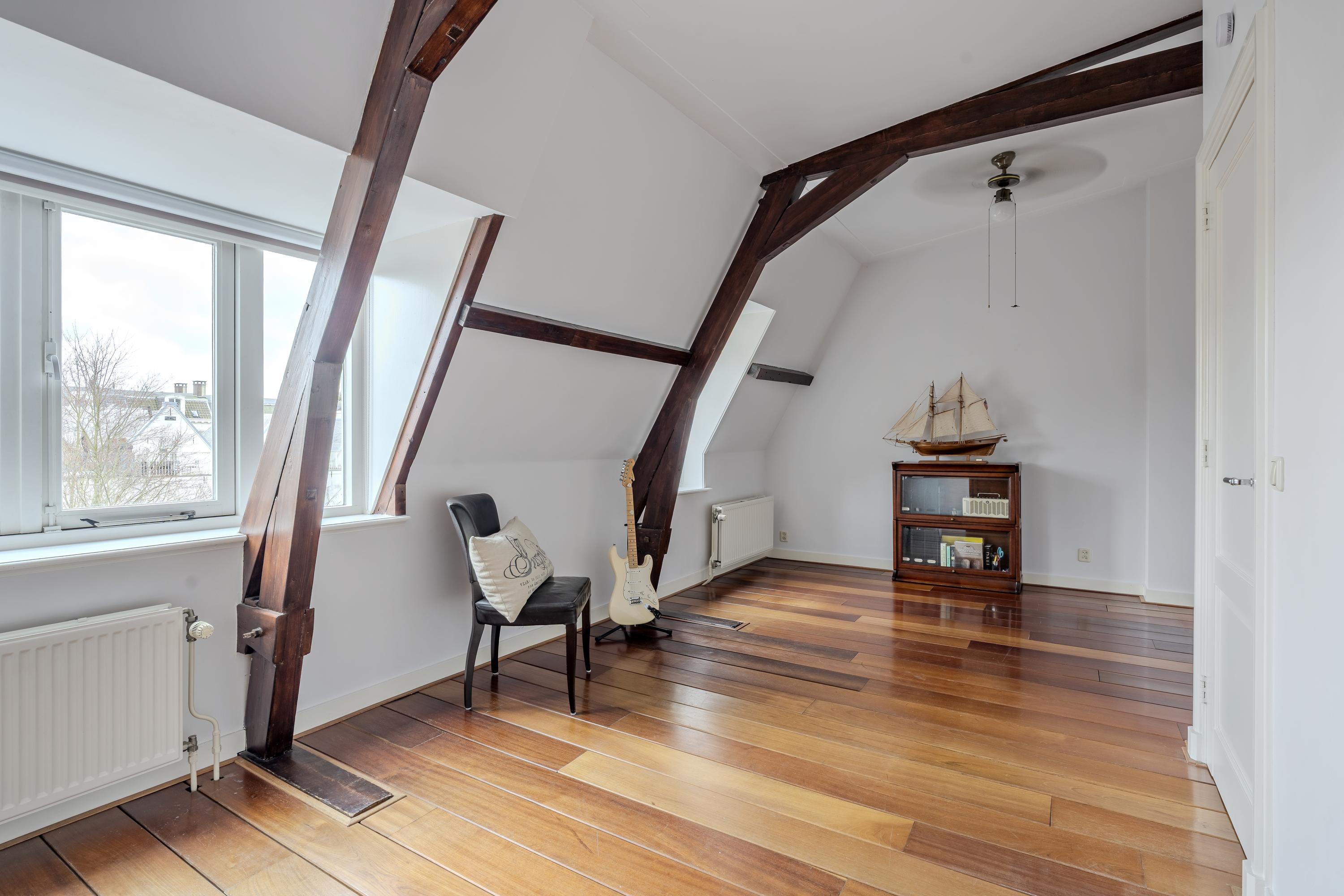 This floor features two well-proportioned bedrooms, each spanning the entire width of the apartment. The front bedroom overlooks the Vondelpark, while the rear bedroom offers a view of the deep inner garden. Both bedrooms beautifully showcase the original wooden construction of the building, and their large windows allow for abundant natural light.