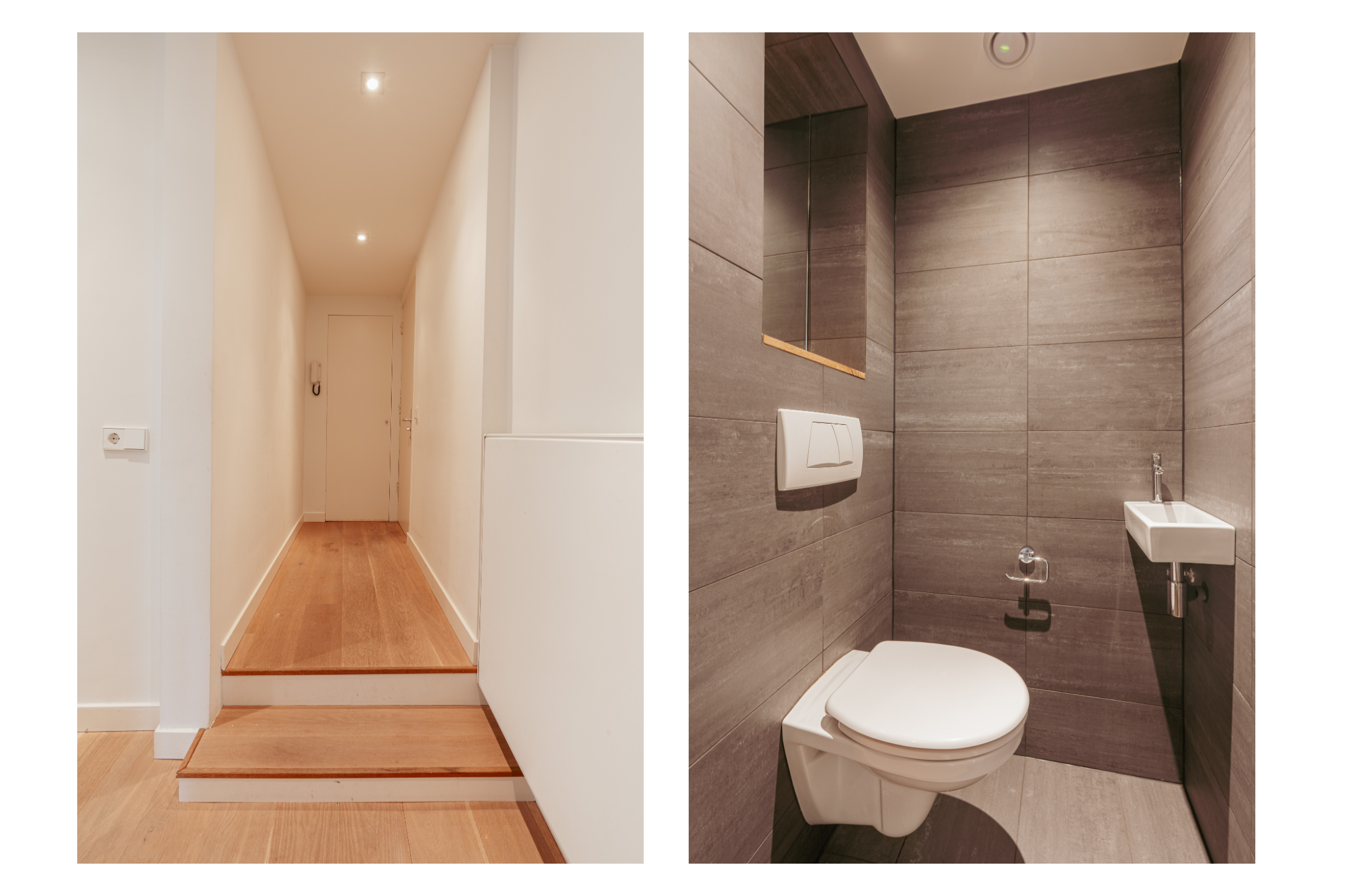 The apartment can be accessed via both the first and second floors. On the second floor, you’ll find the generous through-living room, which benefits from large windows on both sides, filling the space with natural light. There is ample room for a comfortable seating area as well as a spacious dining area with a large dining table. The elegant fireplace adds a charming focal point to the room.
