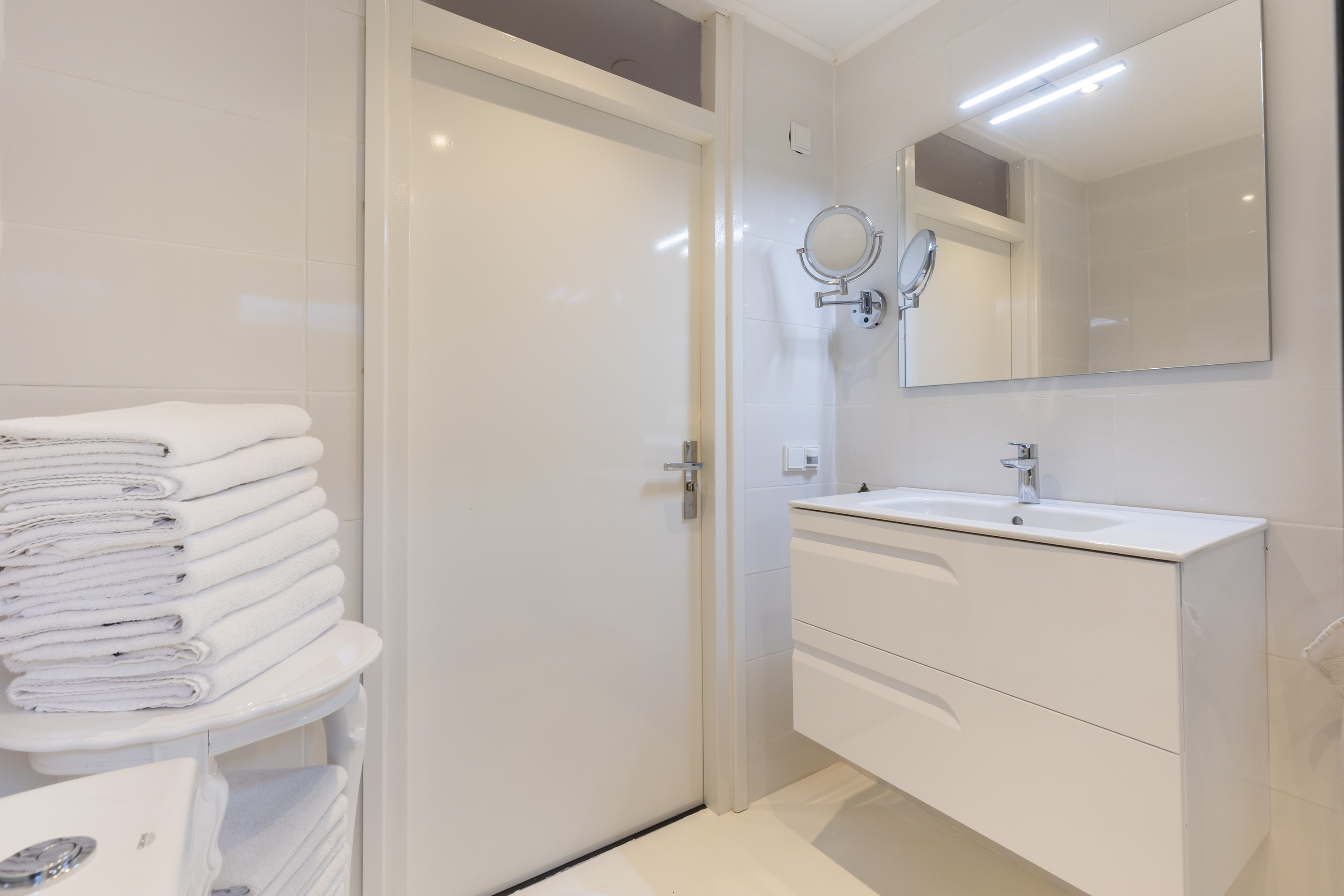 On the first floor there are four bedrooms and two bathrooms. The master bedroom at the rear has sliding doors to the L-shaped roof terrace. The room has a full length bespoke wall of cupboards. Adjacent is the en-suite bathroom with bath, basin and marble finish. This is functional and in original condition.
