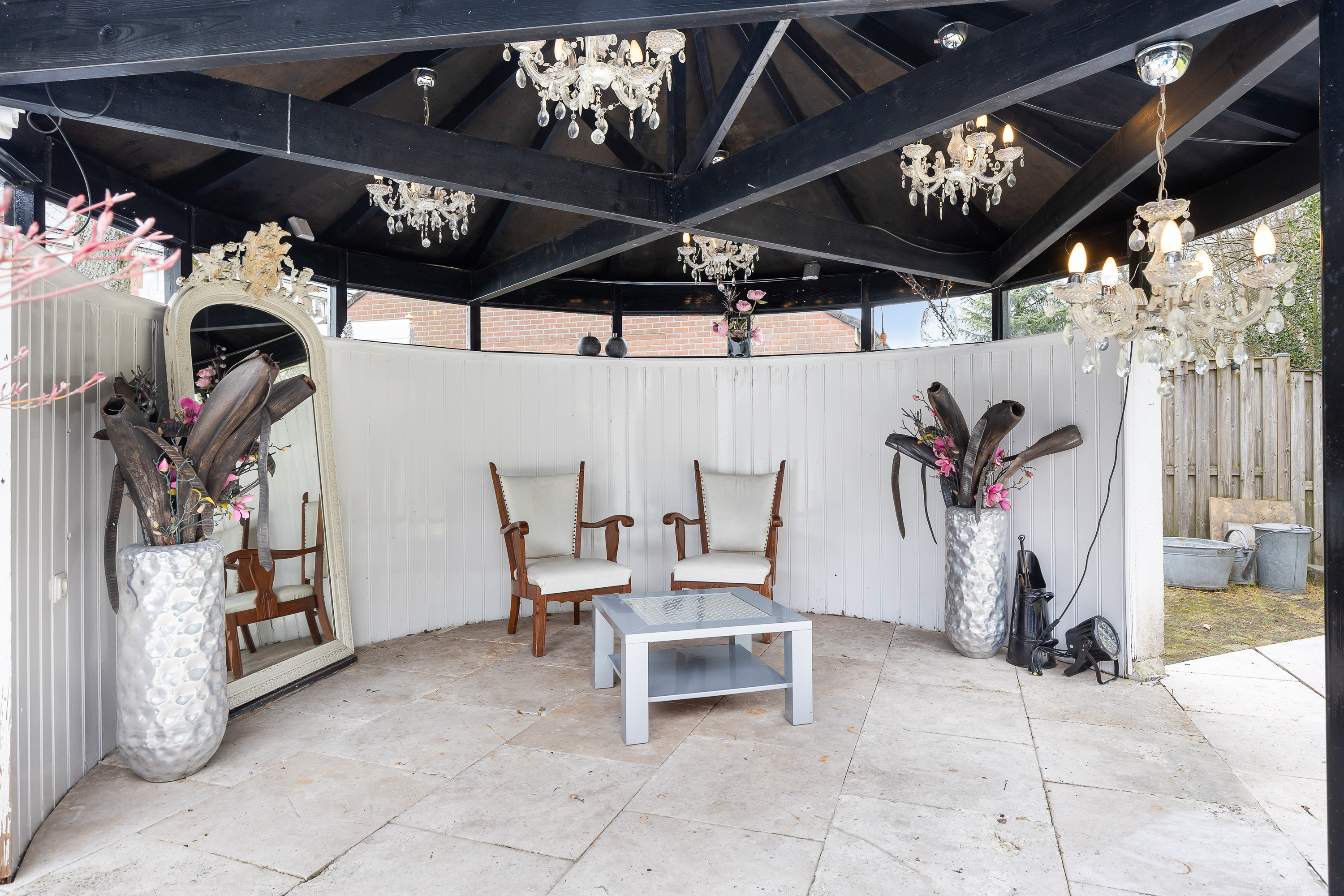 The property has two driveways. To the right of the house is a driveway leading to the garage which can accommodate two cars. To the left there is a large driveway which can accommodate at least four cars. Beyond the double wooden gate to the side is the separate bicycle shed. In 2023 the exterior of the house has been professionally painted, the front garden has been redone and the gazebo and shed have new roofs.