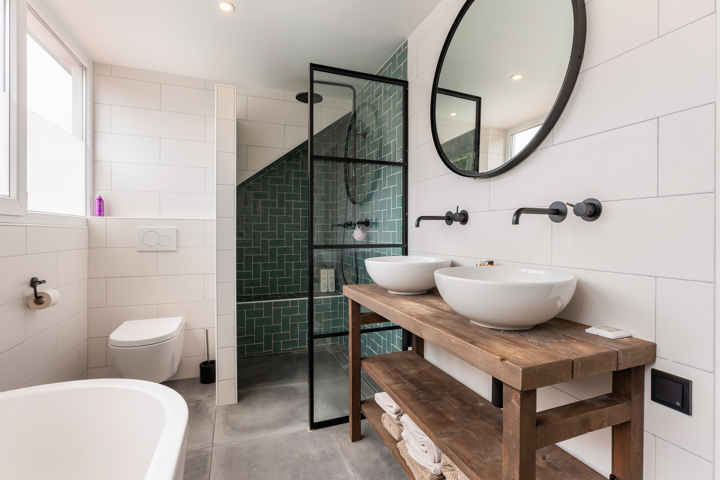 De verdieping is volledig heringedeeld en biedt nu twee ruime slaapkamers die beide geschikt zijn voor een tweepersoonsbed. Daarnaast is er een praktische inloopkast. De luxe badkamer is stijlvol uitgevoerd en voorzien van vloerverwarming, een inloopdouche, ligbad, toilet en een wastafelmeubel met dubbele waskommen.