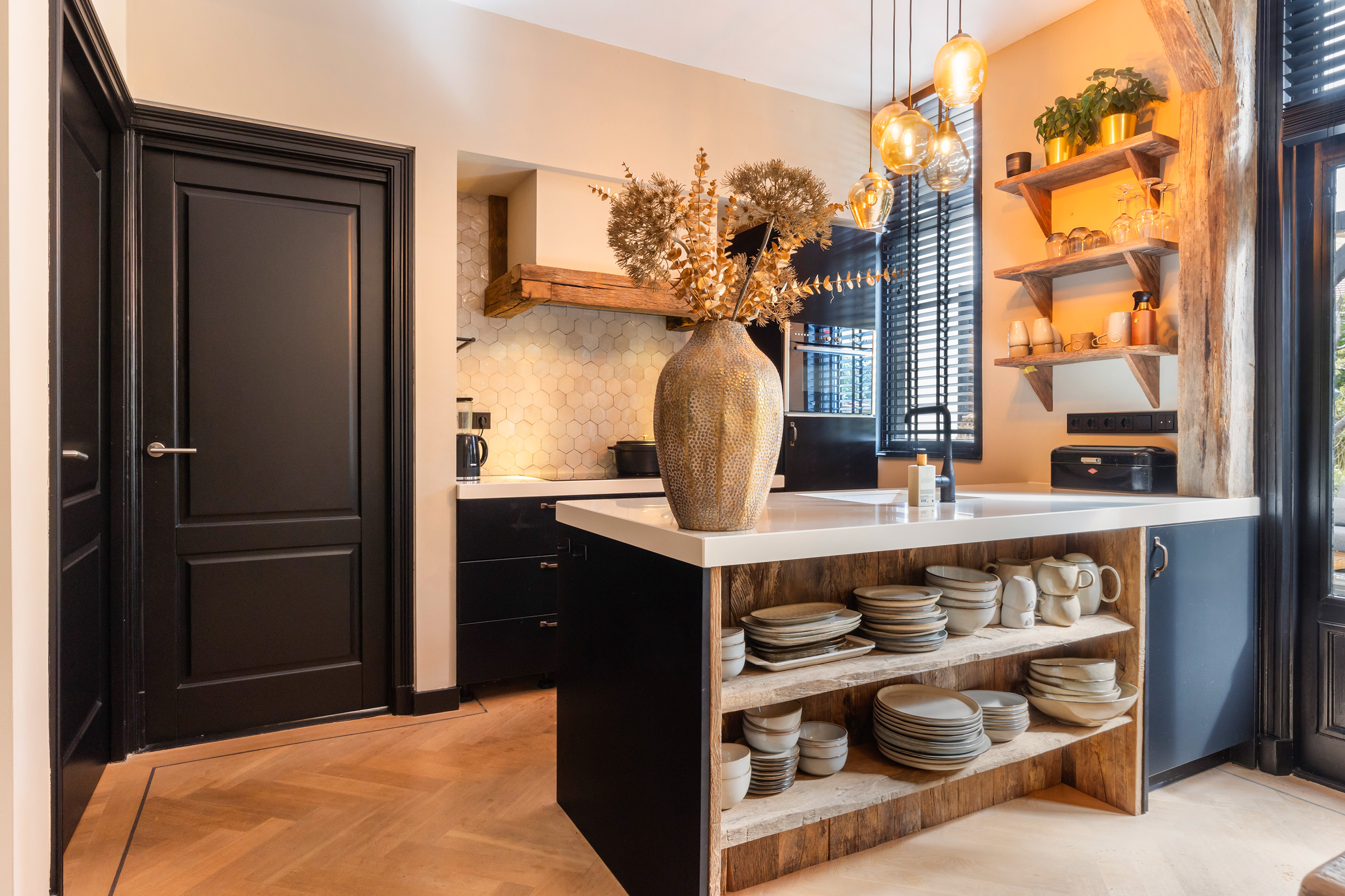 Via de originele voordeur met glas-in-lood komt u binnen in de hal met garderobe en moderne meterkast. Vanuit hier bereikt u de riante woonkeuken. Deze keuken is in 2024 vernieuwd en uitgevoerd in een stijlvolle opstelling met zwarte fronten, massief eiken accenten en hoogwaardige inbouwapparatuur, waaronder een vaatwasser, combi-oven, koelkast, inductiekookplaat en een afzuigschouw.