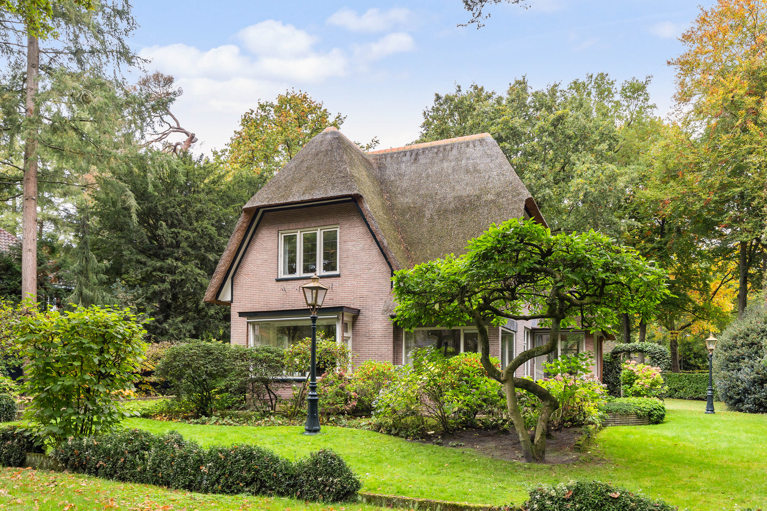 The 1,480 m² plot has dual access. From the driveway at the front, there is space for four cars beside the house. This leads to the garage, whose thatched roof and high ridge perfectly complement the villa’s architectural style. At the rear, via the Cederlaan, a generous driveway provides parking for five cars, alongside a large carport with a tiled roof. Beyond it stands a wooden storage shed with double doors.