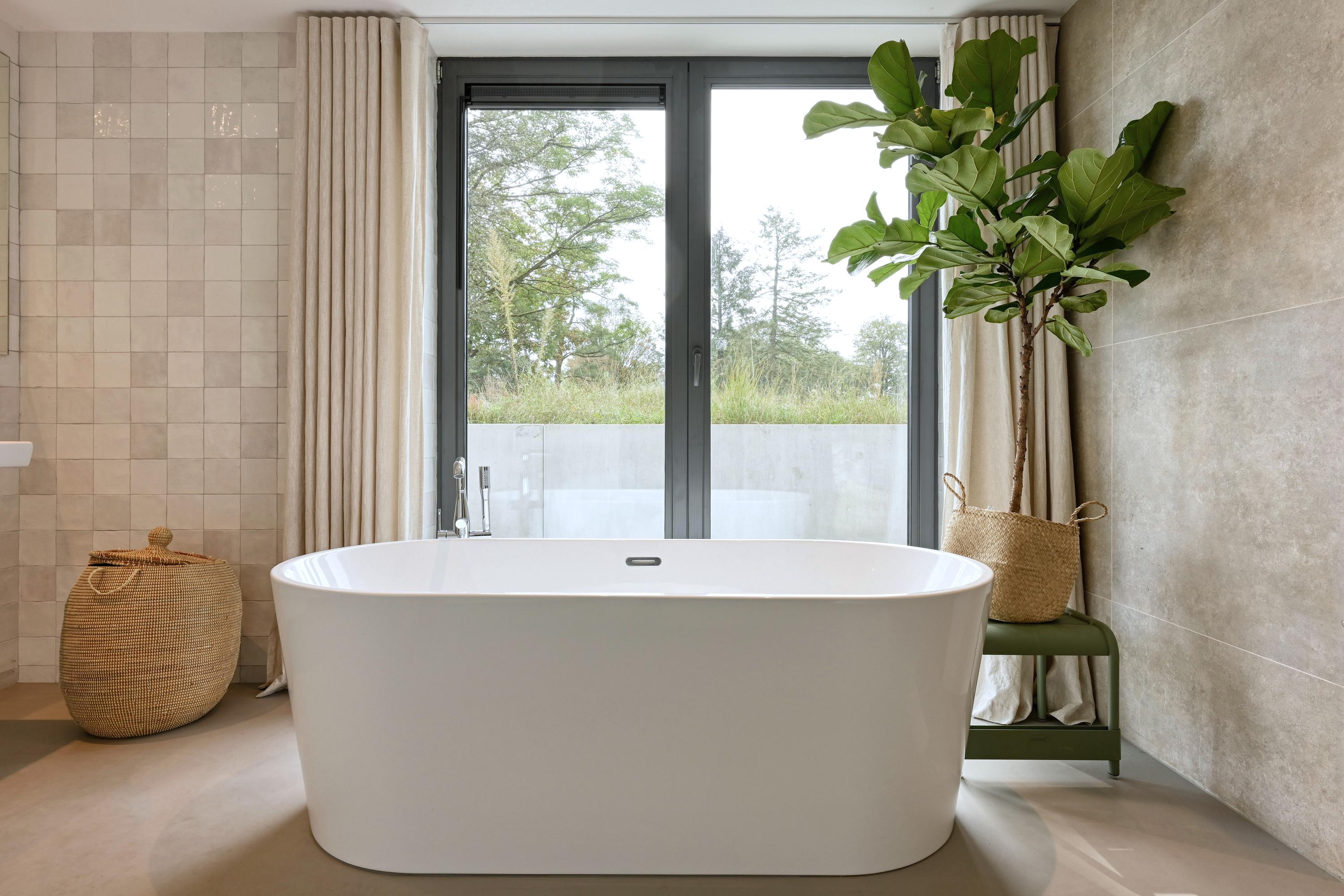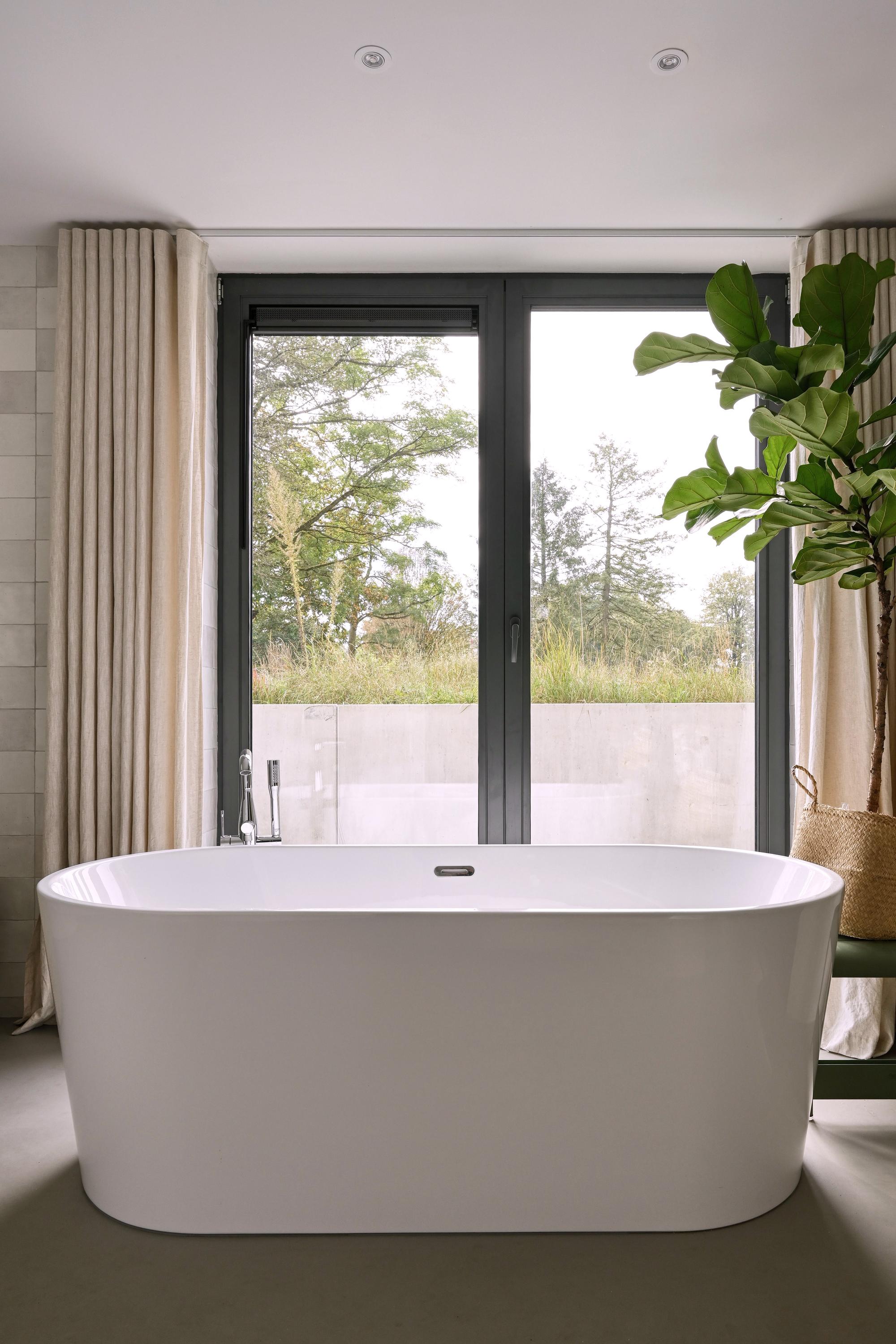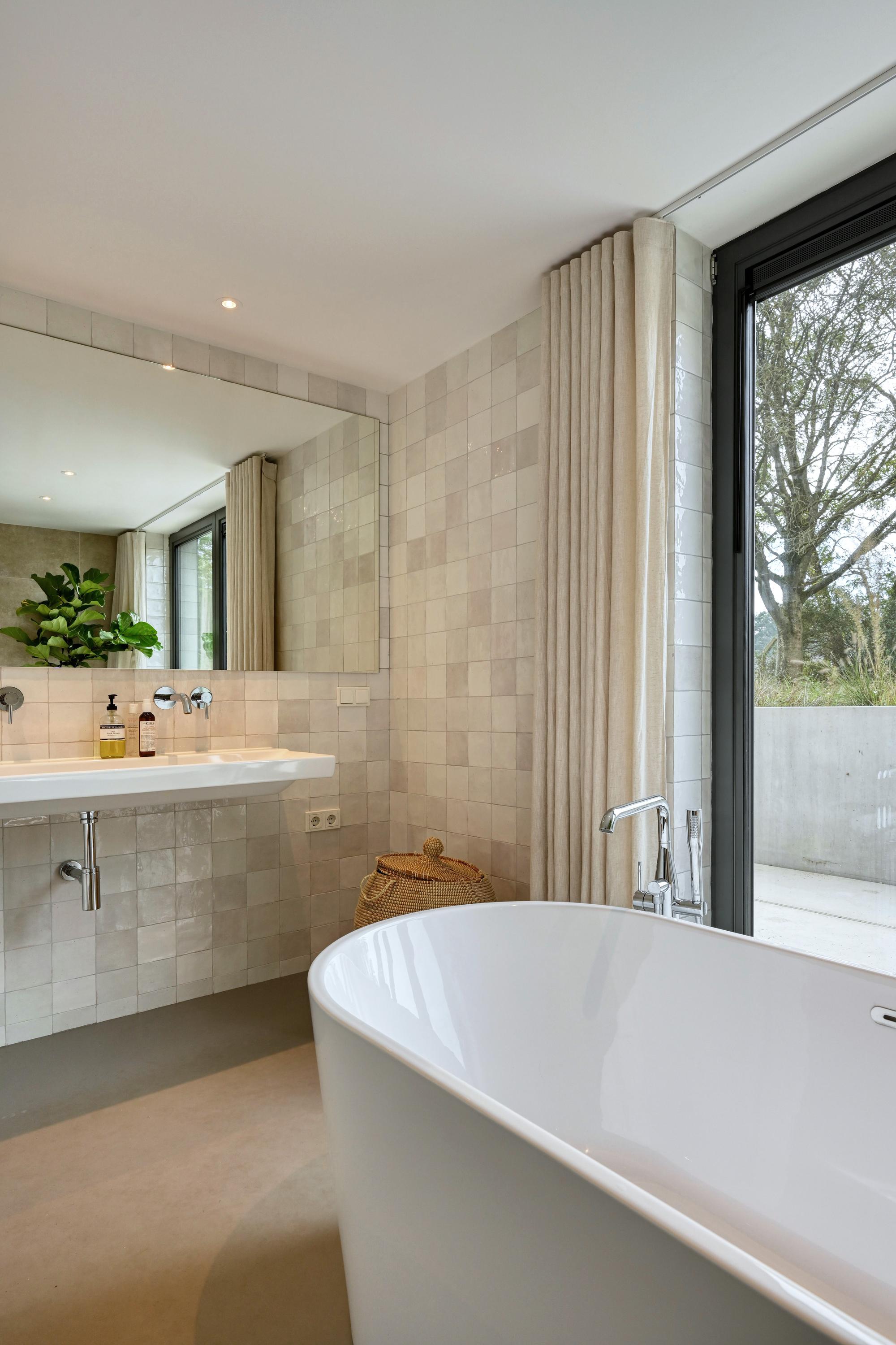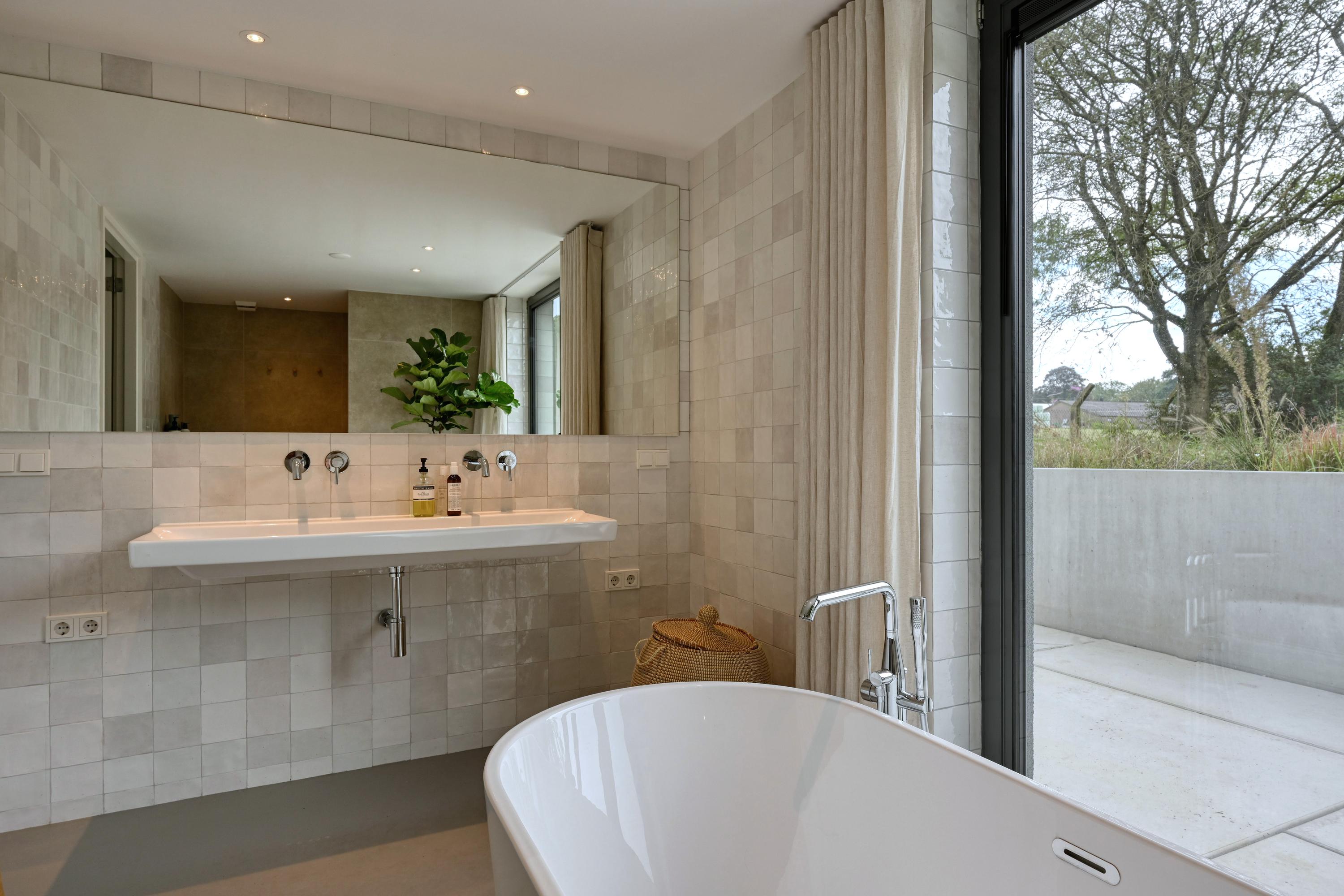 Entree, ruime hal met zicht op de vide. Deze ruimte is met het biljart in gebruik als hobbyruimte met terrasdeuren die geheel opengeschoven kunnen worden naar het terras. Dubbele stalen deuren bieden toegang tot de woonkeuken als ‘het kloppend hart’ van het huis. Het modern vormgegeven kookeiland met marmeren aanrecht staat centraal in de ruimte. Zodra de terrasdeuren over de gehele breedte zijn geopend is heerlijk om in de ochtend te genieten van de ochtendzon en het buitenleven met vrij zicht over een open veld. In combinatie met de groene kleurstelling van de keuken en de muur die tot aan het plafond is getegeld met Marrokkaanse tegeltjes is een geraffineerde mix van luxe materialen en sfeer ontstaan. Uiteraard is de keuken voorzien van de benodigde inbouwapparatuur. Een grote berging/bijkeuken doet dienst als provisieruimte en was- en linnenruimte. Een houten trap brengt u naar de woonkamer met ramen en deuren naar de vloer met vrij uitzicht over de natuur aan de zuidzijde van het huis. Een trap brengt u een niveau lager naar een gang met kledingkasten waaraan de slaapvertrekken en de badkamer zijn gesitueerd. 3 Ruime slaapkamers zijn voorzien van terrasdeuren naar het naastgelegen terras. Een luxe badkamer is gerealiseerd met ligbad, douche, toilet en een wastafel voor 2 personen. Een trap brengt u naar de 4e slaapkamer aan de zuidzijde van het huis. Deze kamer is voorzien van een wastafel. Omdat overal de ramen en deuren van glas tot de vloer doorlopen staat u in direct contact met de natuur. Vanuit de keuken is een vaste trap naar de vide.