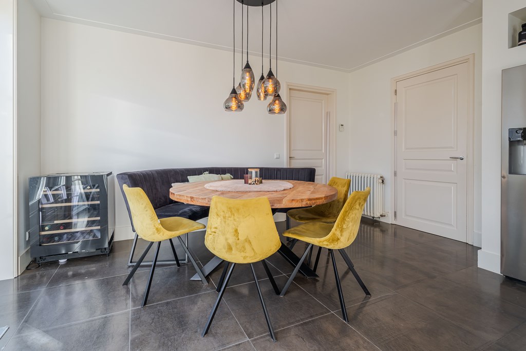 De living is onderverdeeld in een eetkamer, woonkamer en zitkamer. Opvallend zijn de grote en hoge raampartijen waardoor er veel natuurlijke daglichttoetreding in de woning is. De living is voorzien van een parketvloer, inbouwverlichting en een mooie gashaard met schouw. Er zijn maar liefst 3 openslaande tuindeuren waardoor u hier het absolute binnen-buiten gevoel kunt ervaren. De stijlvolle trapopgang is centraal geplaatst met uittreders richting zowel de woonkamer als eetkamer.