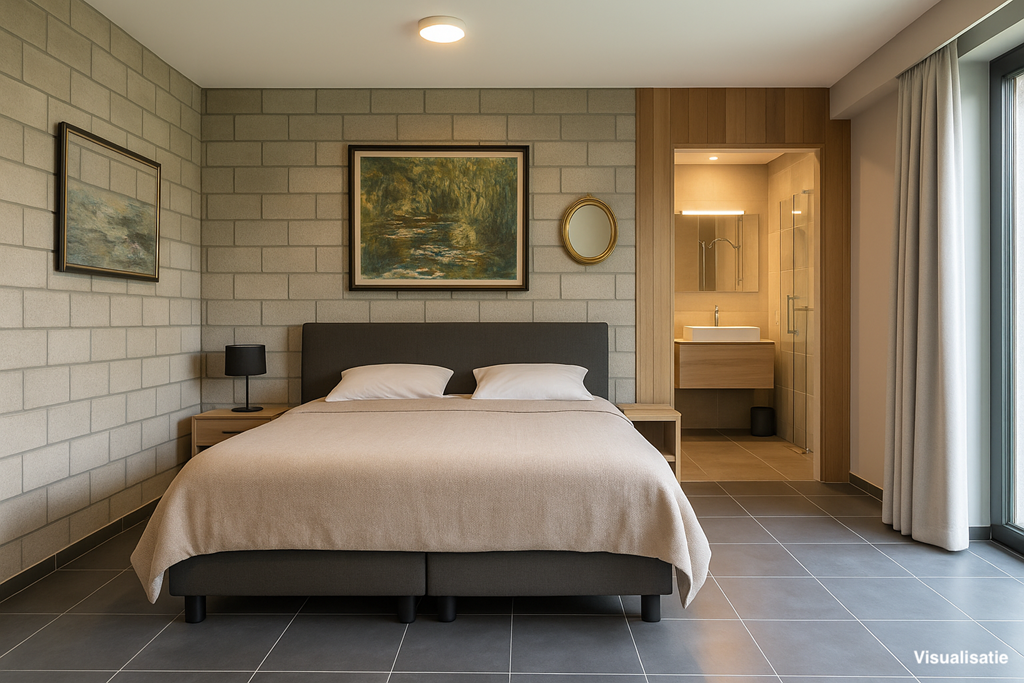 Doordat er gebruik is gemaakt van de juiste kleuren en materialen voelt deze badkamer als een oase van rust. De badkamer is voorzien van een ligbad, inloopdouche, vloerverwarming, wandcloset en een dubbele wastafel met fraai meubel.