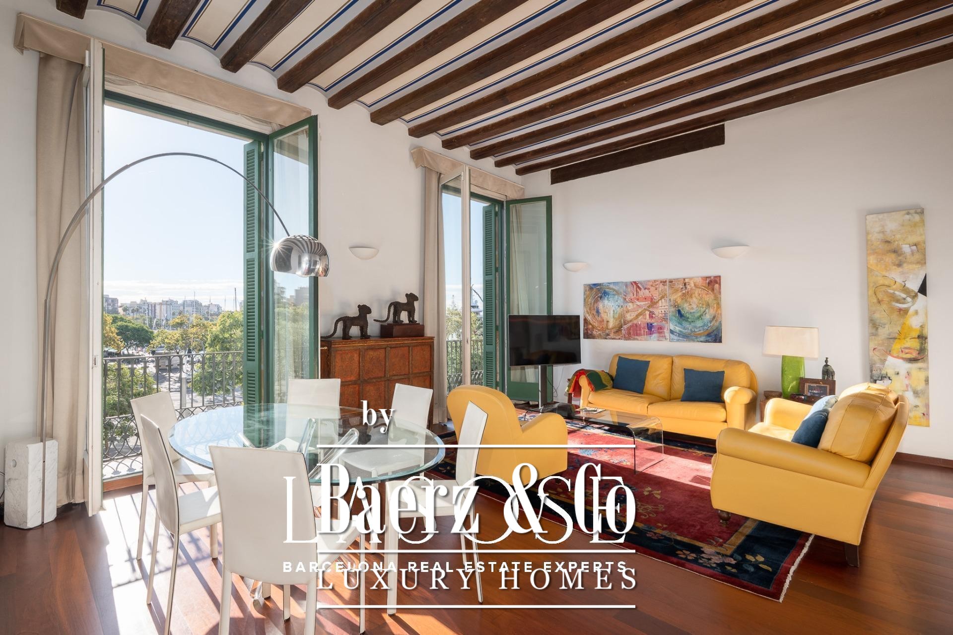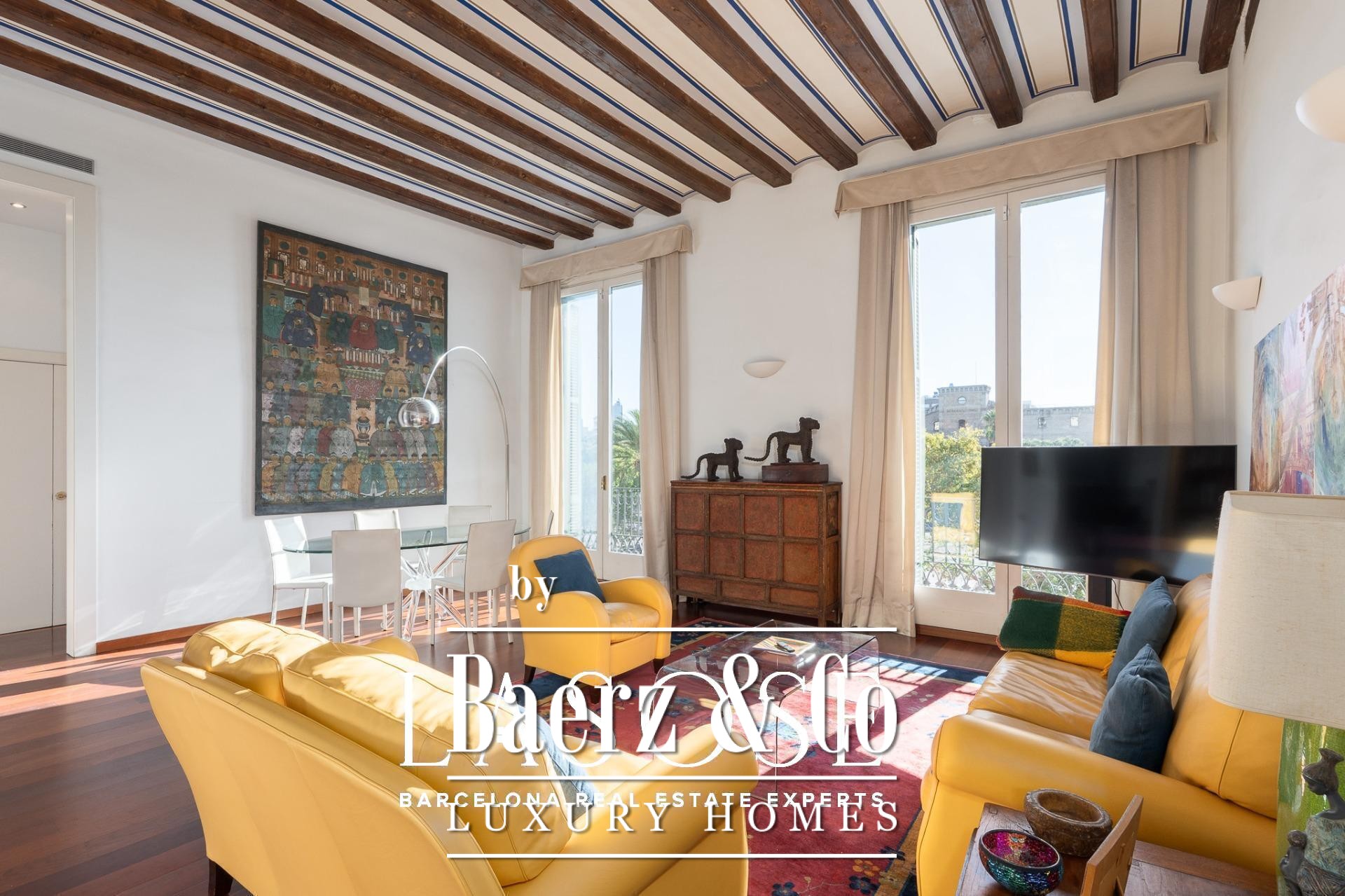 Facing Barcelona’s marina, in a historic building dating back to 1900, this home opens its doors with soul and character. The 3.8-meter-high ceilings, the exposed wooden beams, and the Catalan vaulted ceiling adorned with hand-painted details evoke the craftsmanship and timeless beauty of another era. The original wrought-iron balconies complete the ensemble, preserving the essence of a time when architecture was built to endure.. Light floods every room through generous windows, offering open views of the sea and the greenery of Las Ramblas de Mar. The living room, spacious and serene, blends noble materials with curated design pieces, creating an atmosphere where time seems to pause.. Natural wood floors, marble-clad bathrooms, and a fully equipped kitchen bring contemporary comfort without losing the classical charm that defines the space. Every detail —from the palette of colors to the restored moldings— speaks of harmony, care, and beauty.. Located on Carrer Llauder, in the