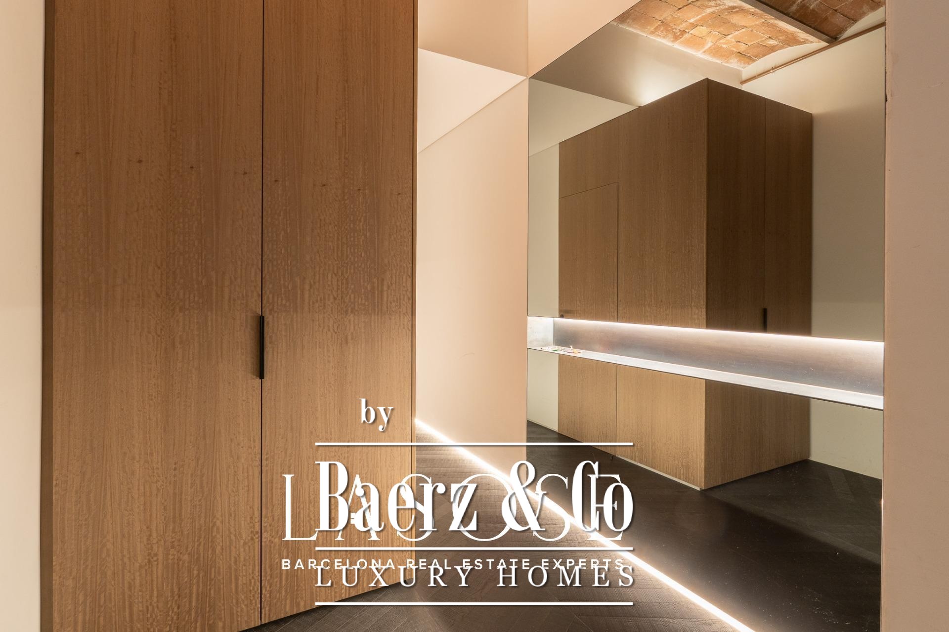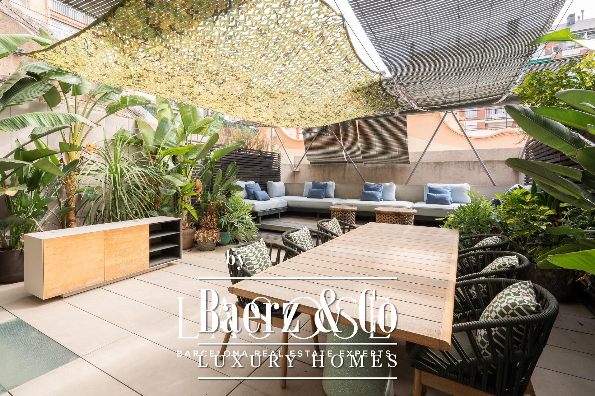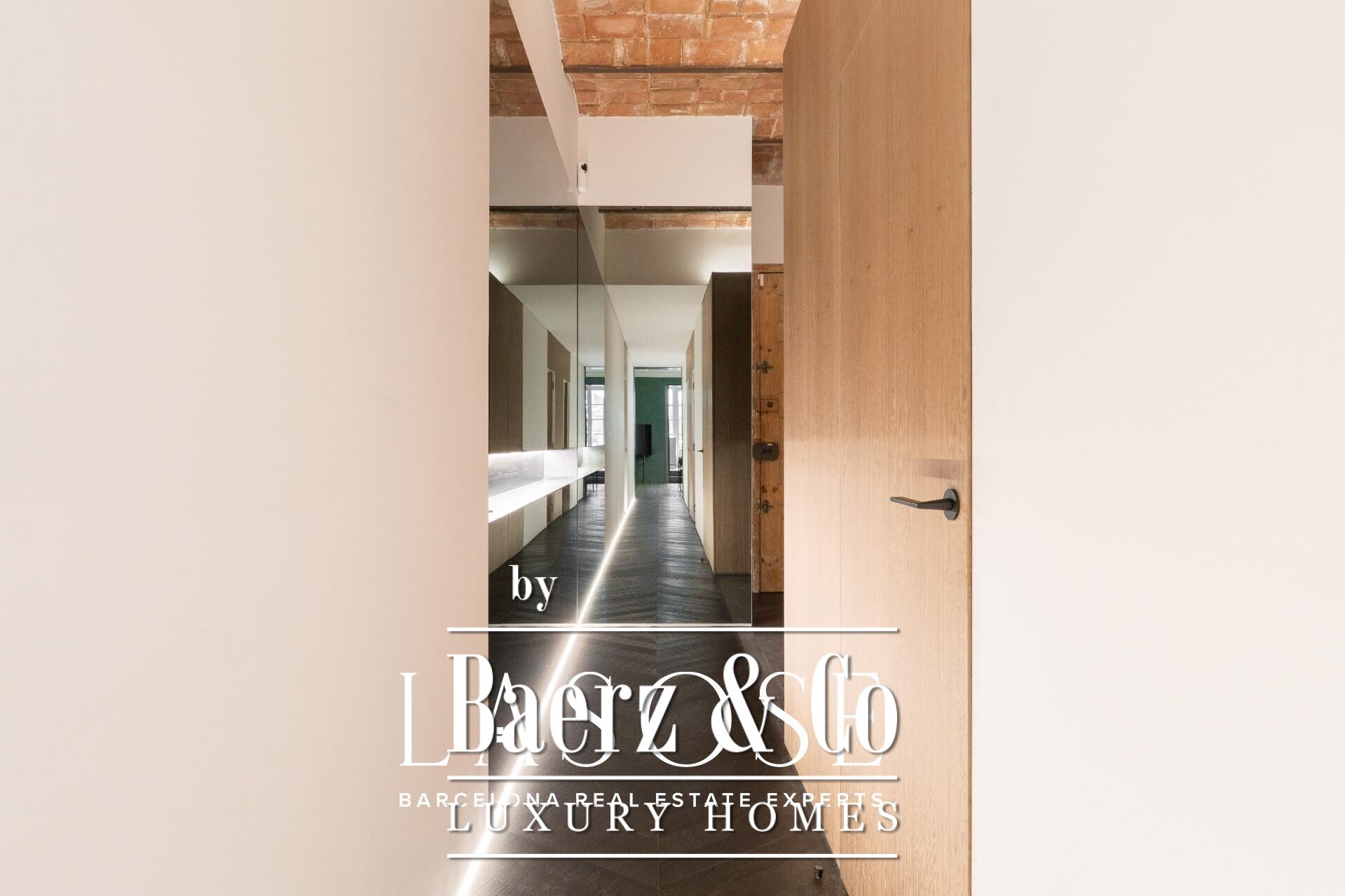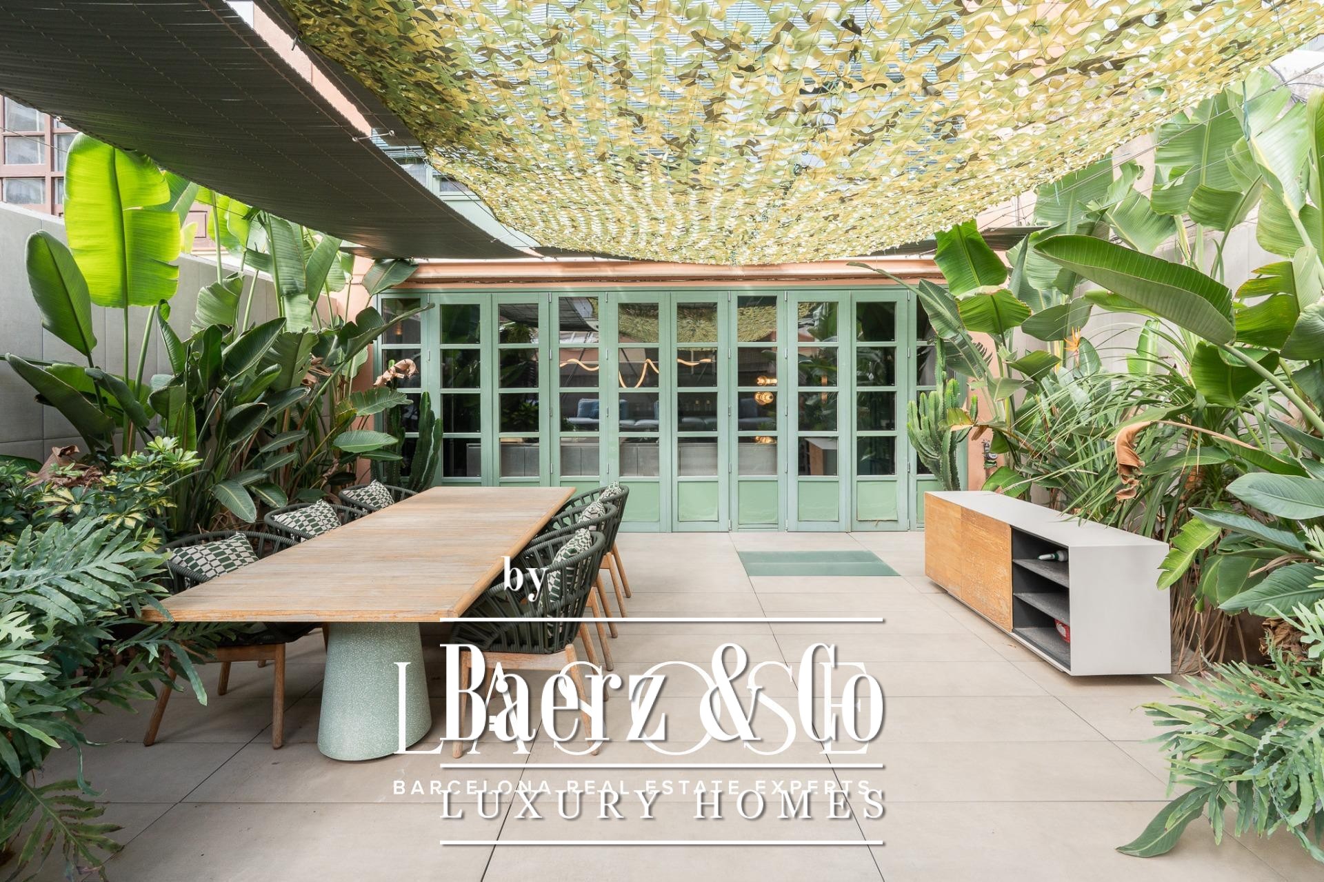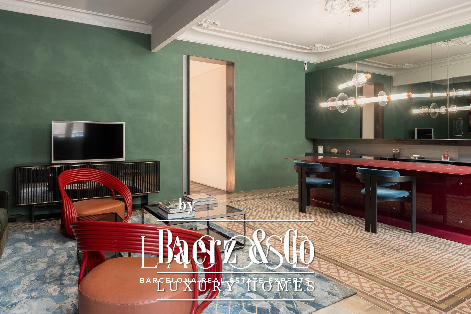 Exclusive luxury property located in a finca regia in the very heart of Eixample, featuring a wonderful 60 sqm decked terrace – a true private oasis in the city centre.. . This 120 sqm apartment has been designed as a unique piece by a renowned interior designer, who has created an authentic haven of peace and harmony. The property is offered with high-end designer furniture and carefully selected pieces, which can remain in the apartment if the buyer wishes. In addition, it has excellent investment potential, as it can be rented out for €4,500 per month.. . The layout is very intuitive and functional. Upon entering, we find the night area, composed of two spacious double bedrooms and two bathrooms. The master suite retains its original vaulted ceilings and connects to an en-suite bathroom that masterfully combines period details with modern, exclusive design. The second double bedroom opens onto an interior patio through glass doors and is conveniently located next to a second independent bathroom.. . The day area consists of a large living-dining