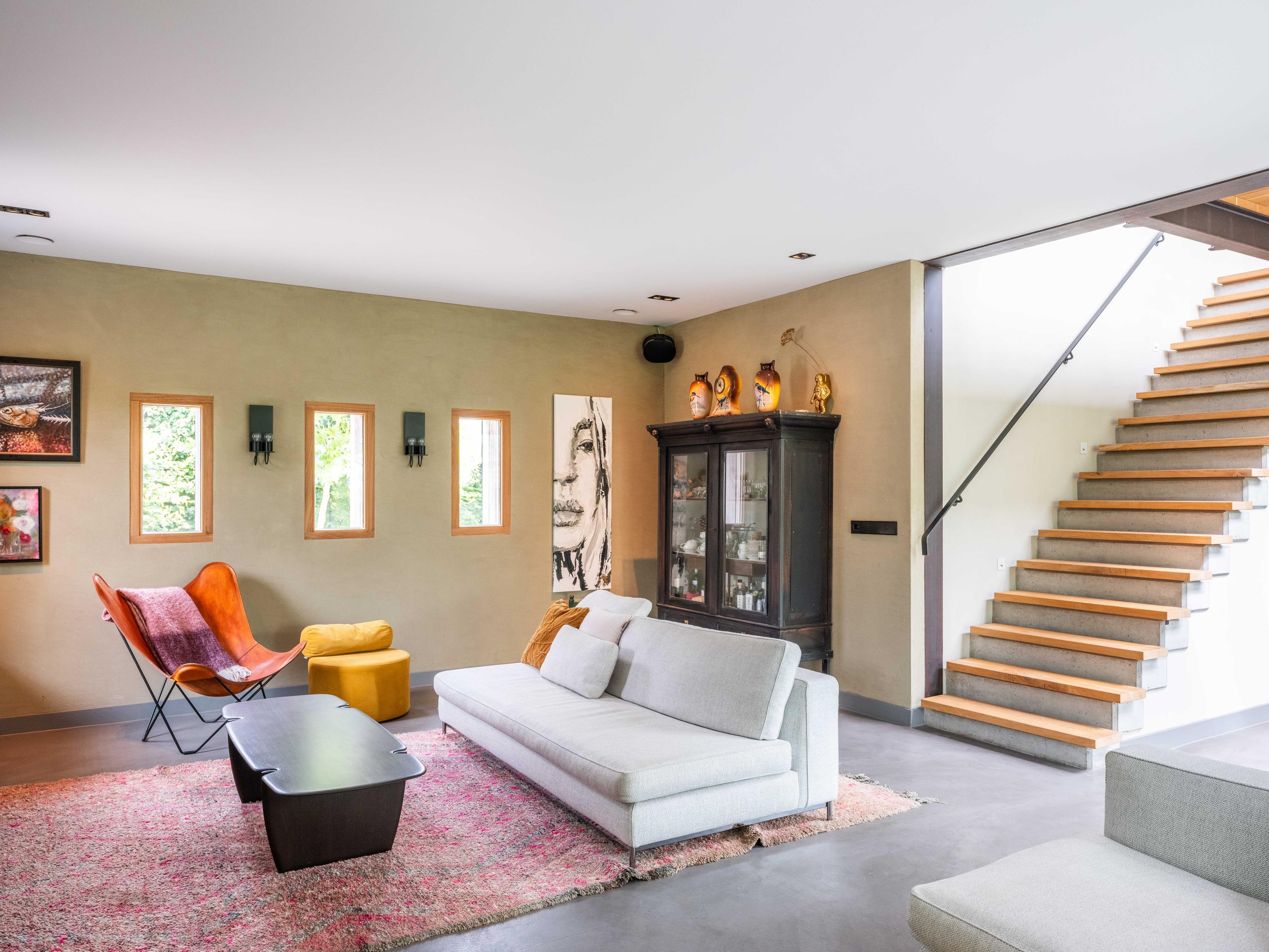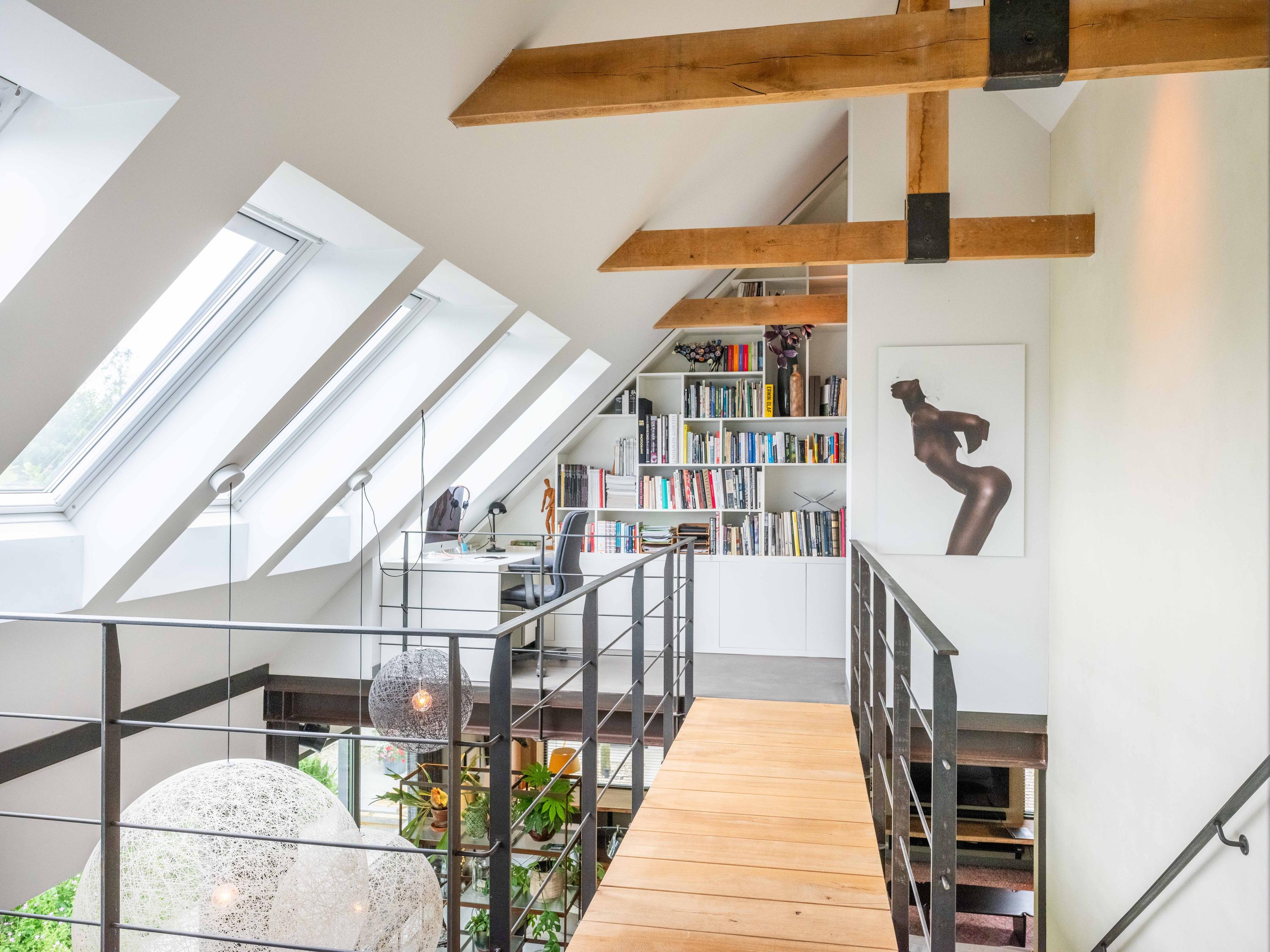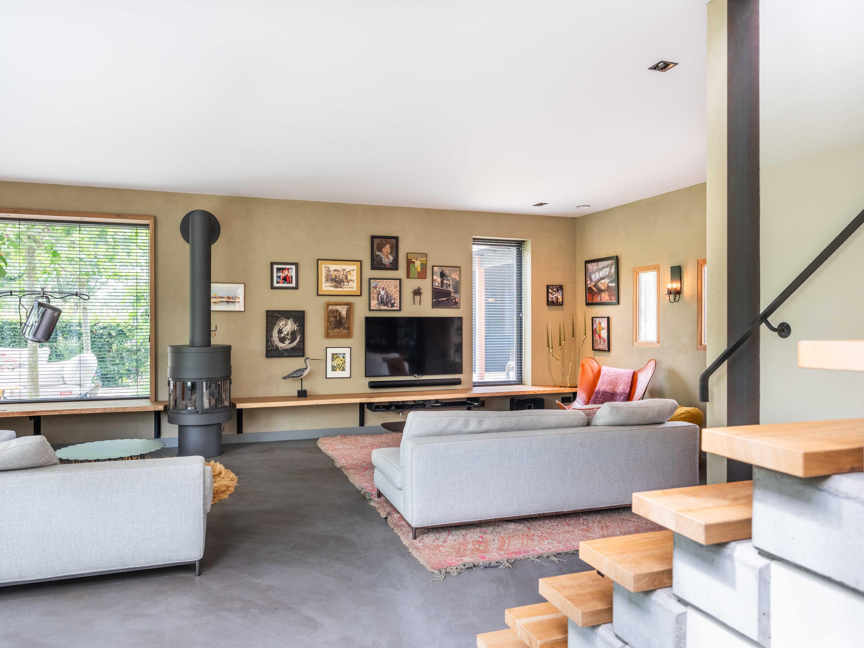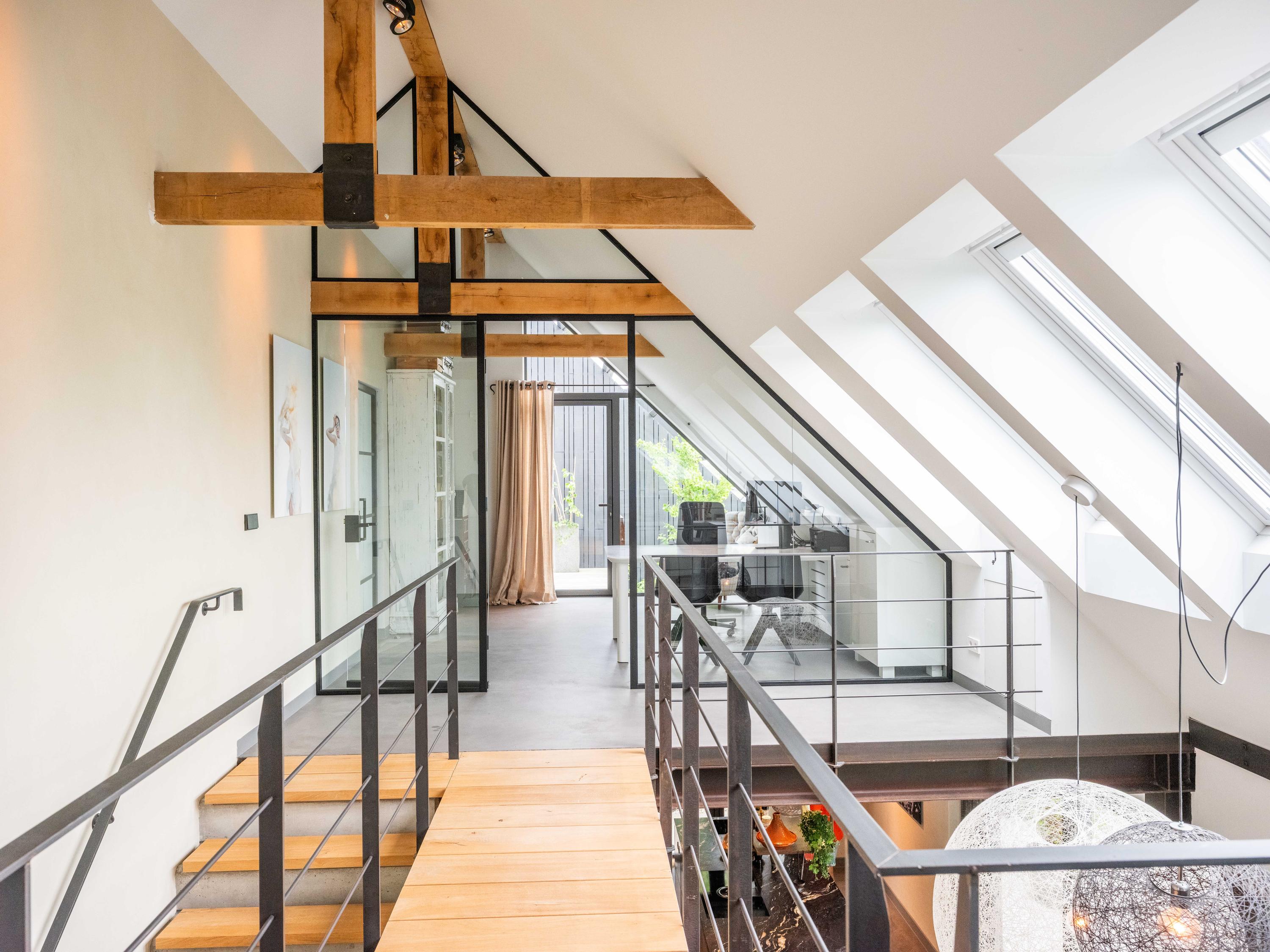 We would like to take you inside. Through the entrance, we enter the cosy living room with open kitchen. The kitchen is fully equipped and offers everything a cooking enthusiast's heart desires. What immediately stands out are the large windows that provide wonderful light and a wide view of the green garden and surrounding meadows. The staircase to the first floor is also a real eye-catcher - an architectural masterpiece that adds character to the space. The house is set up like a loft with a completely open character.