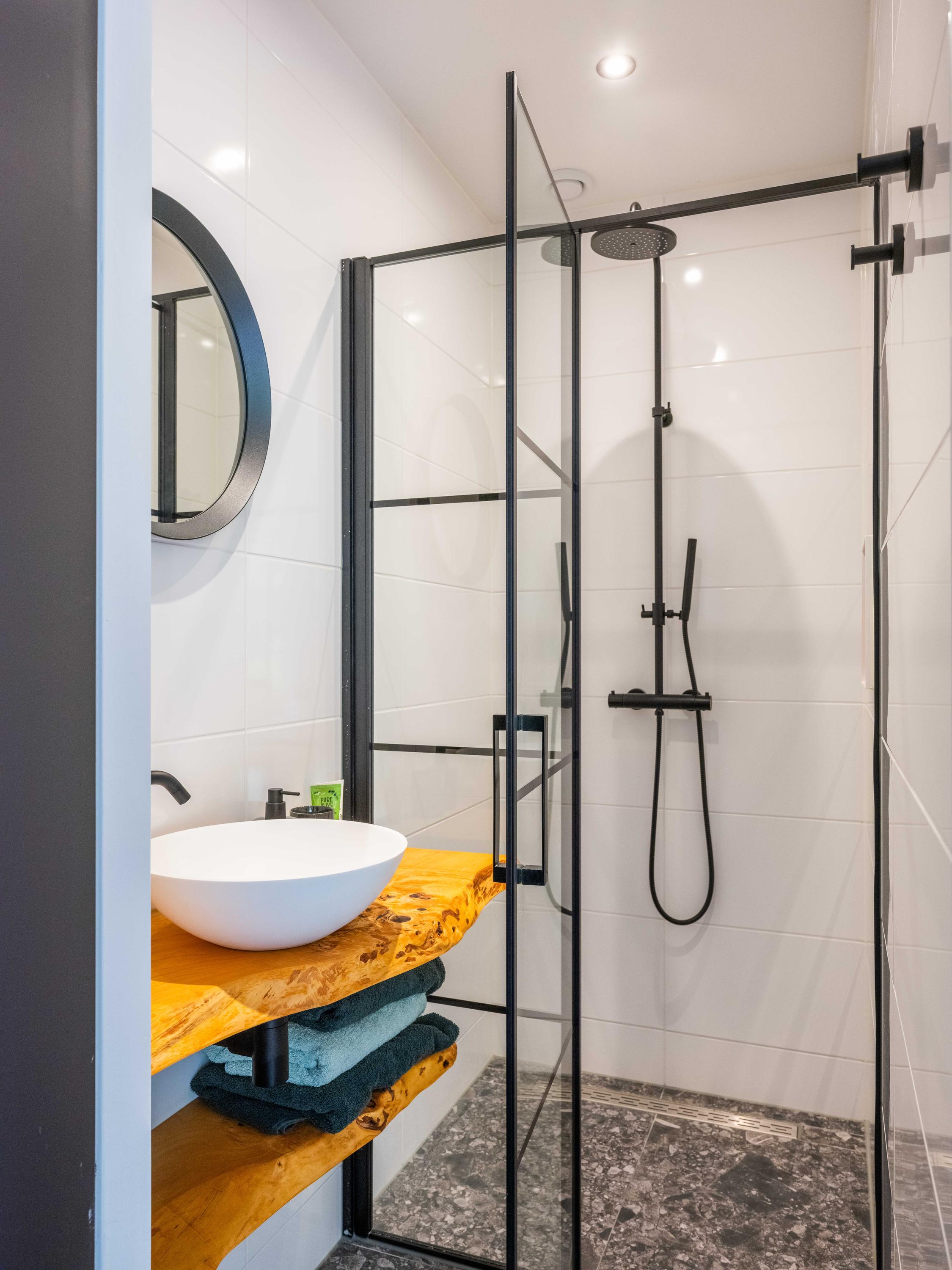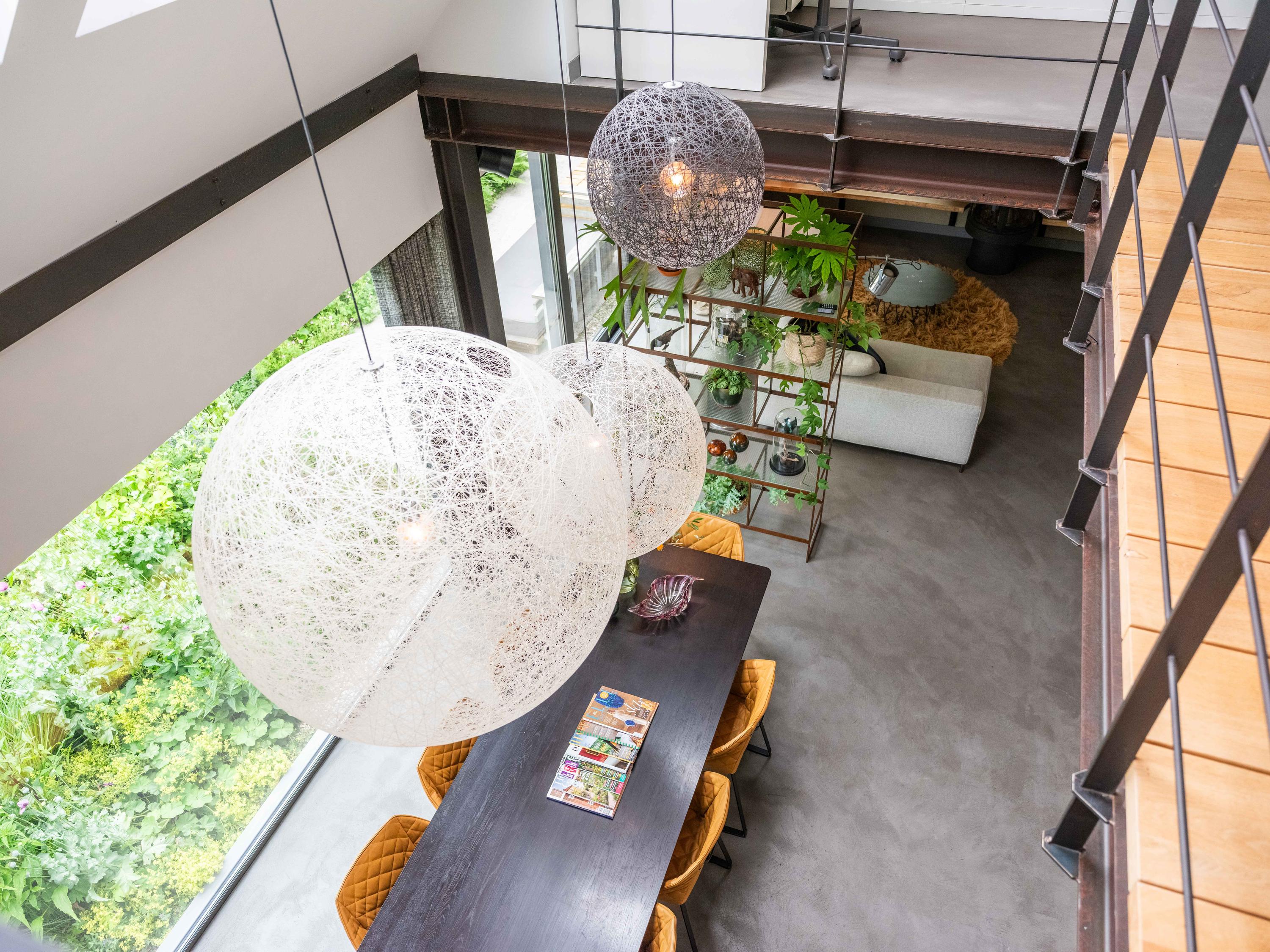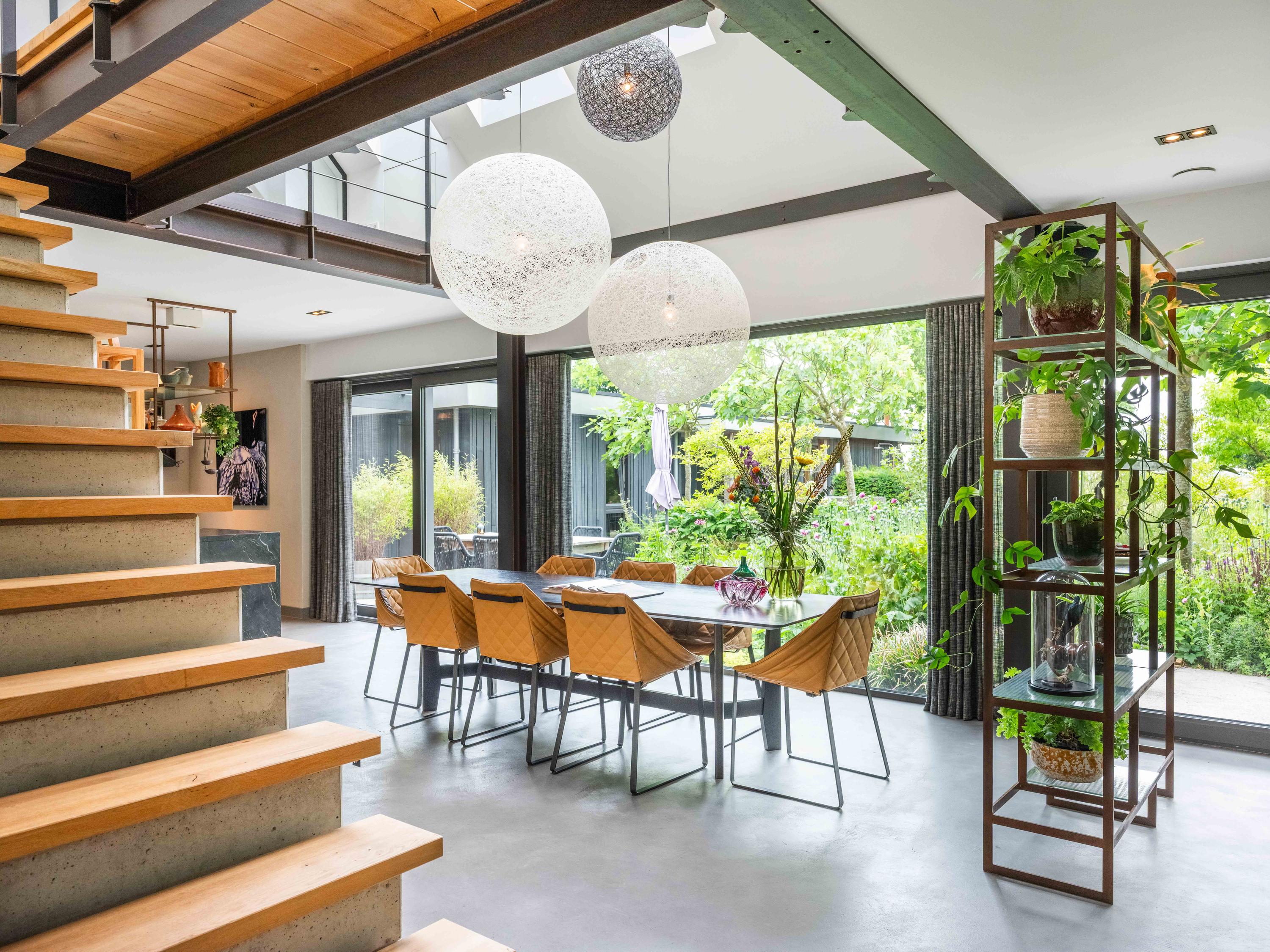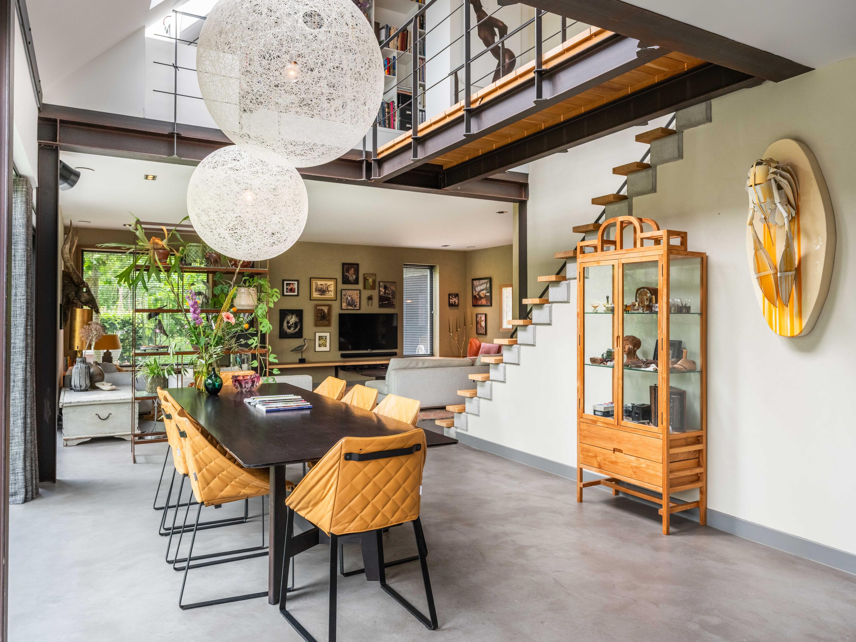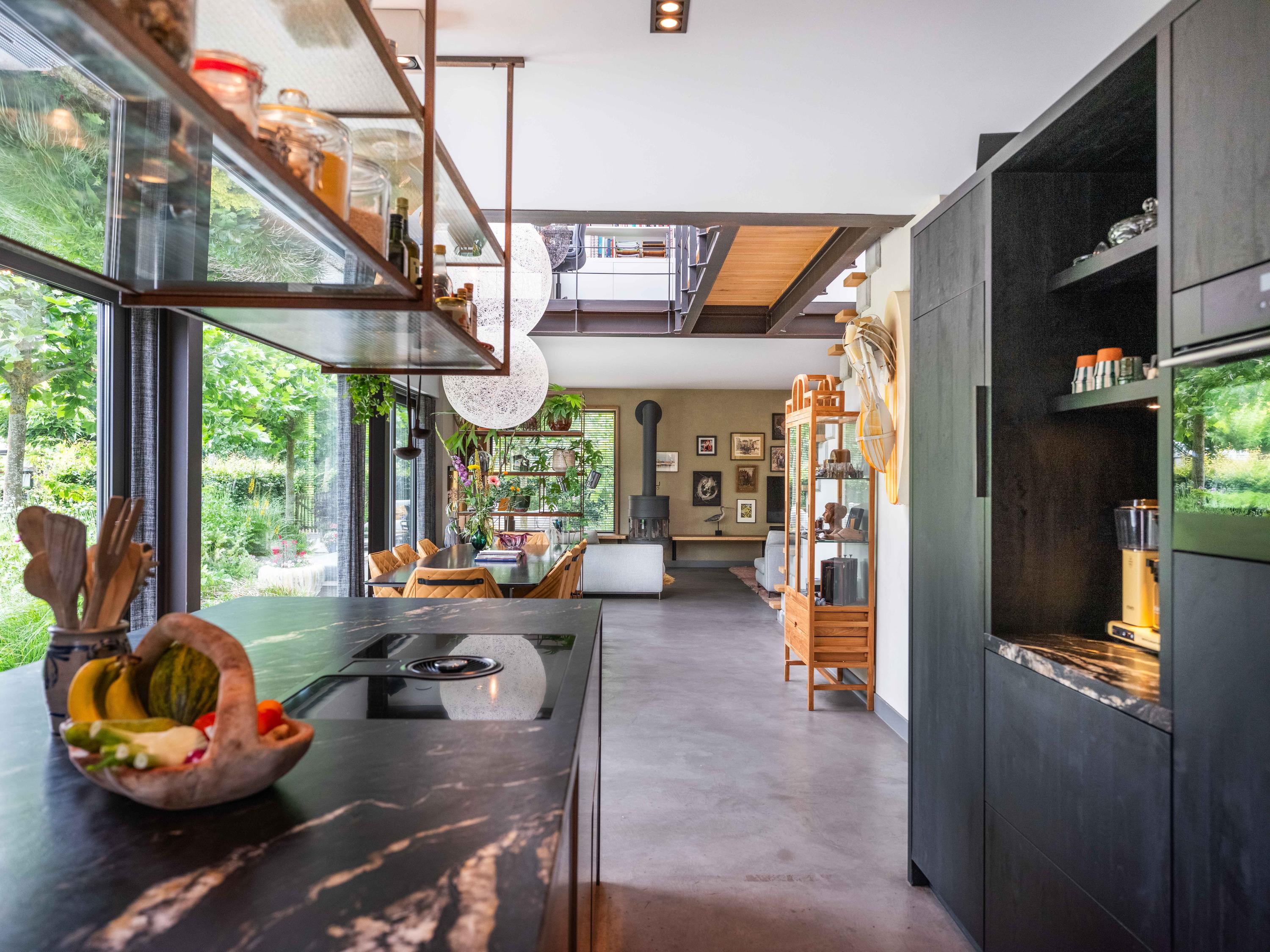 We would like to take you inside. Through the entrance, we enter the cosy living room with open kitchen. The kitchen is fully equipped and offers everything a cooking enthusiast's heart desires. What immediately stands out are the large windows that provide wonderful light and a wide view of the green garden and surrounding meadows. The staircase to the first floor is also a real eye-catcher - an architectural masterpiece that adds character to the space. The house is set up like a loft with a completely open character.