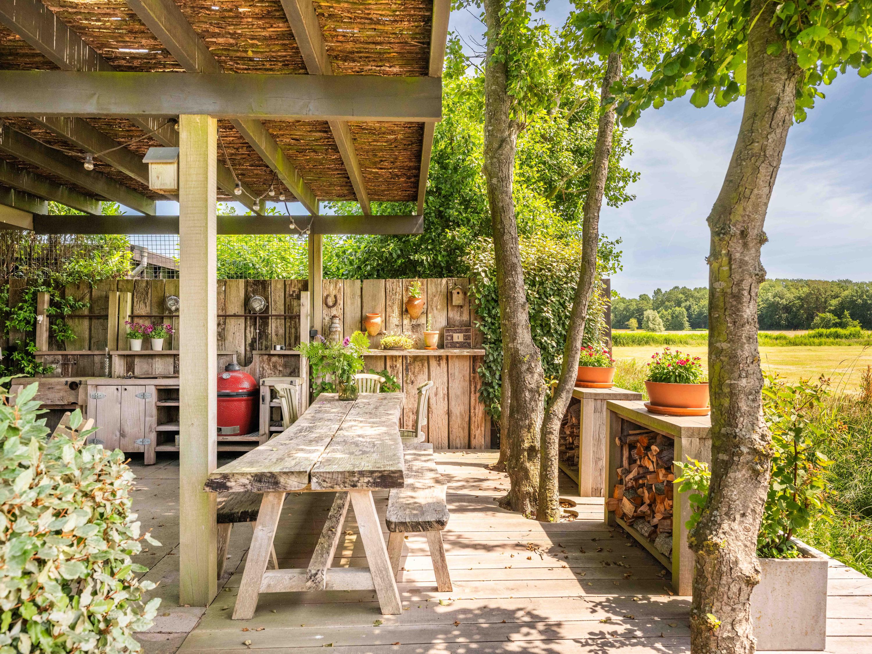 A large outbuilding is multifunctional and can be set up as a studio, guest room or sports area as desired. A large storage room with the technical facilities is also located here. The house is electrically equipped with a heat pump, WTW, 62 solar panels, triple glazed windows, the whole house and optimally insulated. As a result, this house has a genuine A++++ label, which means energy costs are virtually zero. From the outhouse, you enjoy the fantastic views over the meadows. At the meadows behind the house is also the outdoor kitchen with a large deck that provides space for relaxation and rest.