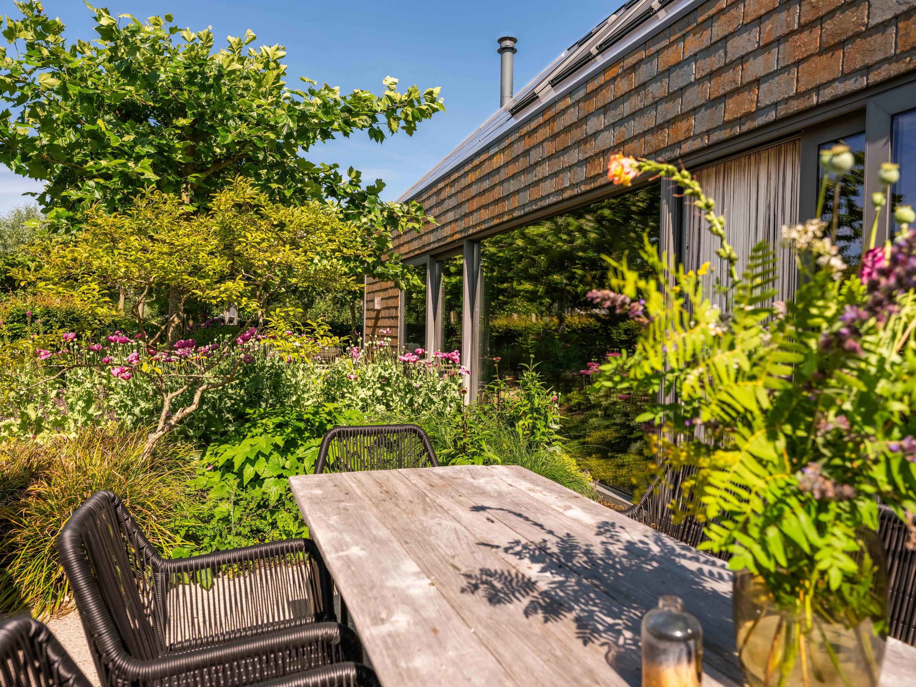 The garden is an oasis of peace and inspiration, with more than beautiful planting, several seating areas, a fantastic greenhouse, chickens, sunny and shady spots and stunning views. A greenhouse is directly linked to the beautifully landscaped kitchen garden. Chickens and a fruit garden complete the picture.