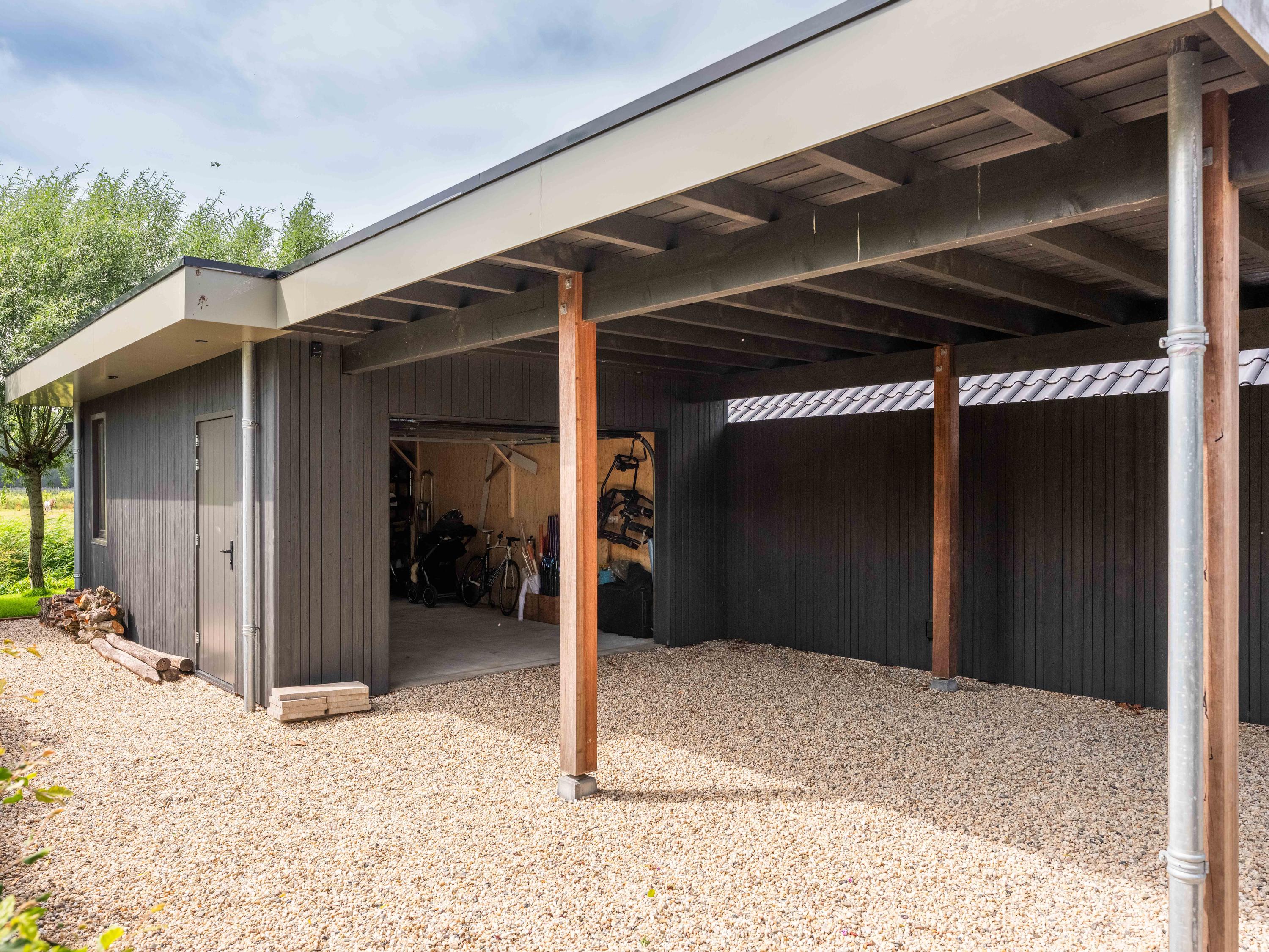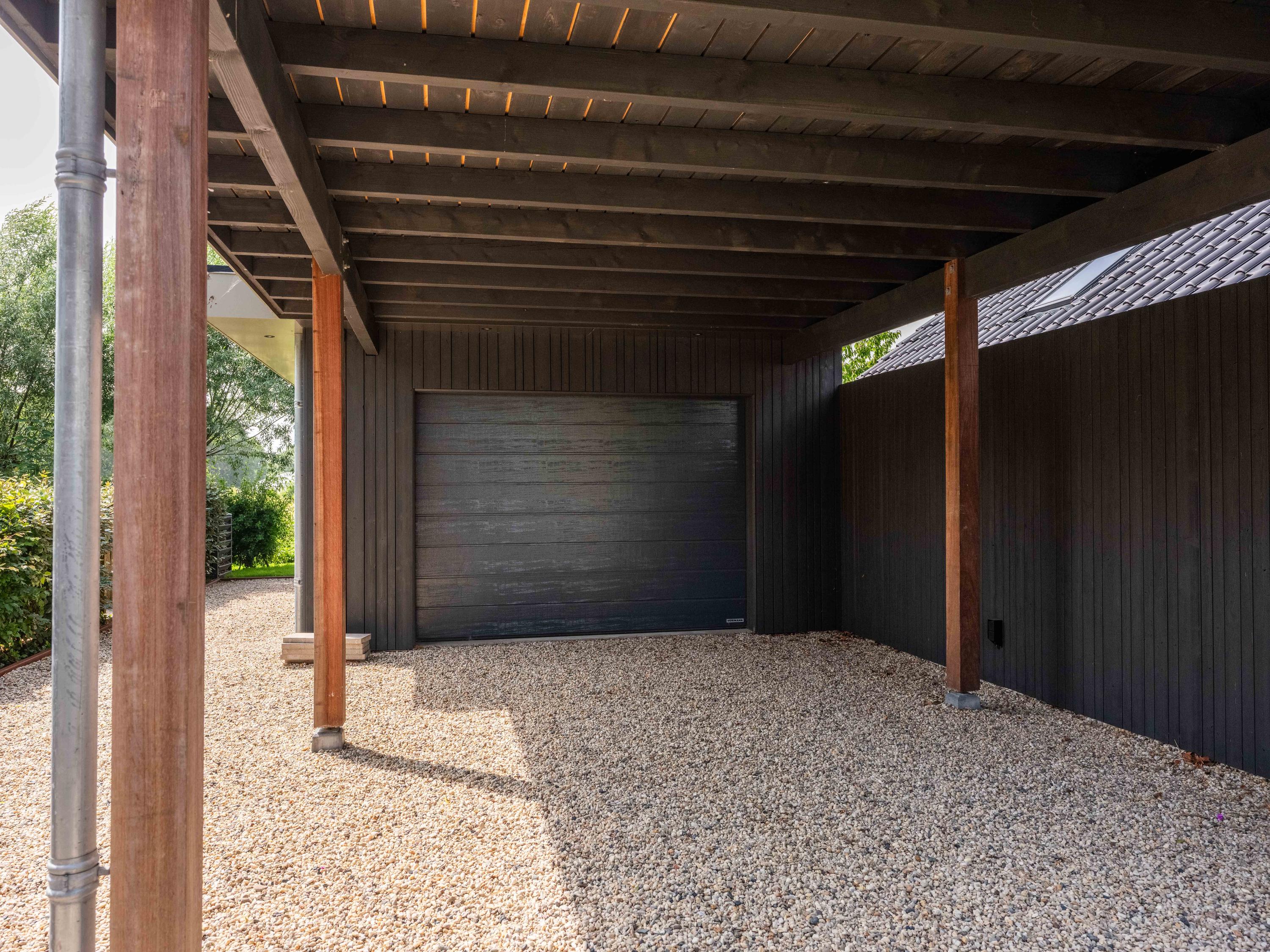 The detached garage with covered carport offers ample space for the car and/or other means of transport, but can also serve as a fine workshop. Several cars can easily be parked on the private property.