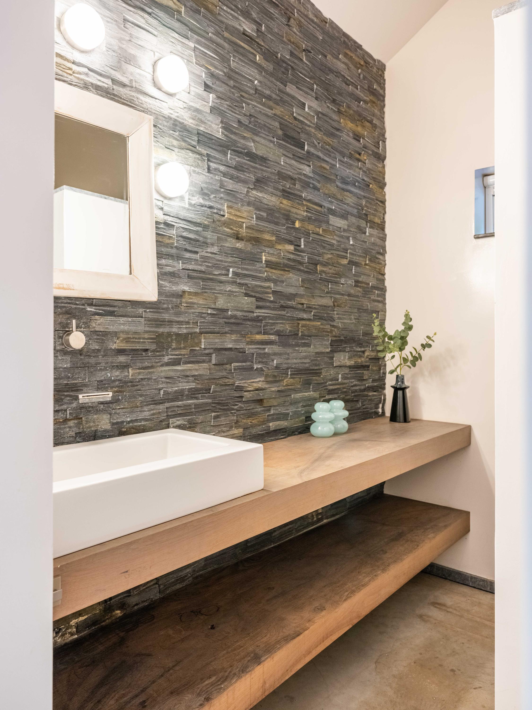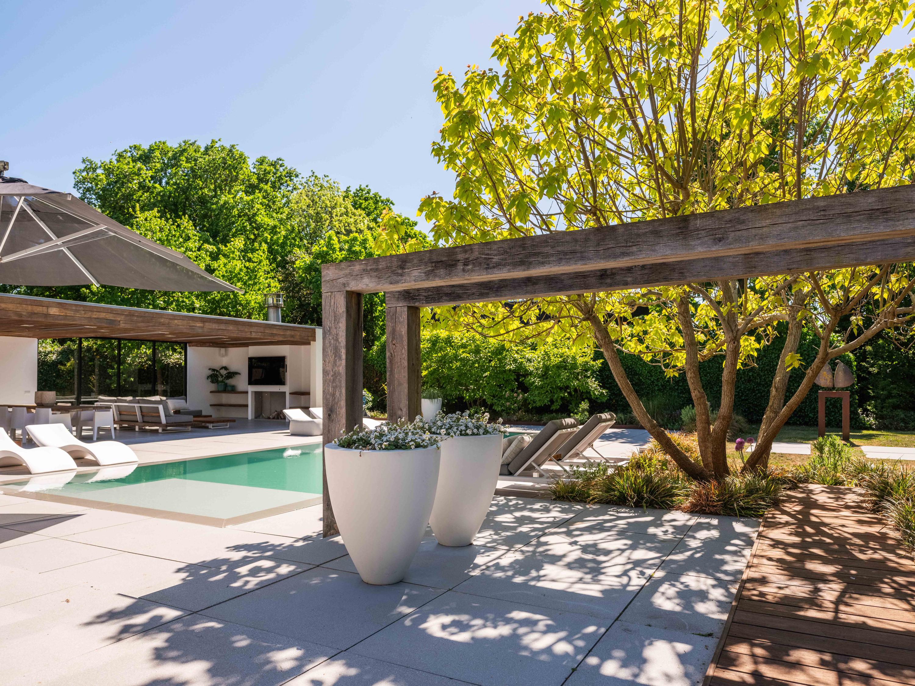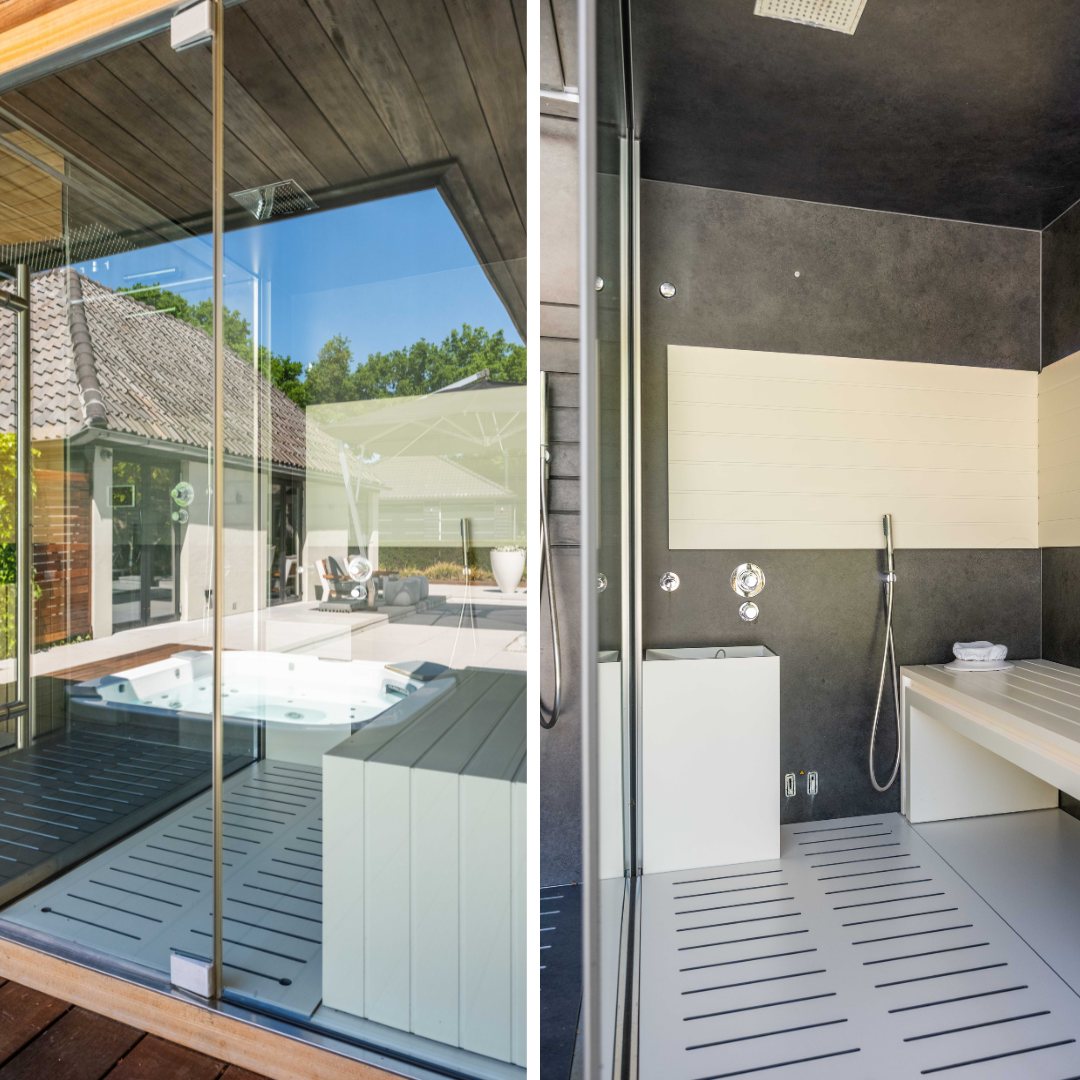 Also from the living room, there are passages to a separate toilet, several storage rooms and the master bedroom in the adjacent wing. This bedroom has a spacious walk-in wardrobe and an open bathroom with double sinks. The bathroom has a spacious shower with seat and a toilet. The view from both the bedroom and the bathroom faces the pool, further emphasising the luxury of the property and creating a wellness experience.