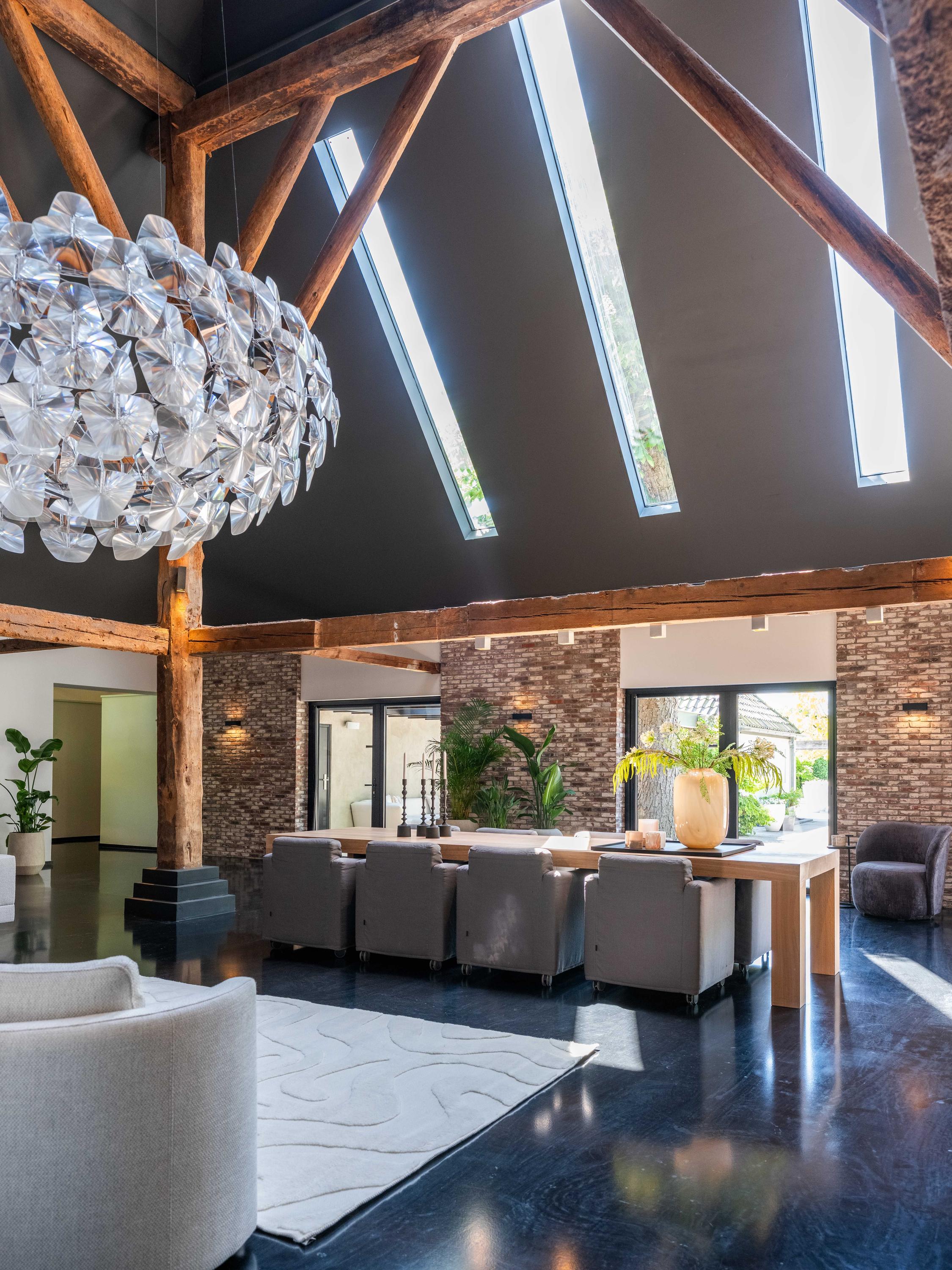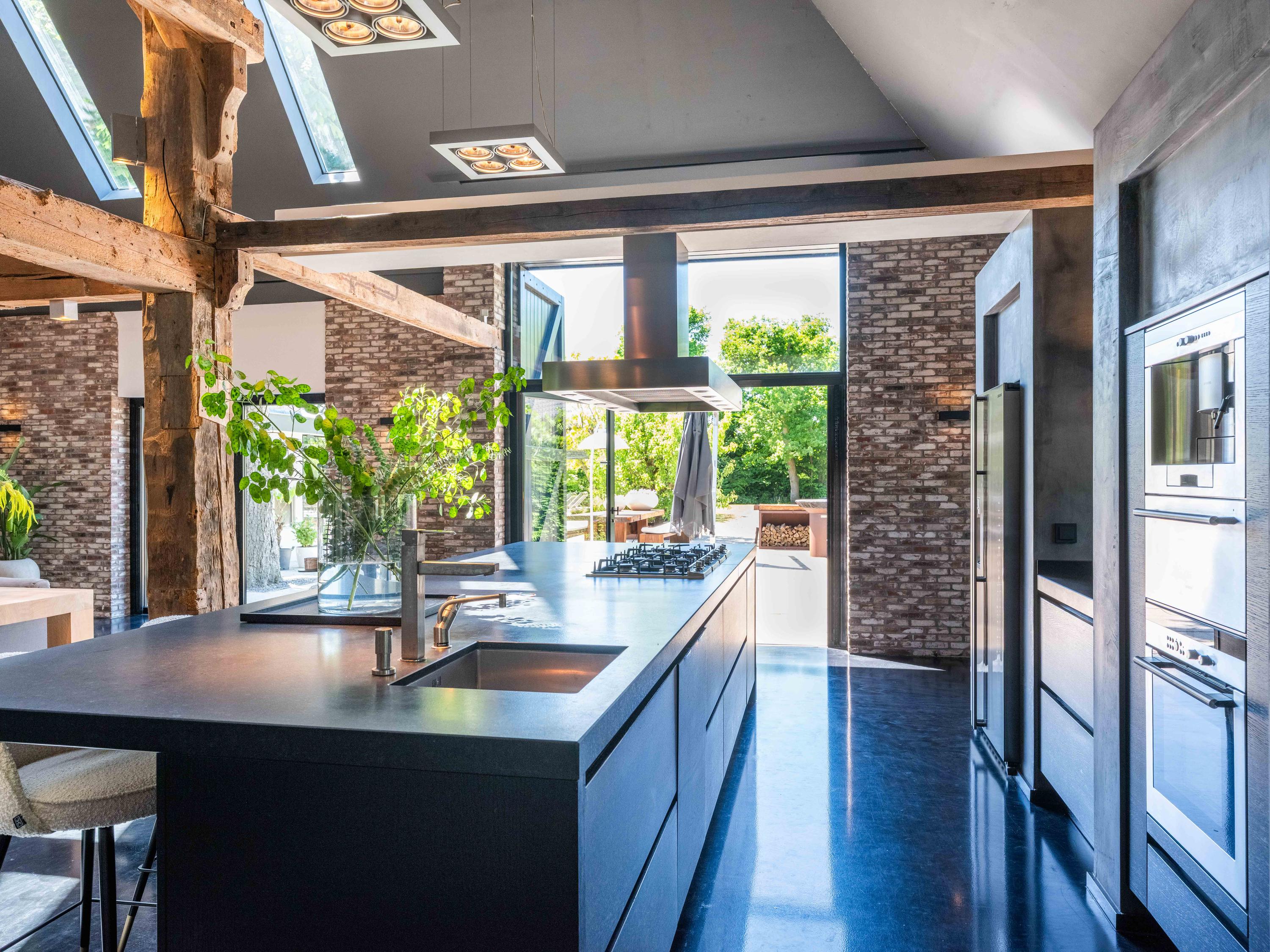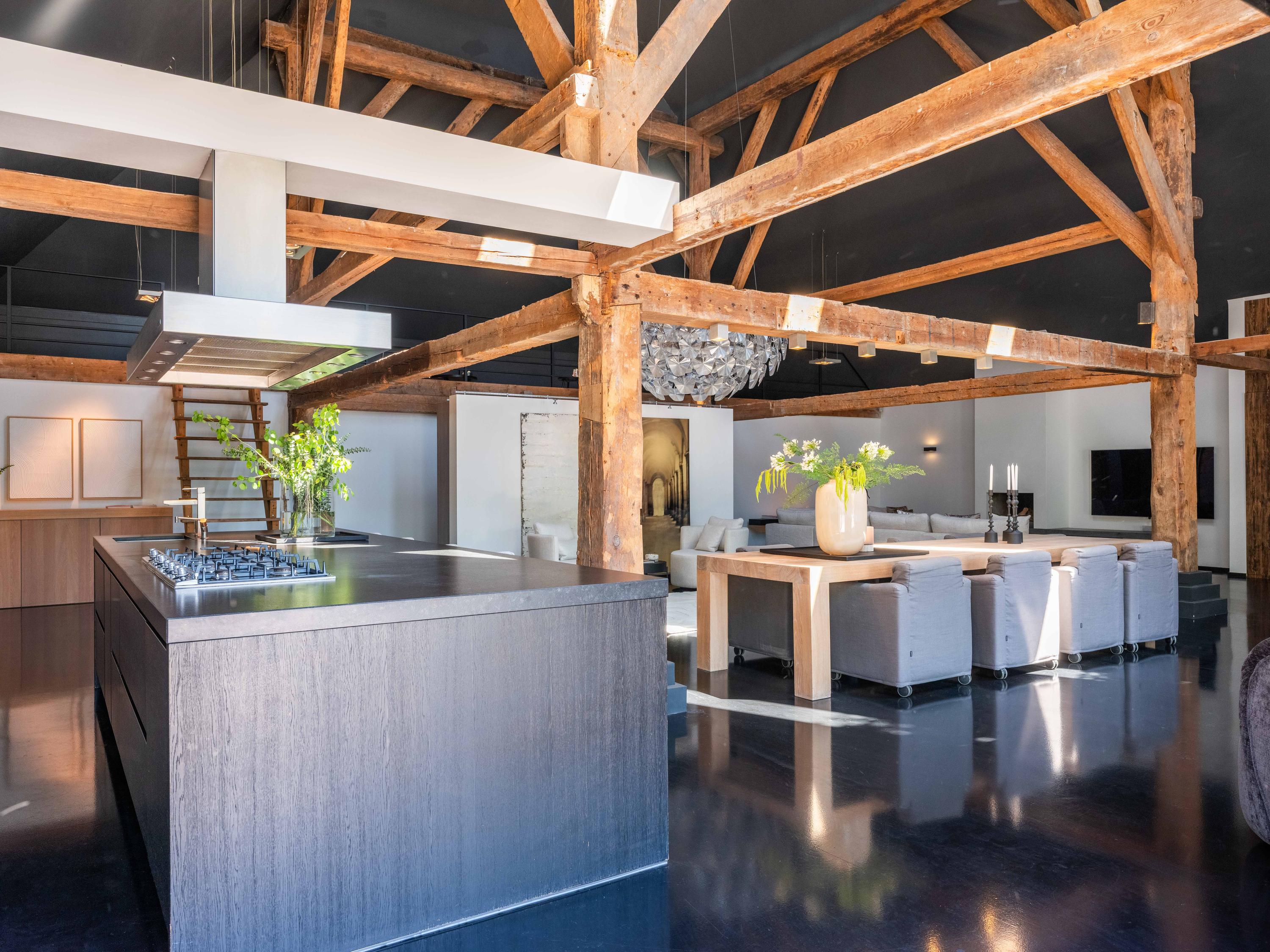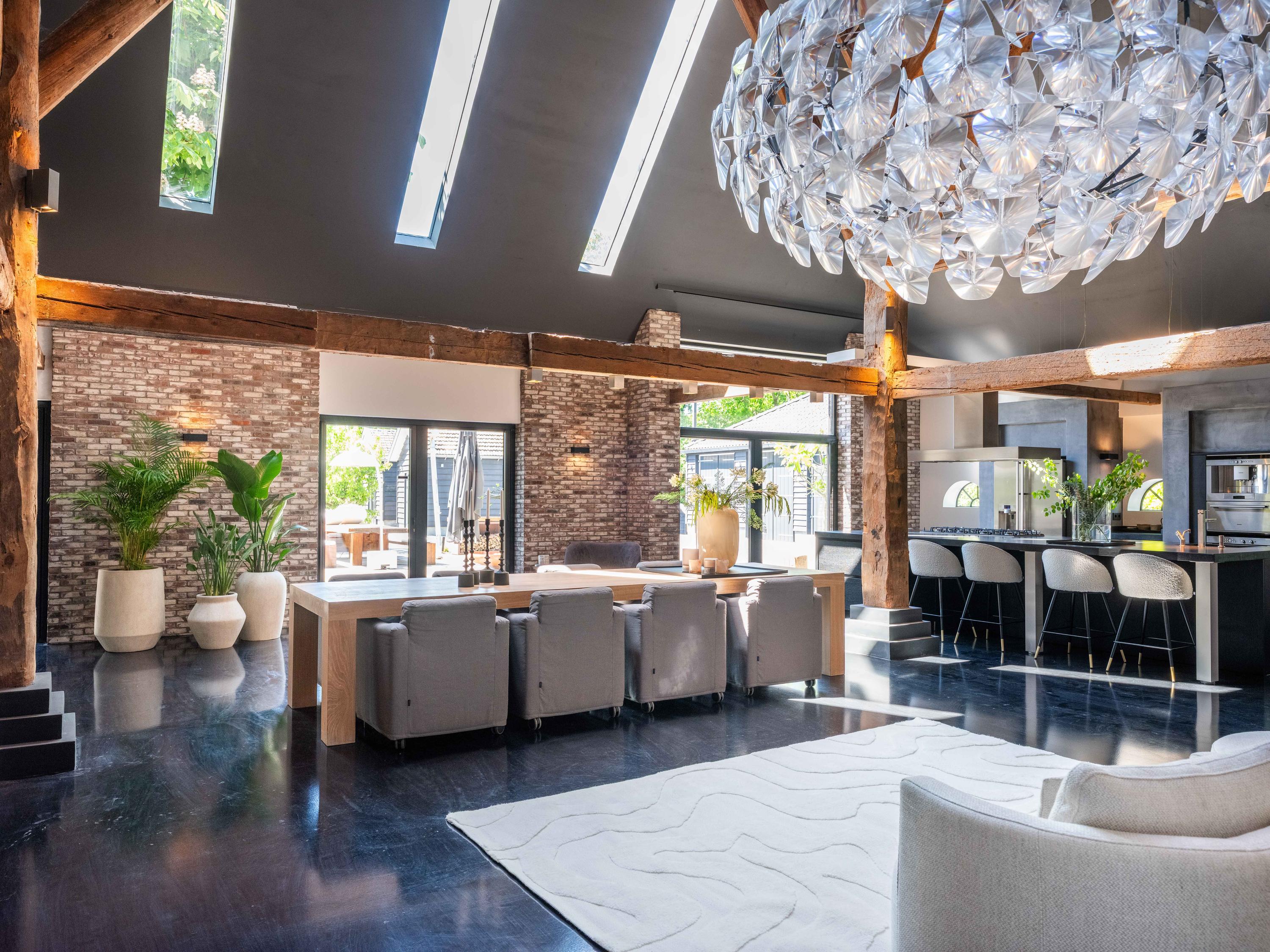 The living room where the ceiling, which reaches to the ridge, immediately catches the eye. The contrast of colours in the house enhance its sturdy character. This very spacious living room has a fireplace and French doors to the garden. The modern open kitchen is equipped with various built-in appliances, including a Boretti 8-burner cooker, an American fridge with coffee maker and plate warmer, oven, built-in fridge and dishwasher.