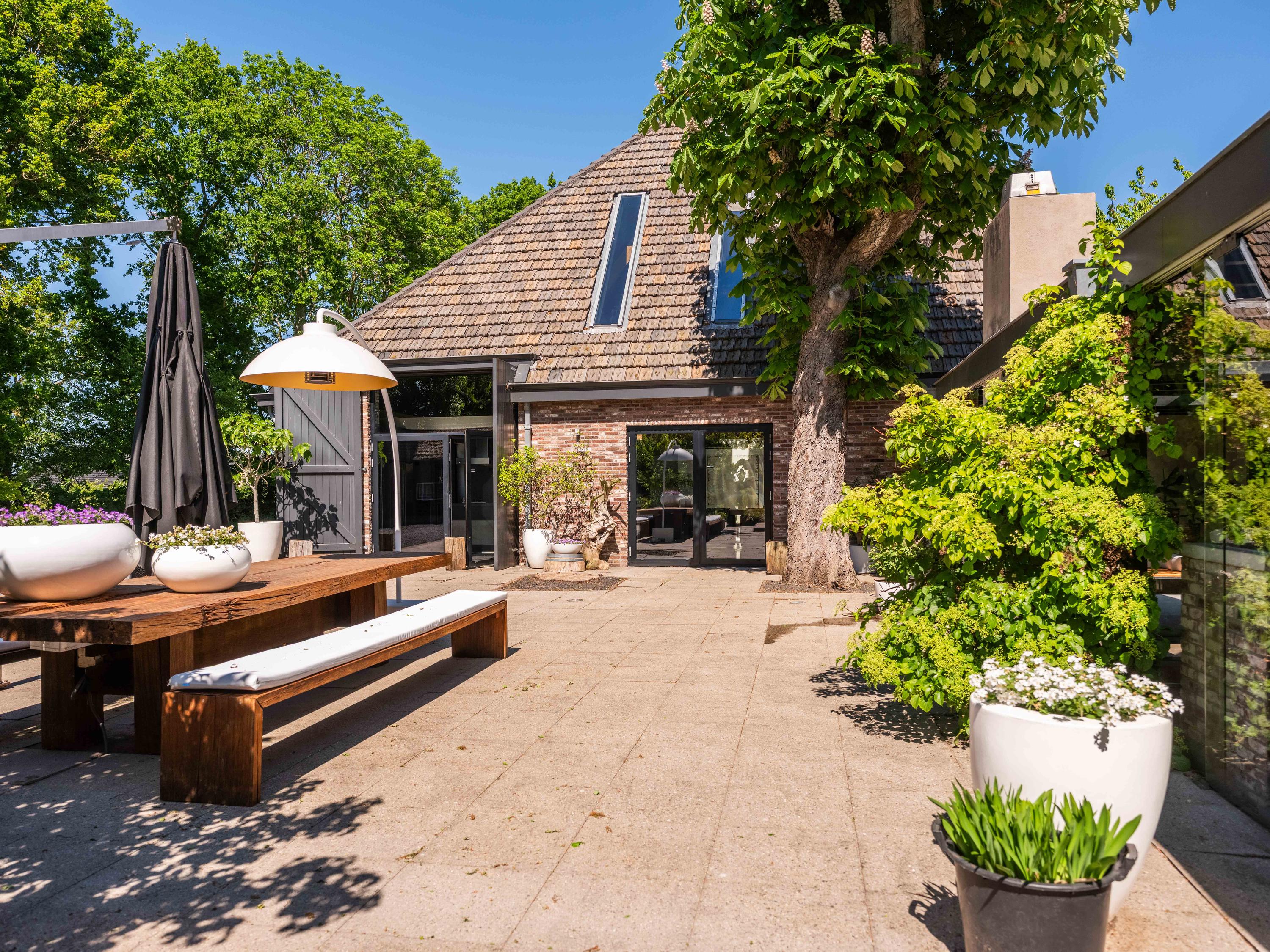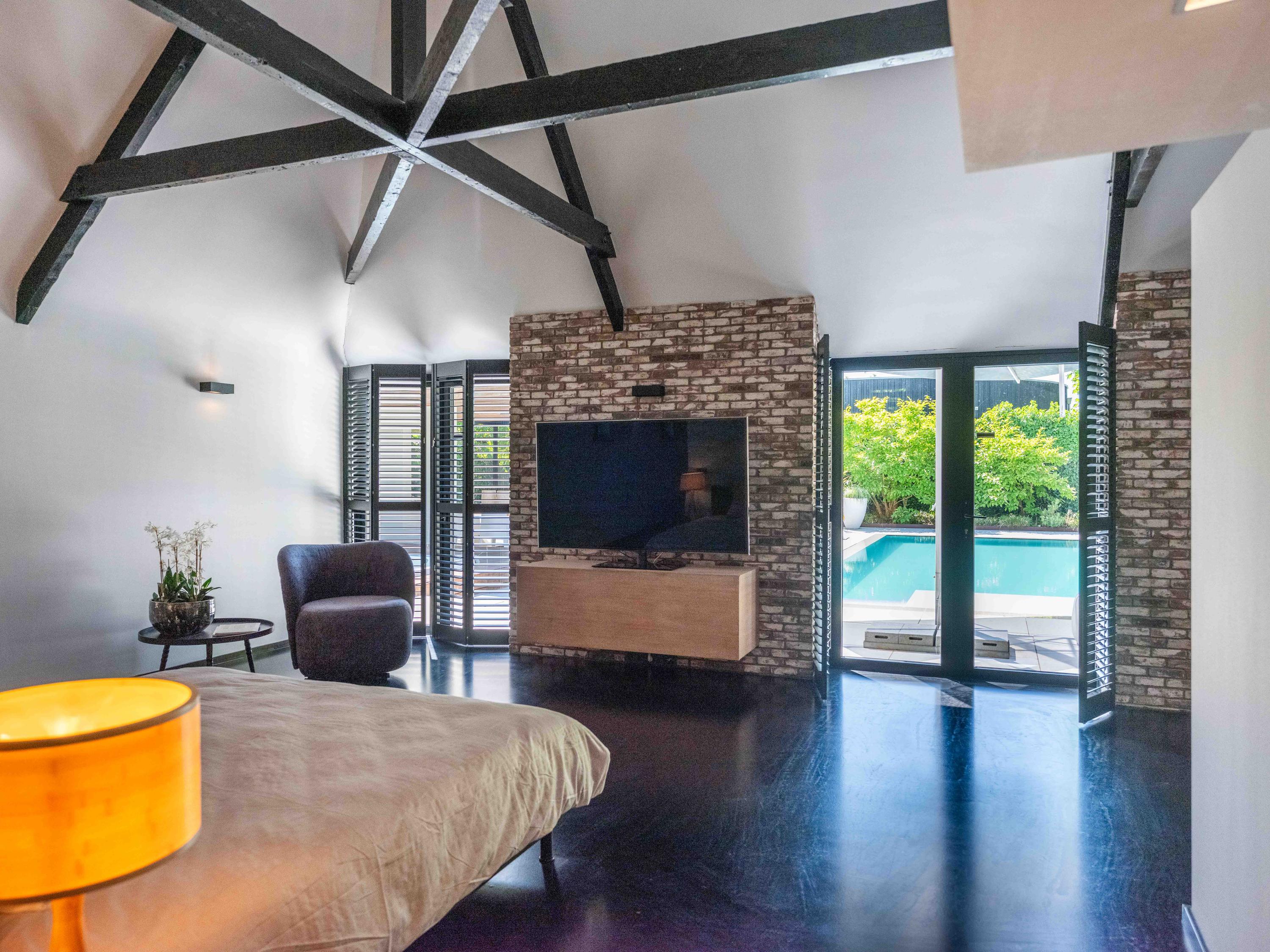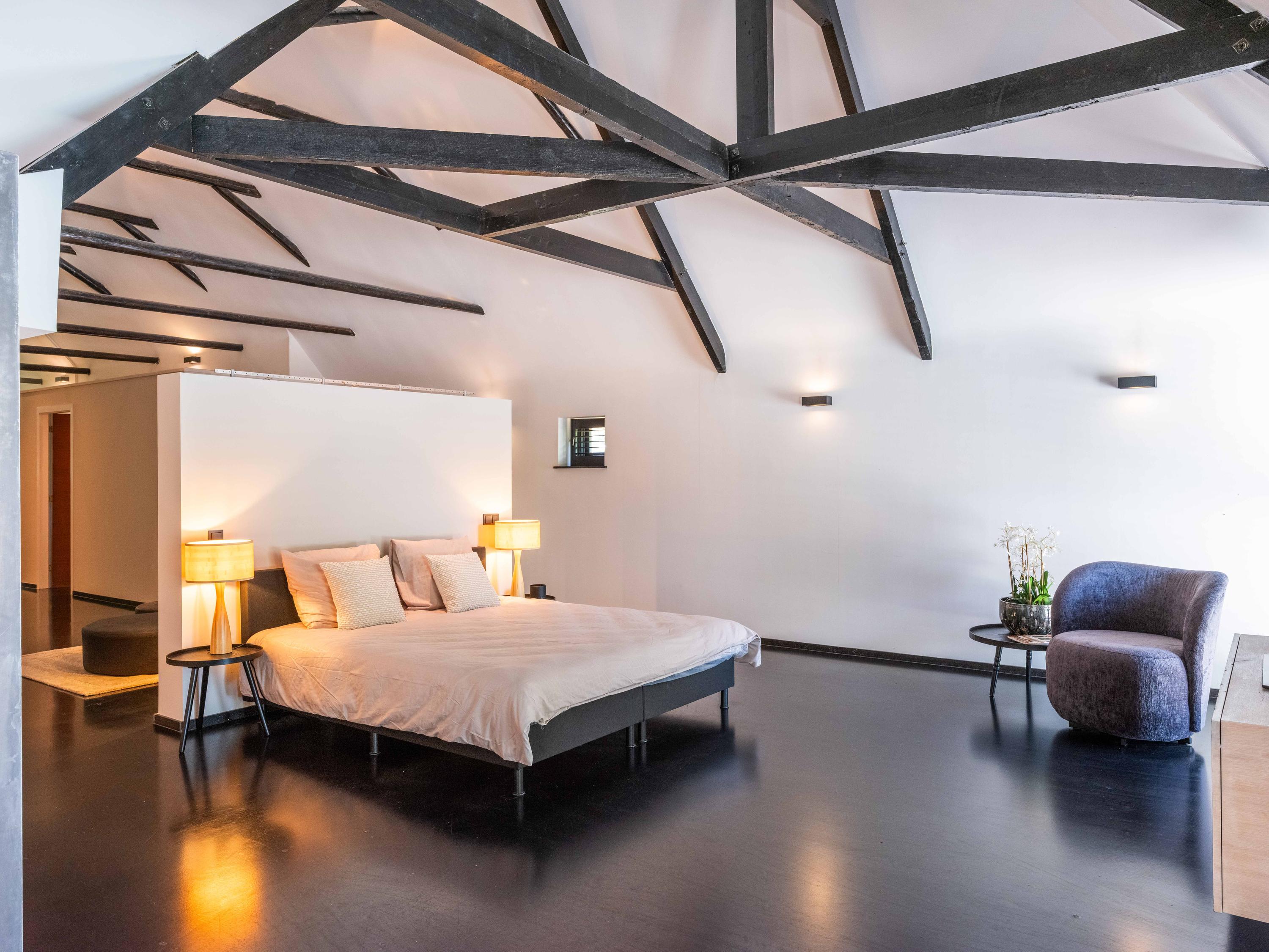 The living room where the ceiling, which reaches to the ridge, immediately catches the eye. The contrast of colours in the house enhance its sturdy character. This very spacious living room has a fireplace and French doors to the garden. The modern open kitchen is equipped with various built-in appliances, including a Boretti 8-burner cooker, an American fridge with coffee maker and plate warmer, oven, built-in fridge and dishwasher.